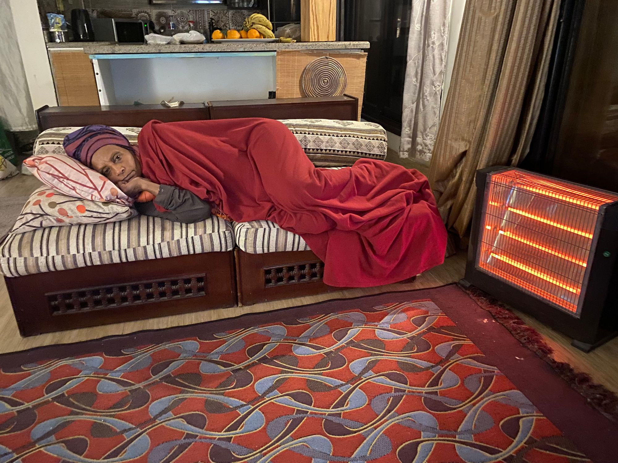 after a long day on her feet, Mona at home, TV on and heater at full blast | New Cairo