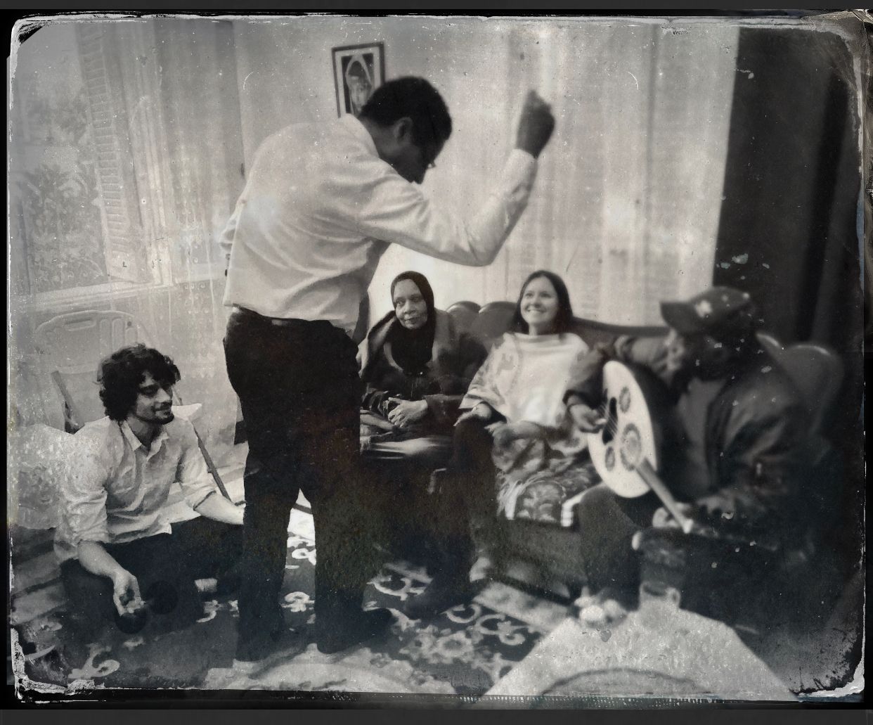Daoud (2L) uses a serving tray as an instrument as the family dances with linked arms to one of Karam's songs