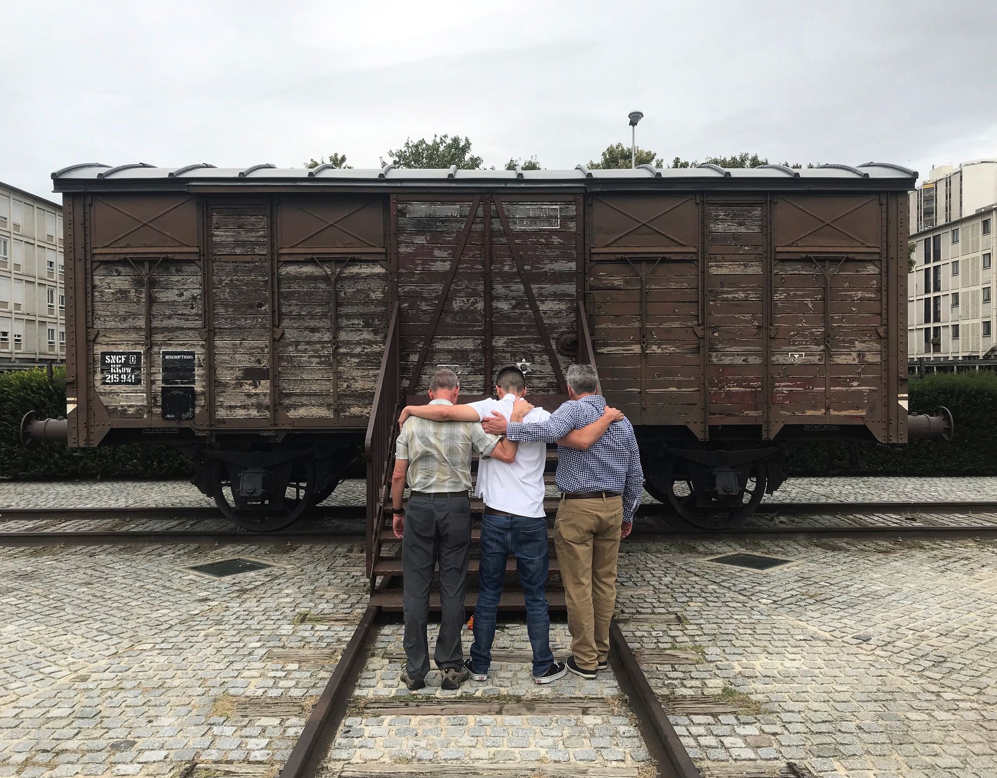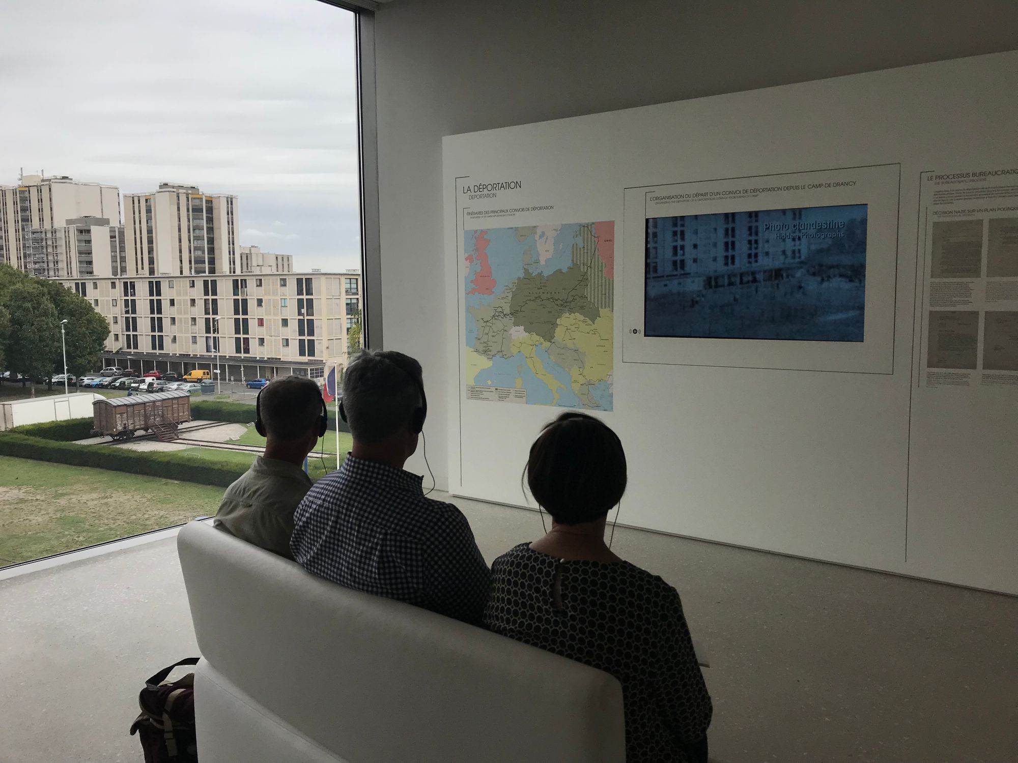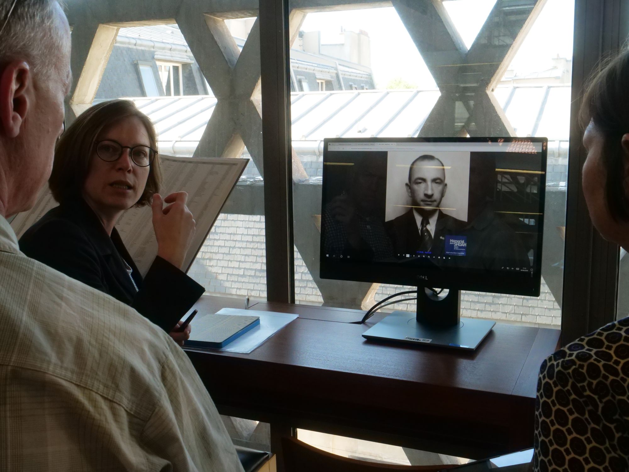 After a long day and as the sun set we traveled to Paris where we met with archivists at the Foundation de la Shoah and the French National Archives. Al, his brother and his nephew paid tribute to their relatives at the Drancy deportation center where, in September 1942, they were put in cattle cars and sent to Auschwitz. The Drancy Museum overlooks what-was-once the internment-transit compound which still exists and is now a low income housing complex primarily occupied by immigrants.