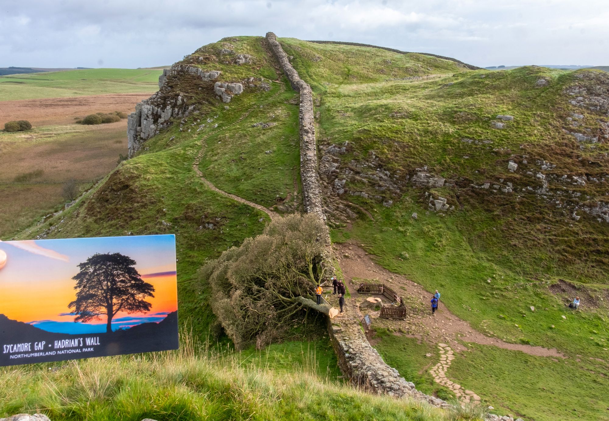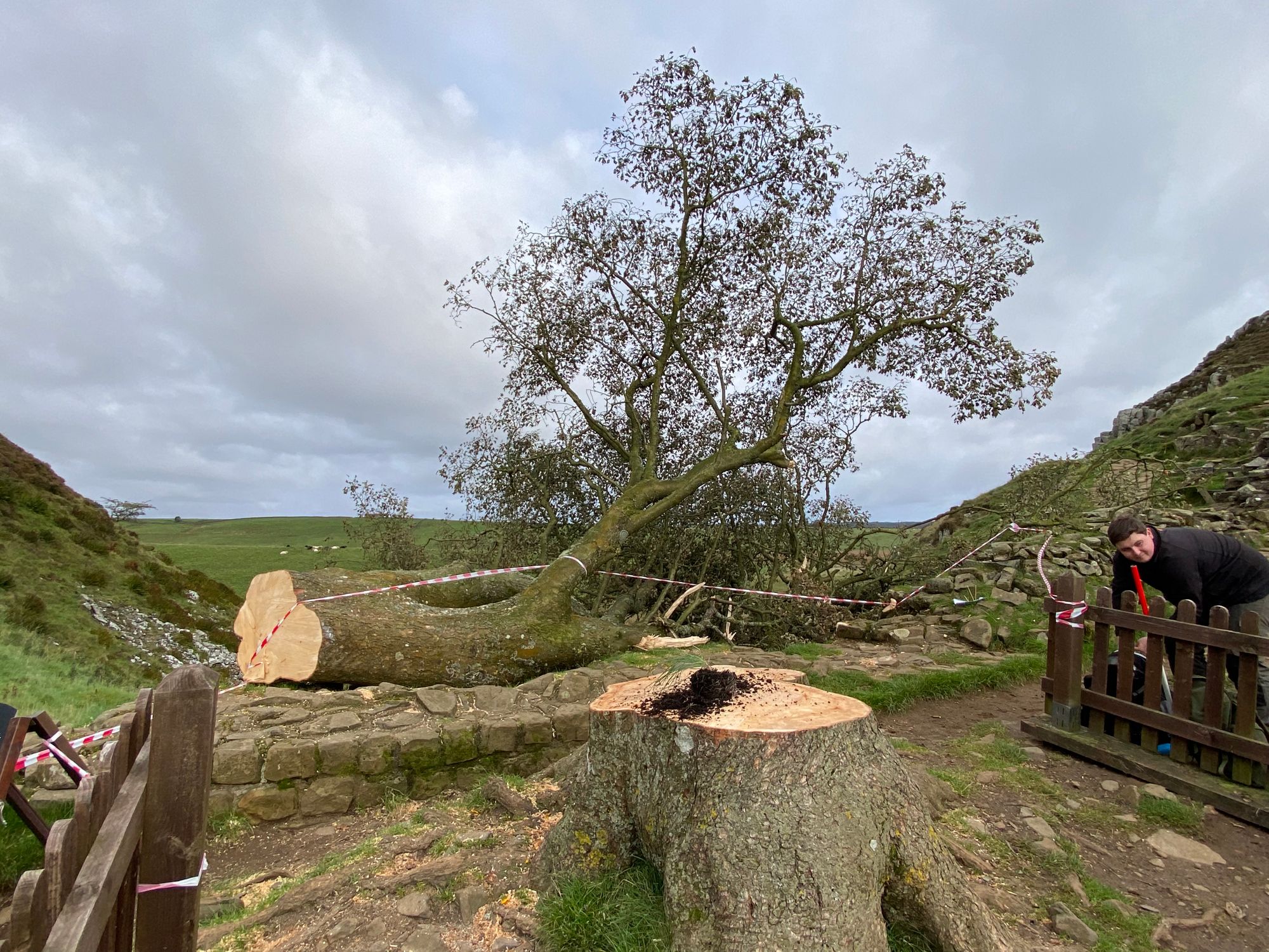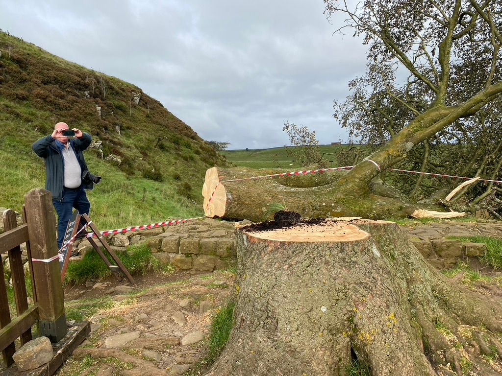 The felled Sycamore Gap Tree | Evening Chronicle photographer Iain Buist at the site where a seedling has been placed on the stump.