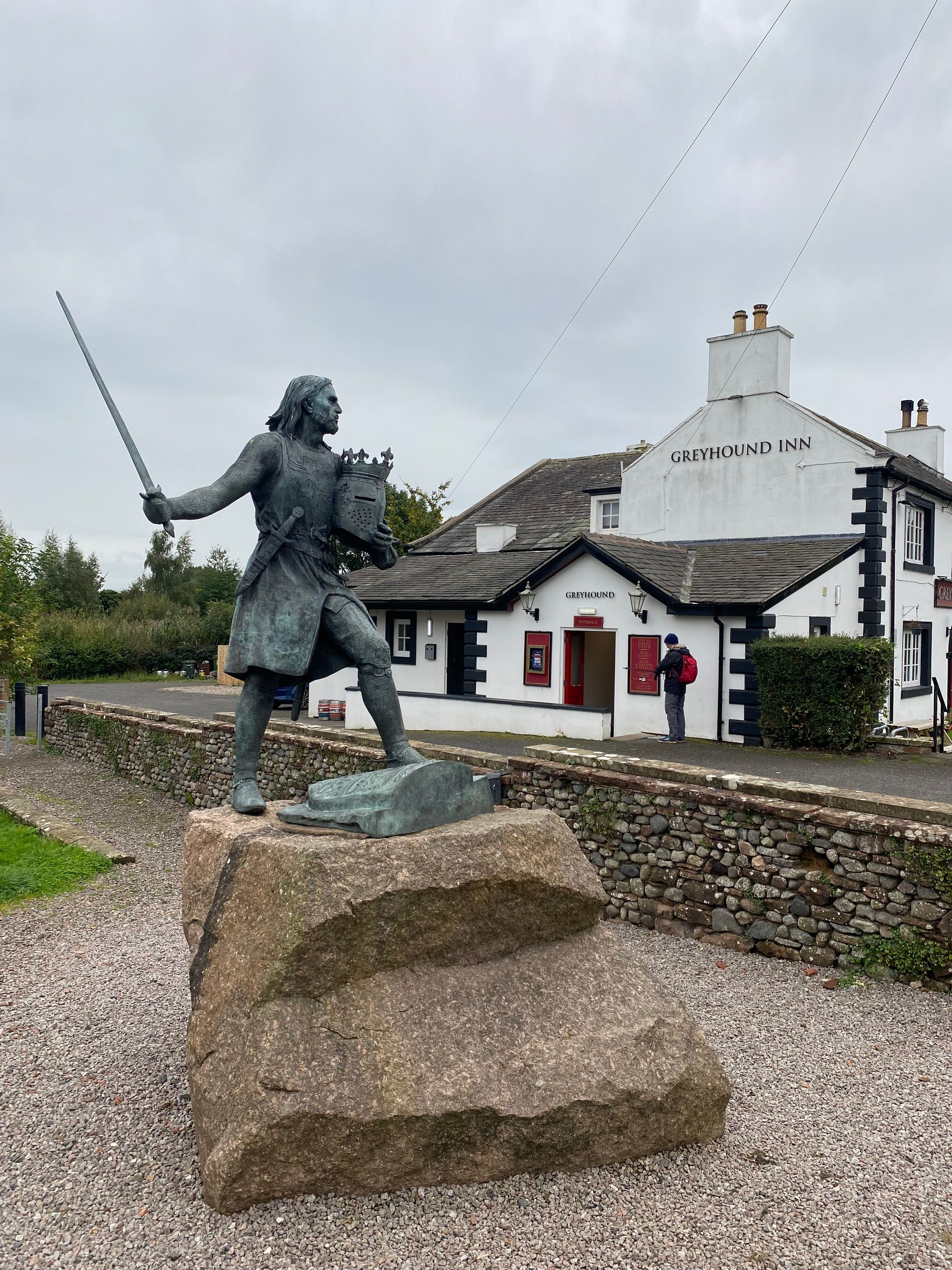 Statue of English King Edward I who died nearby on a campaign against Scotland in 1307 | another St. Michael's Church with pagan stone head near altar