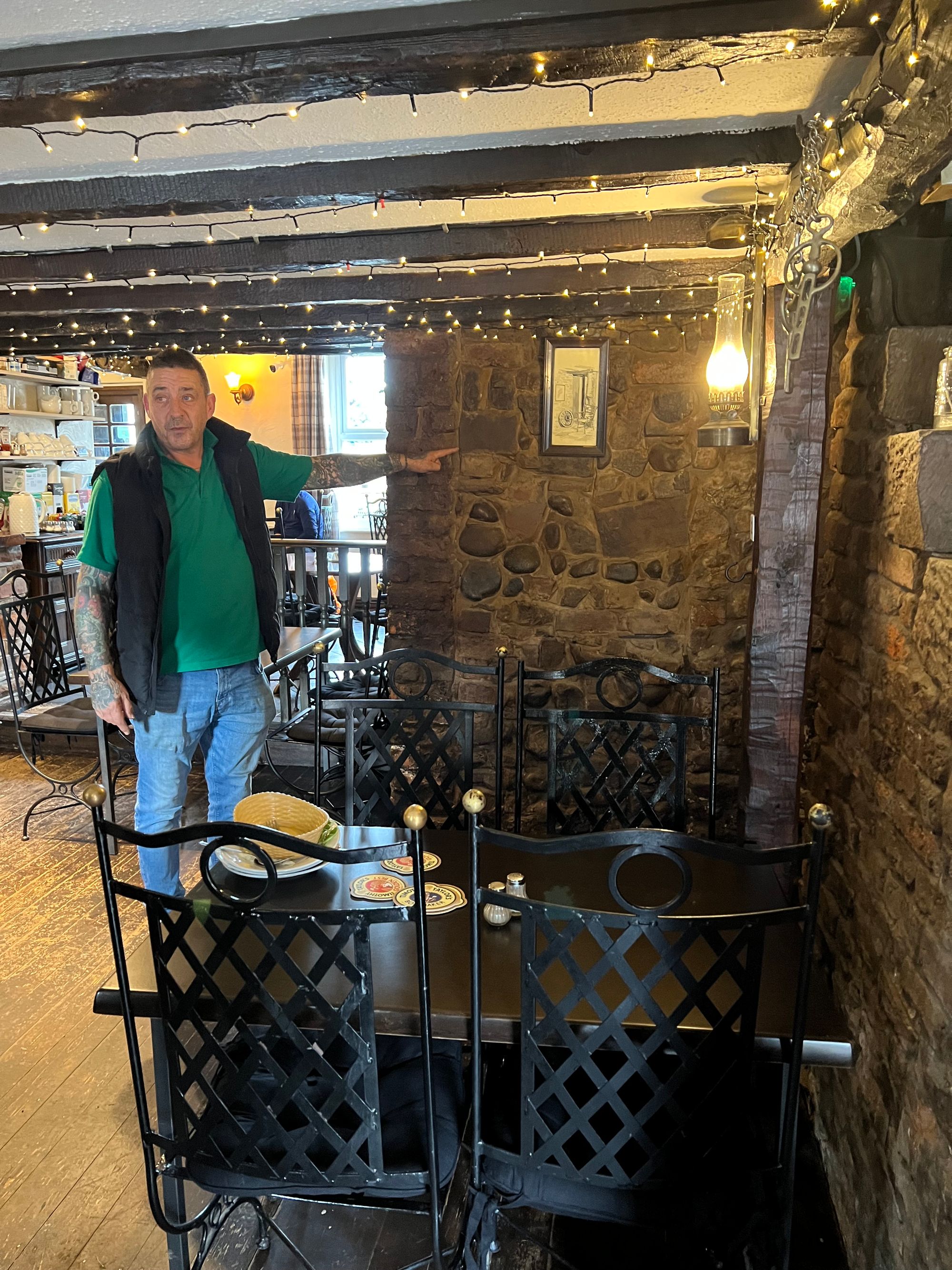 16th century pub owner, Dave, points to a haunted place at the Stag Inn | St. John's Church grave | the path