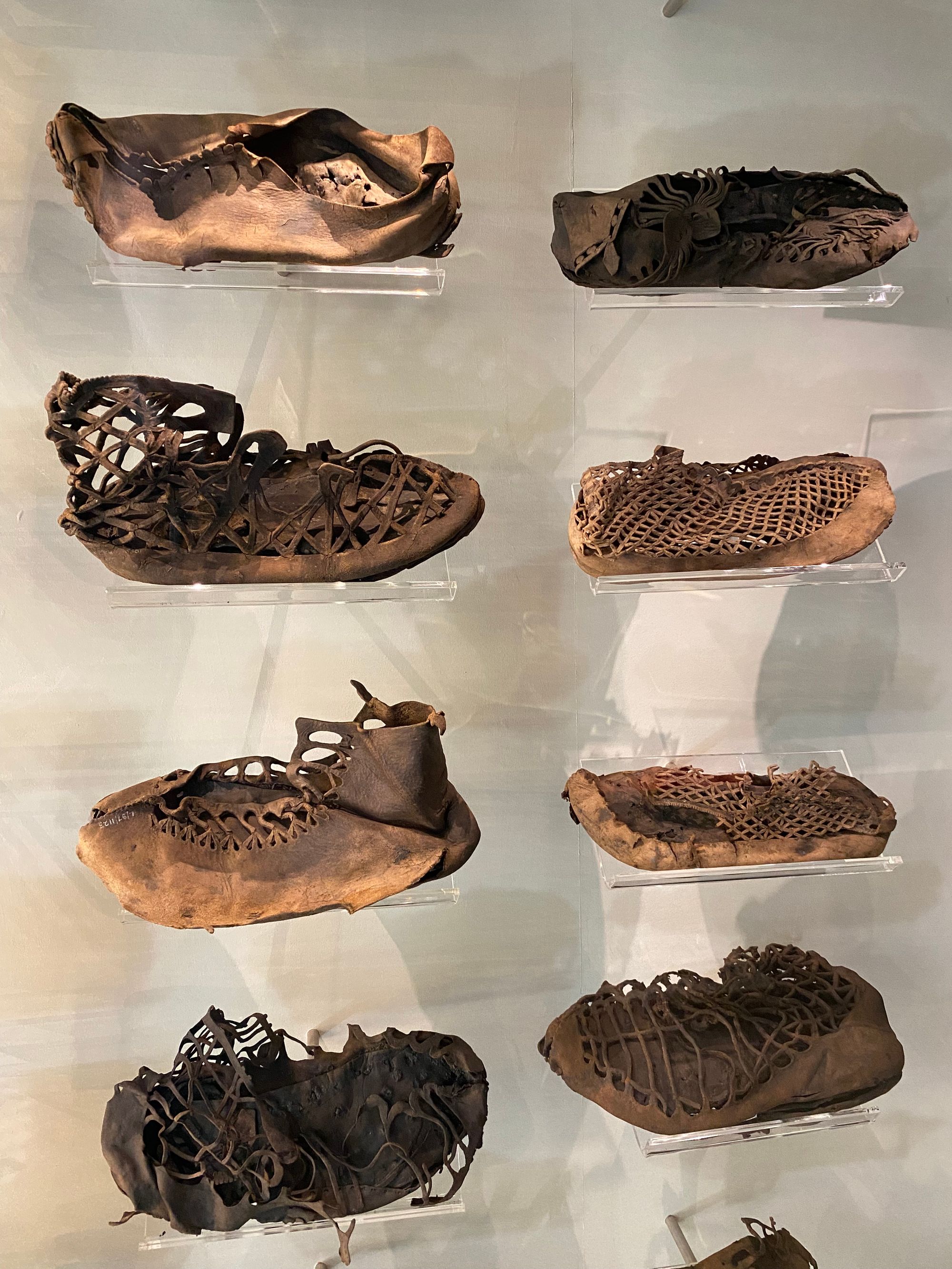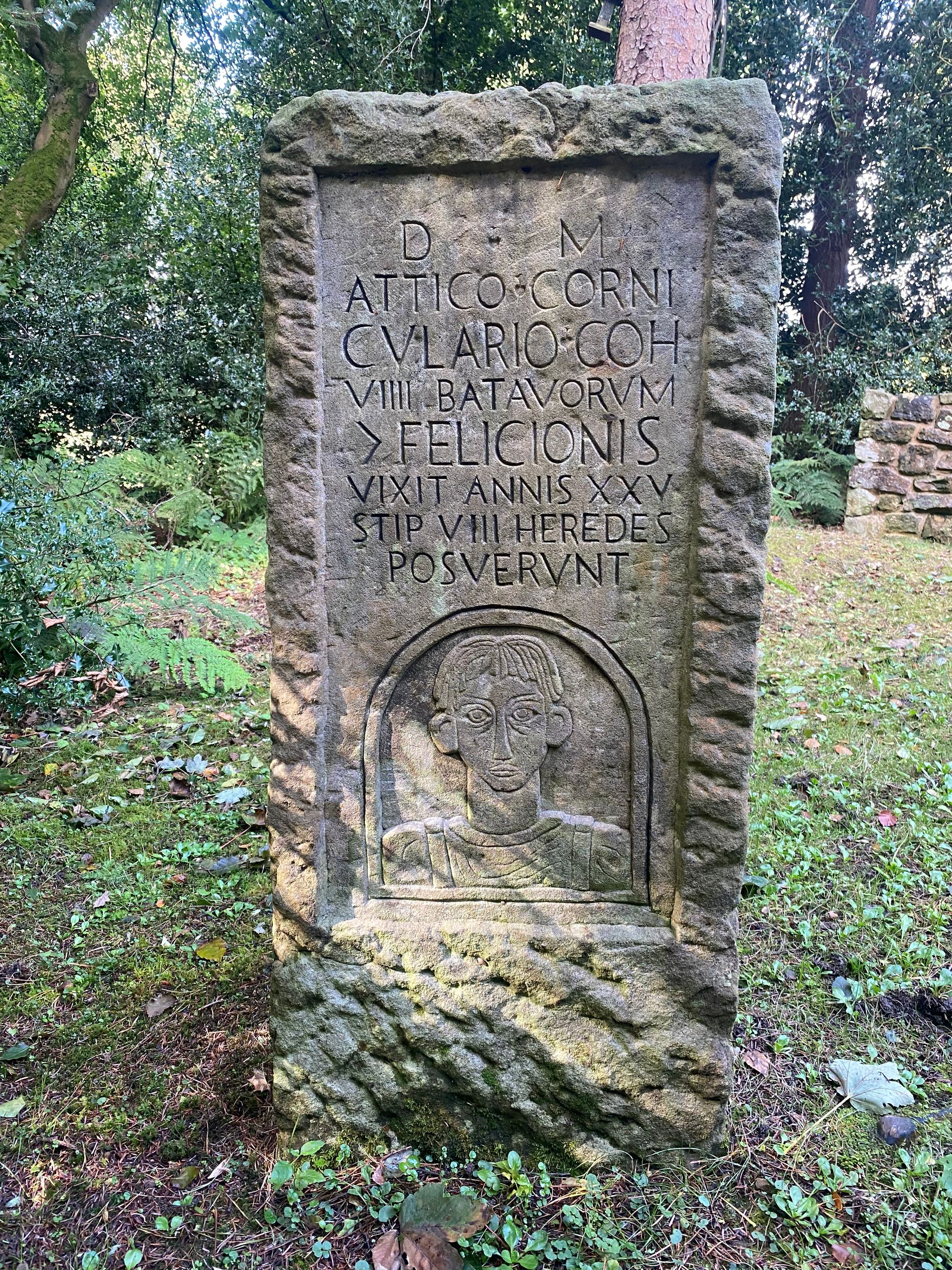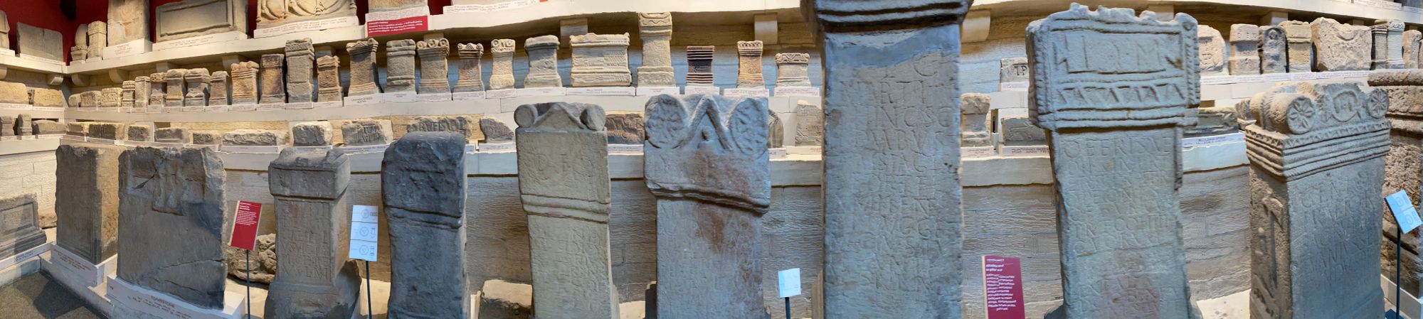 Artifacts and replicas | a grave stone in Latin | a dedication to the nymphs from a follower - English translation | an authentic statue | a modern monument commemorating those legionaries who perished on the frontier | shoes found during excavations