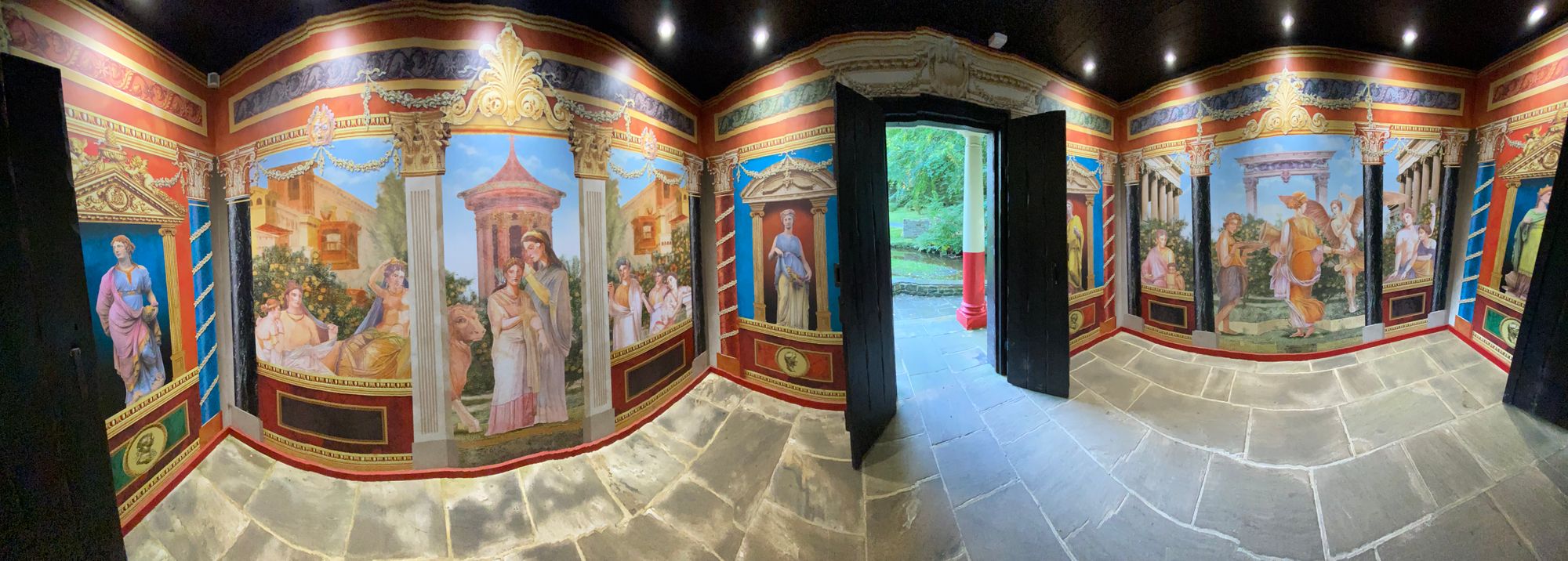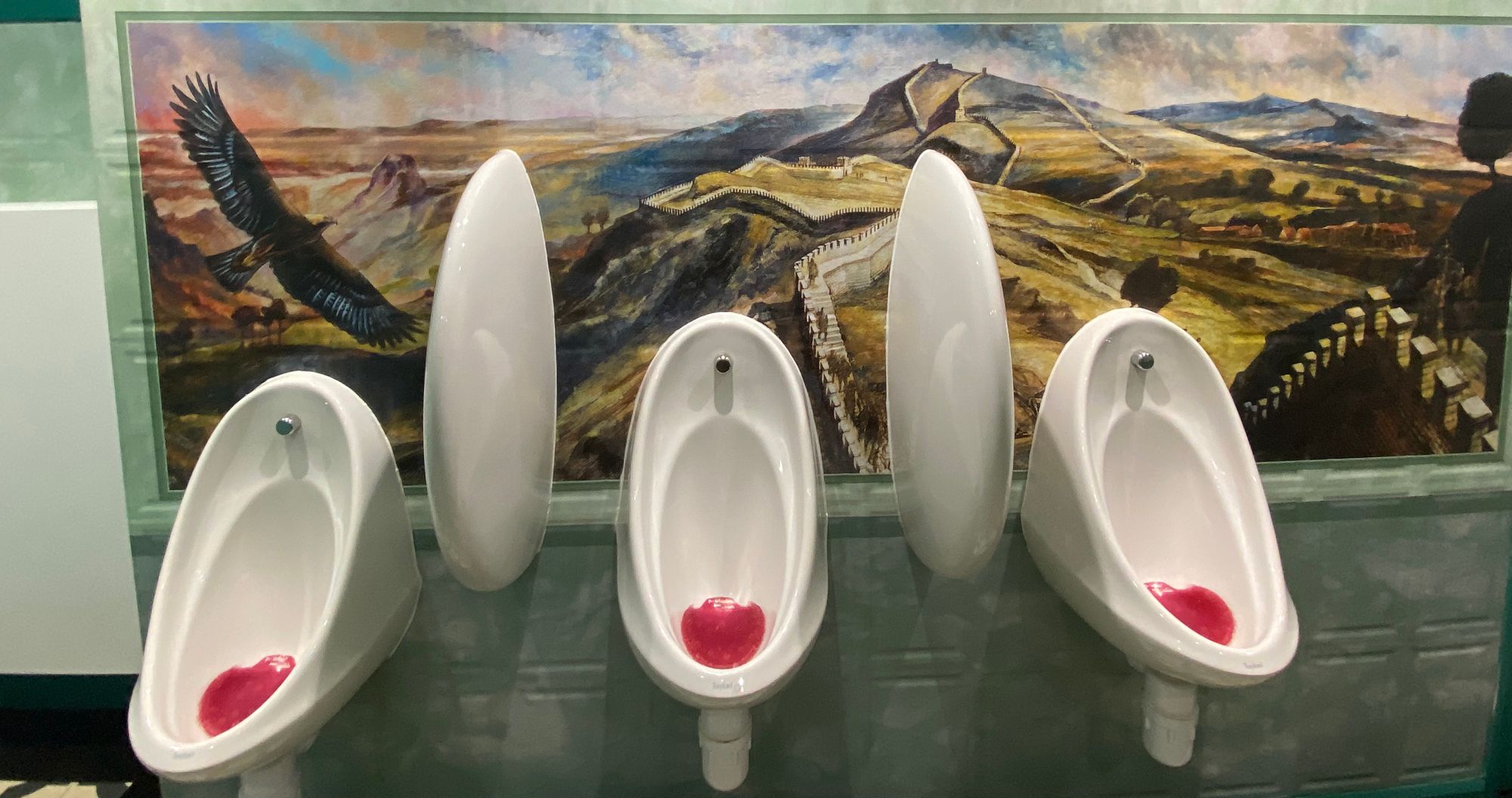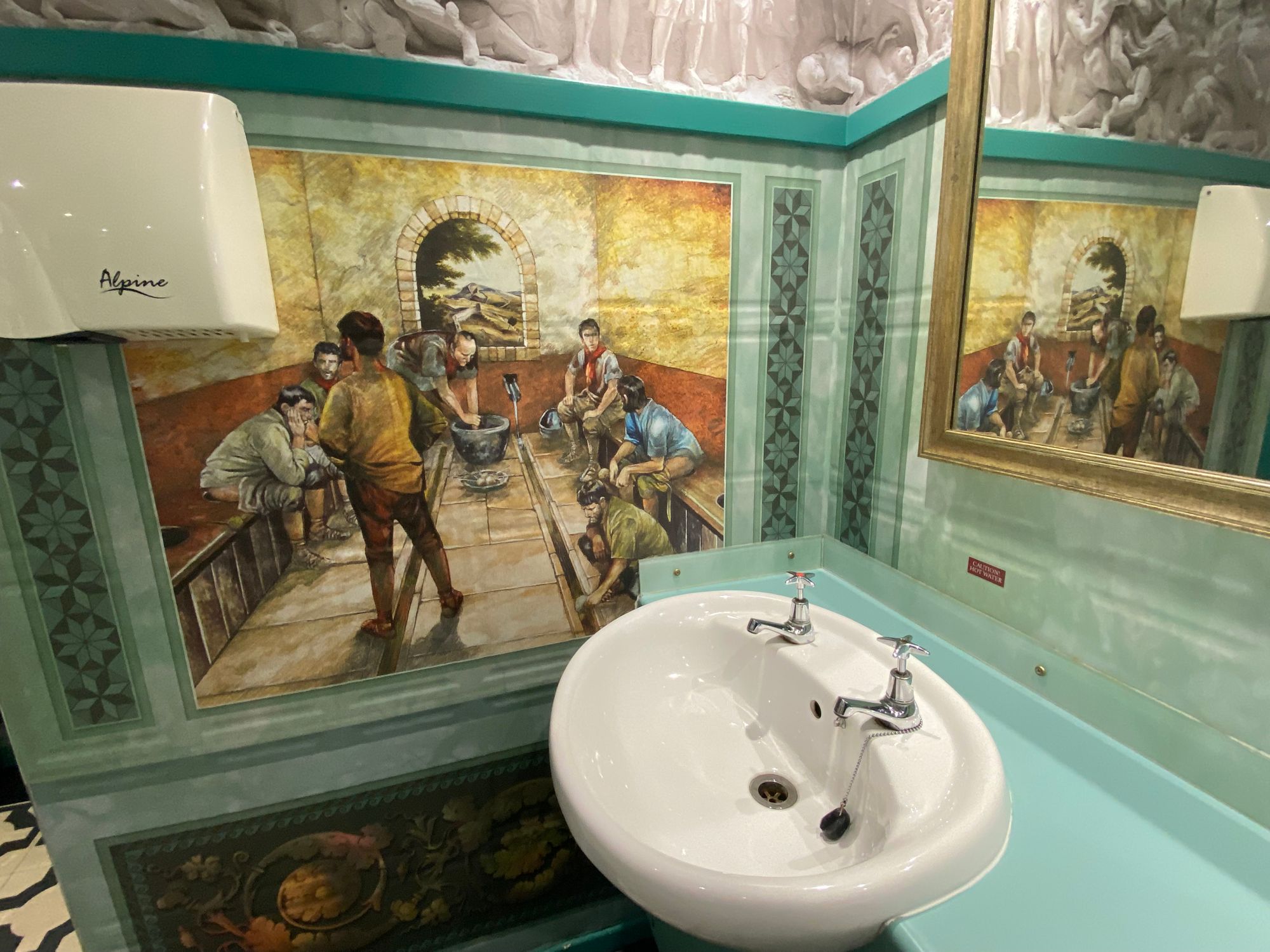 Elaborate murals and humorous art in the men's room displaying a depiction of the wall | Roman bathhouse toilet | Roman bathroom graffiti