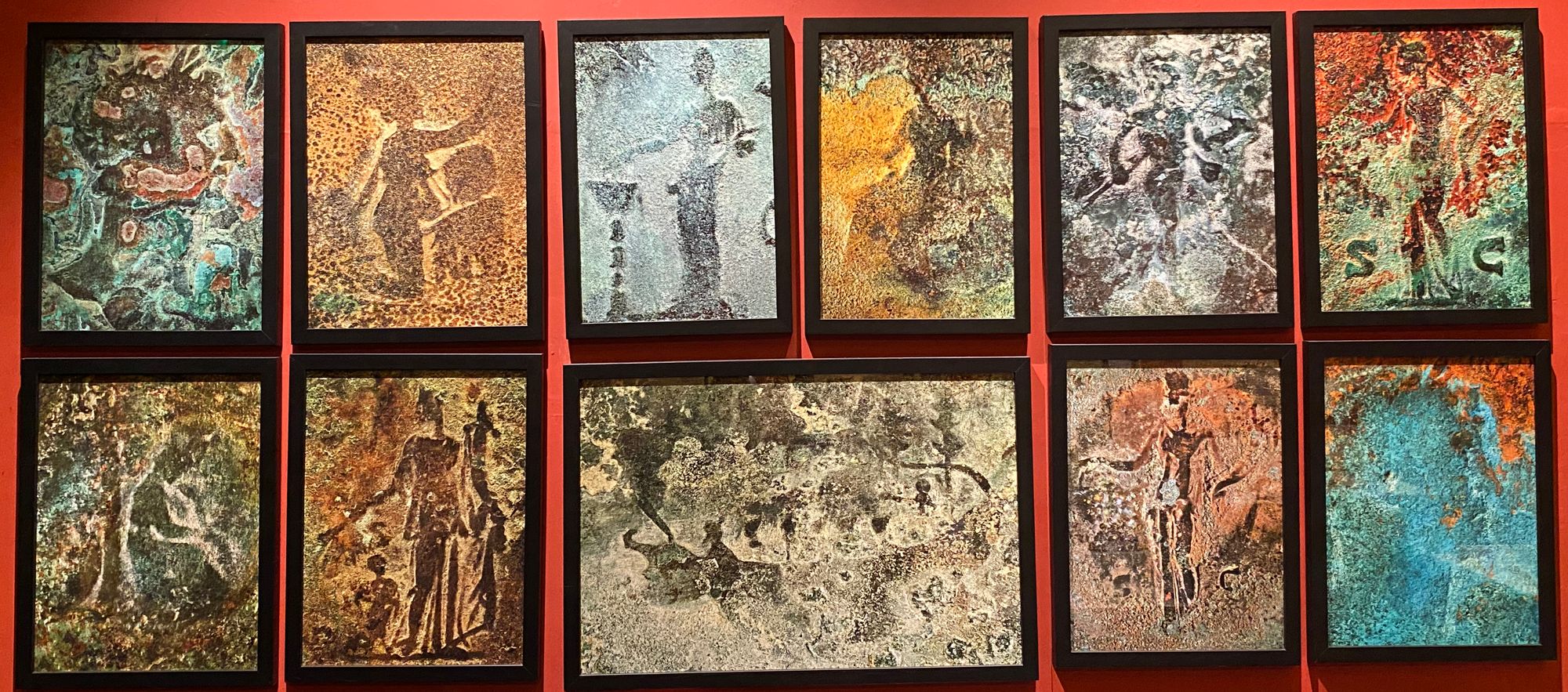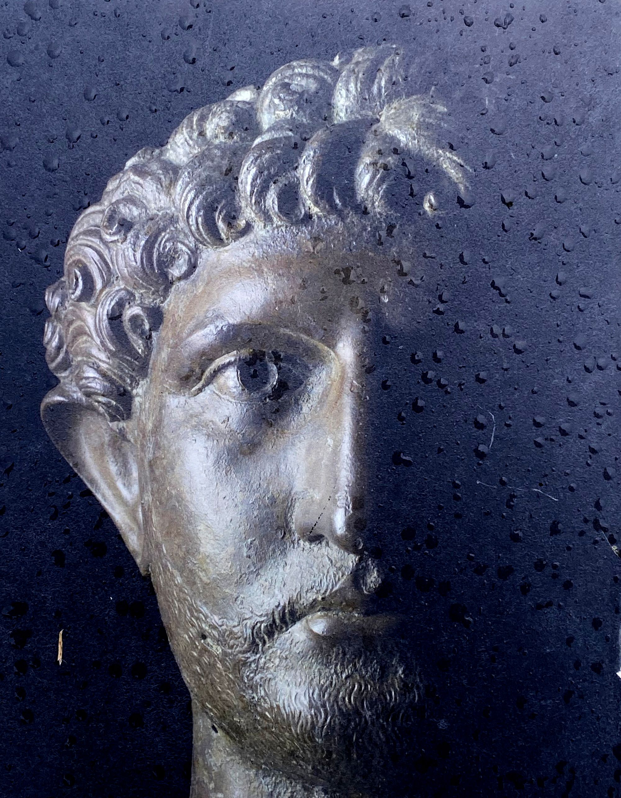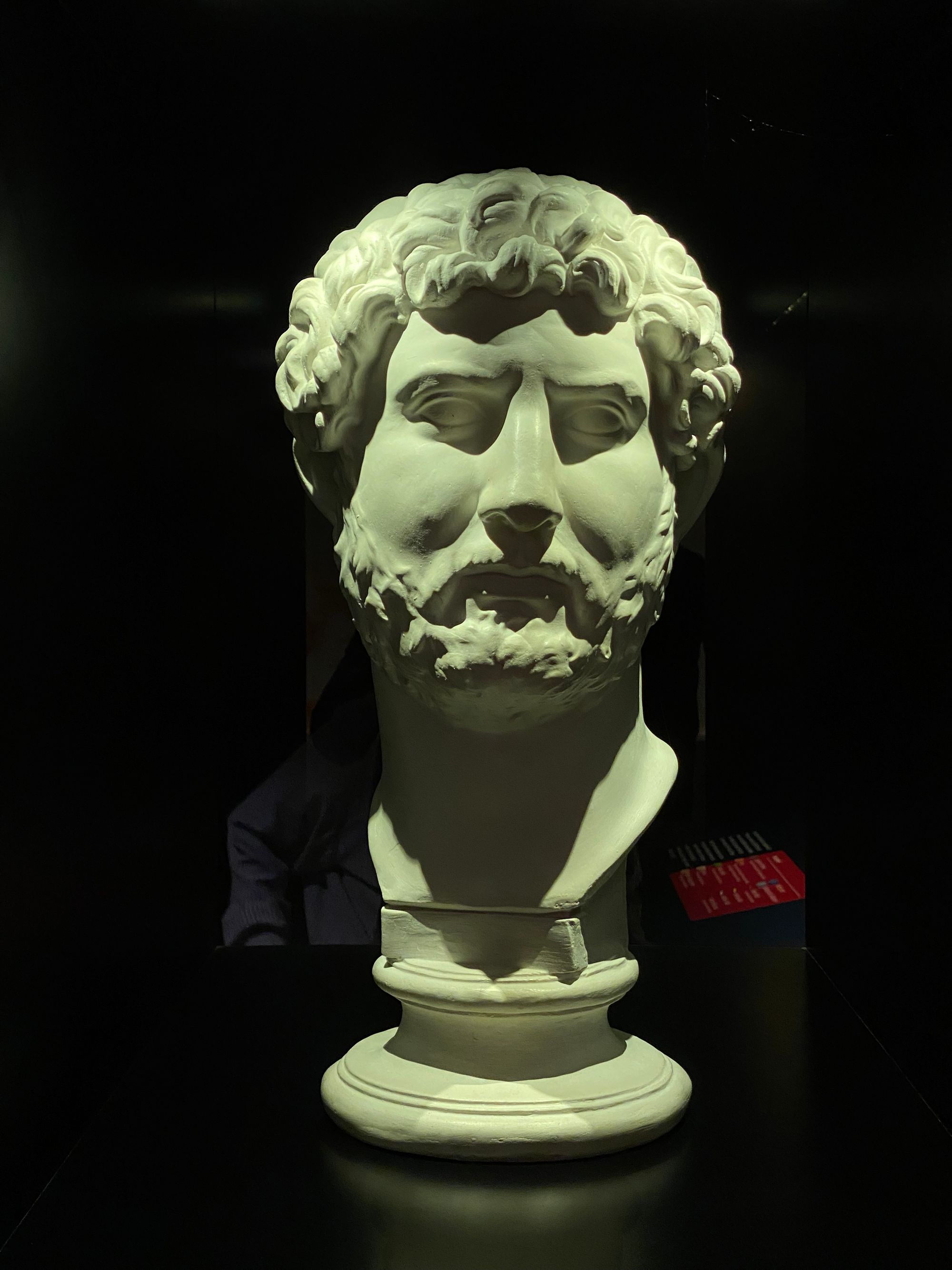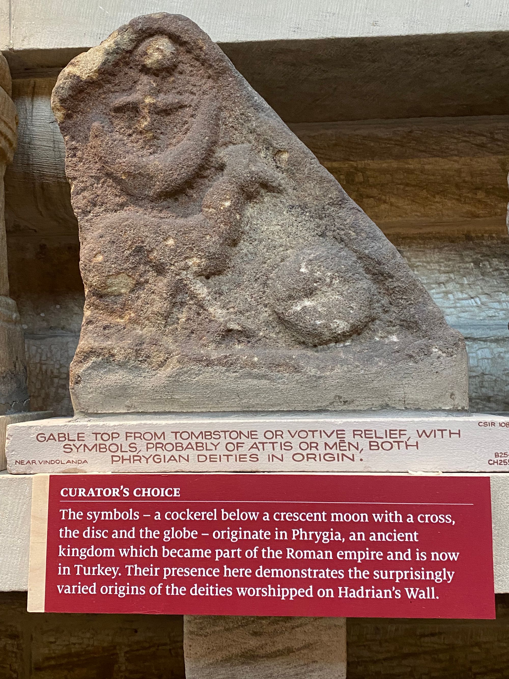 Hadrian bust with M. (Michelangelo) Buonarroti name tag | Roman tombstone with star and crescent emblem | Emperor Hadrian | images of Coventina's Well coins using creative lighting to bring out designs by US photographer Stephen Sacks| Clayton Museum | Chesters Fort