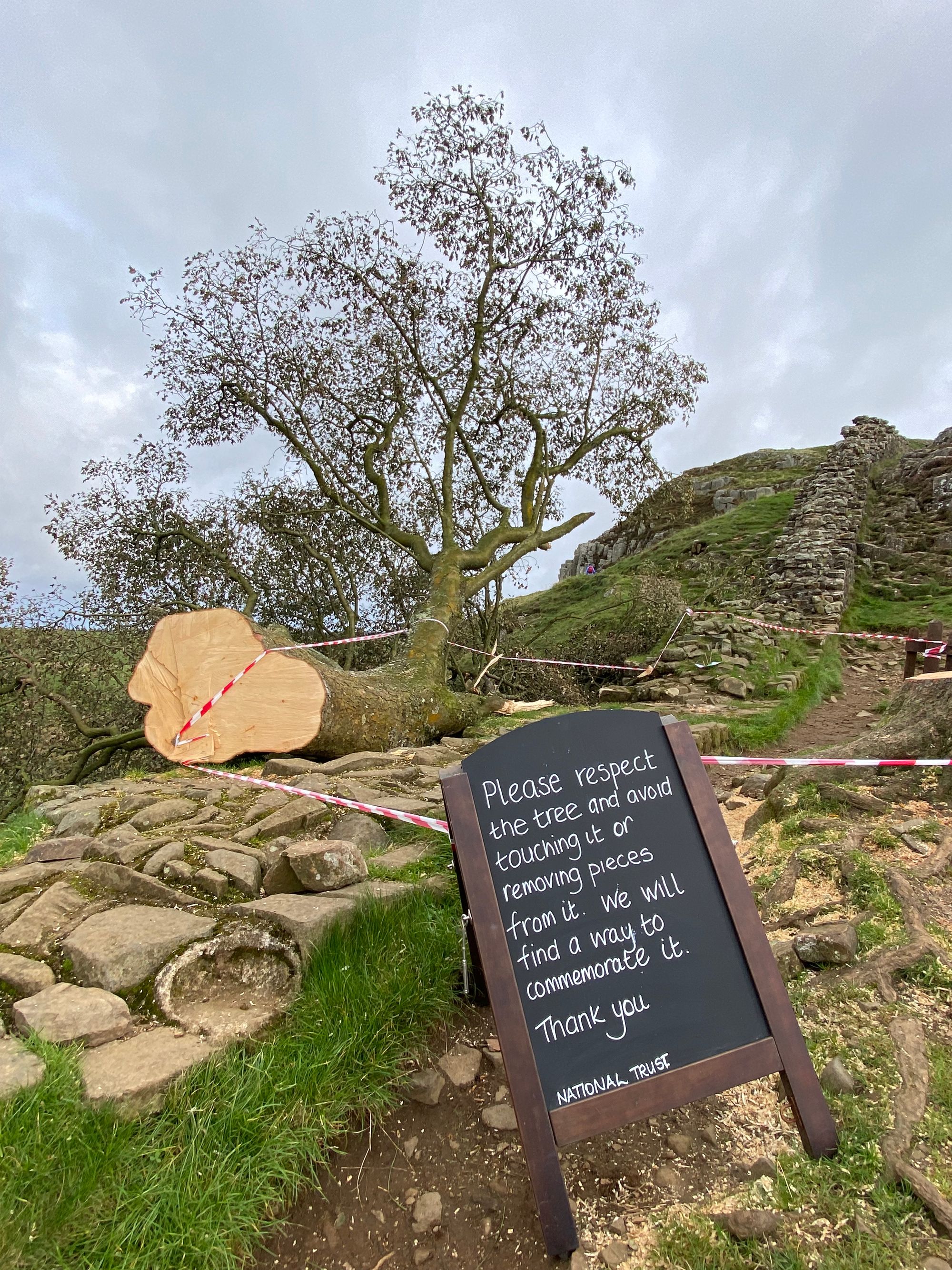 The day before we had been shuttled around by Steven from Hunters Taxi service and he had filled us in on what he had learned from the tree cutting drama. In the middle of a rainy and windy night, a 60-something year old former lumberjack and resident on National Trust property had, with what was believed at the time to be a 16-year old accomplice, cut down the tree. He had been a long-time resident on National Trust property and had been told that he would have to leave. He threatened to cut down the iconic 2016 Tree of the Year if he was evicted. Steven knew the name of the person and while riding with him, a woman journalist called requiring his services. Authorities still have not released the name, but charges against him and the 16-year old have been dropped and two other people have been apprehended.