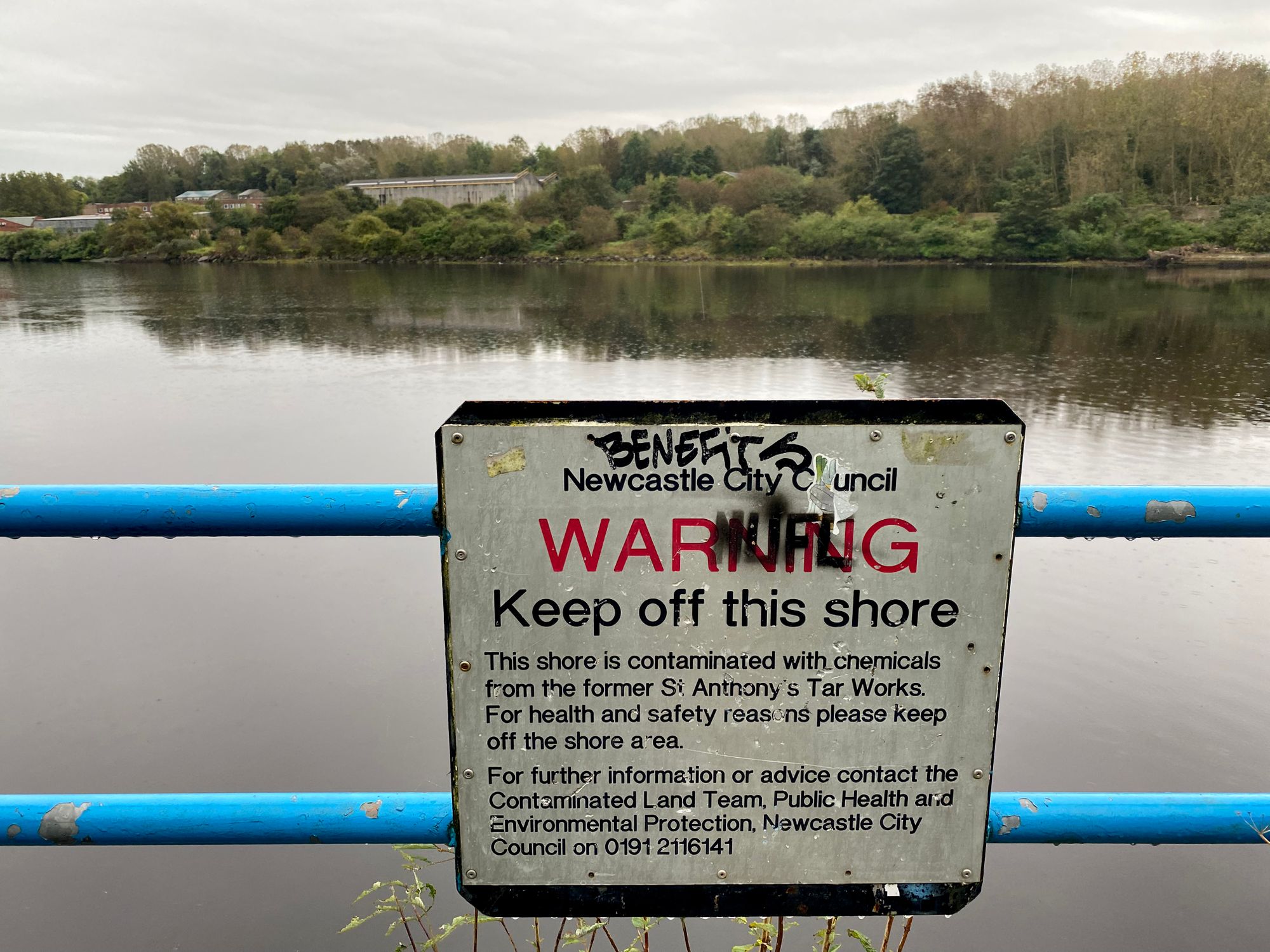 Marker in downtown Newcastle indicating the wall's path | Warning sign of contaminated shore from former tar plant | sign next to reconstructed Roman baths | Segundum