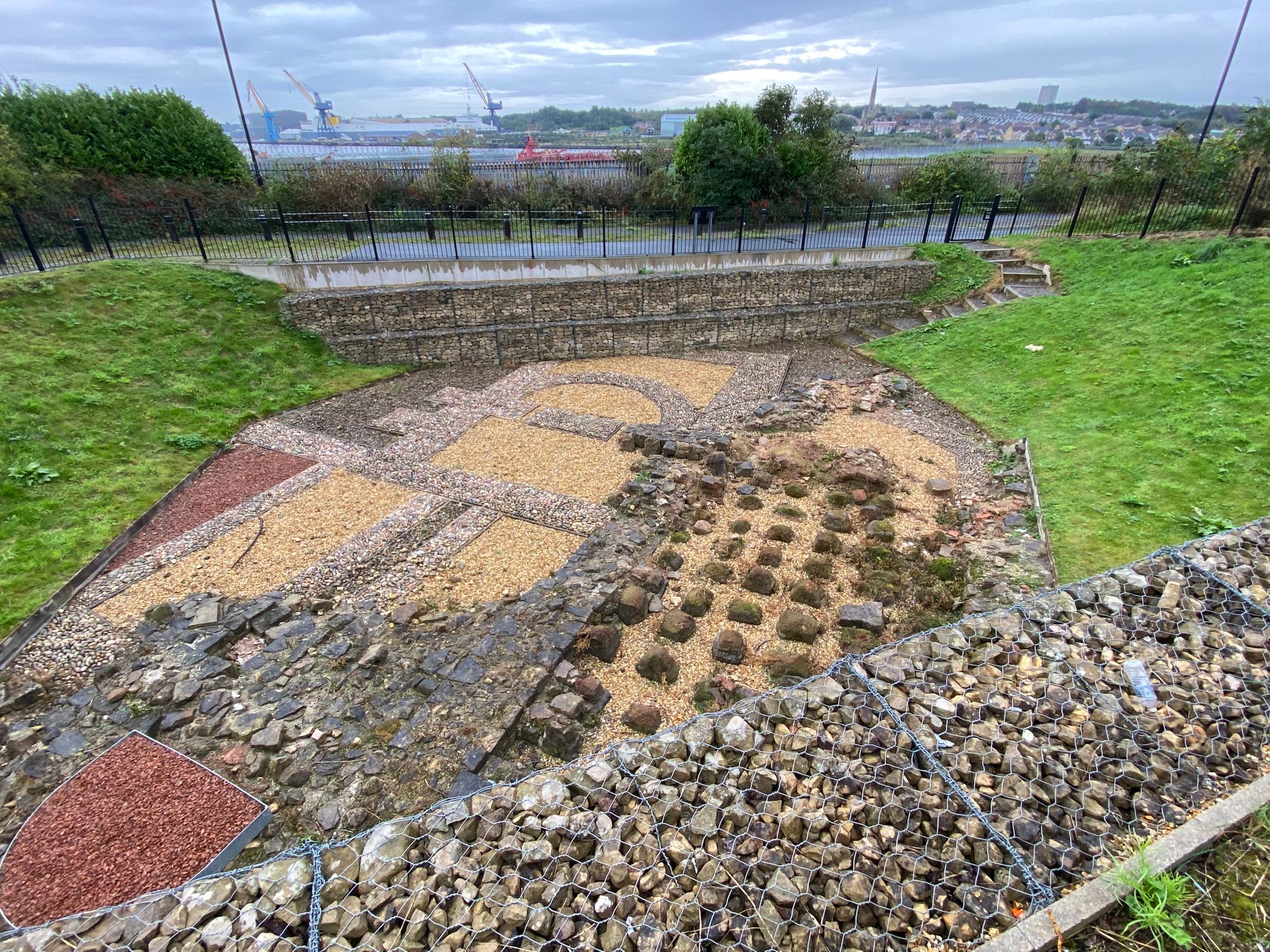 Foundation of Roman baths | Observation tower and Roman Legionary statue | monument dedicated to those who built the wall | Wallsend