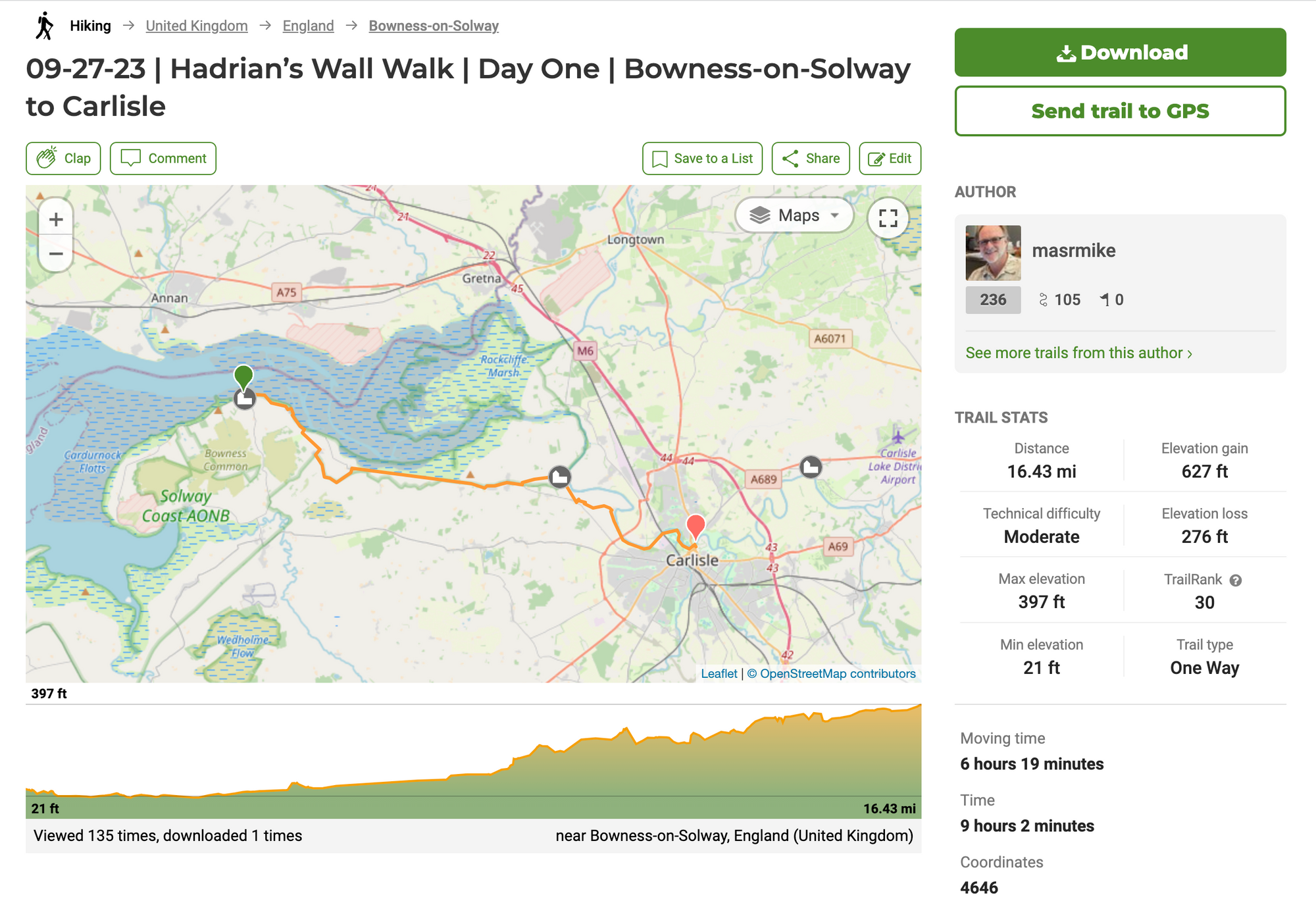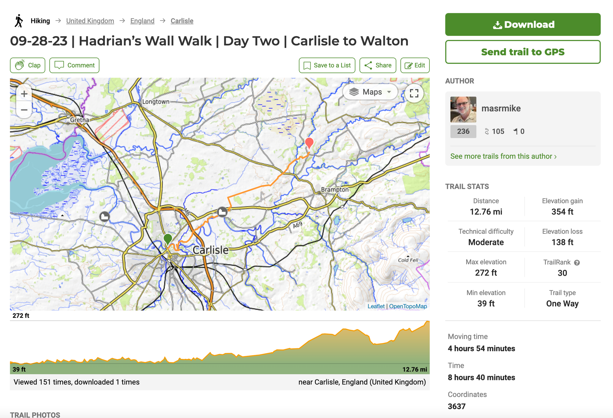 Started at 9am and ended at 6pm in Carlisle. A pretty tough 16 miles of relatively flat terrain, but rain drenched path that were at times muddy and slippery. Only met two hikers coming our way. 69-year old American, Lynn and her adopted son, Christopher. They did the whole path and she said it had been quite a challenge for her. Angus, a storm system, that was suppose to hit early afternoon fortunately did not strike until the night.