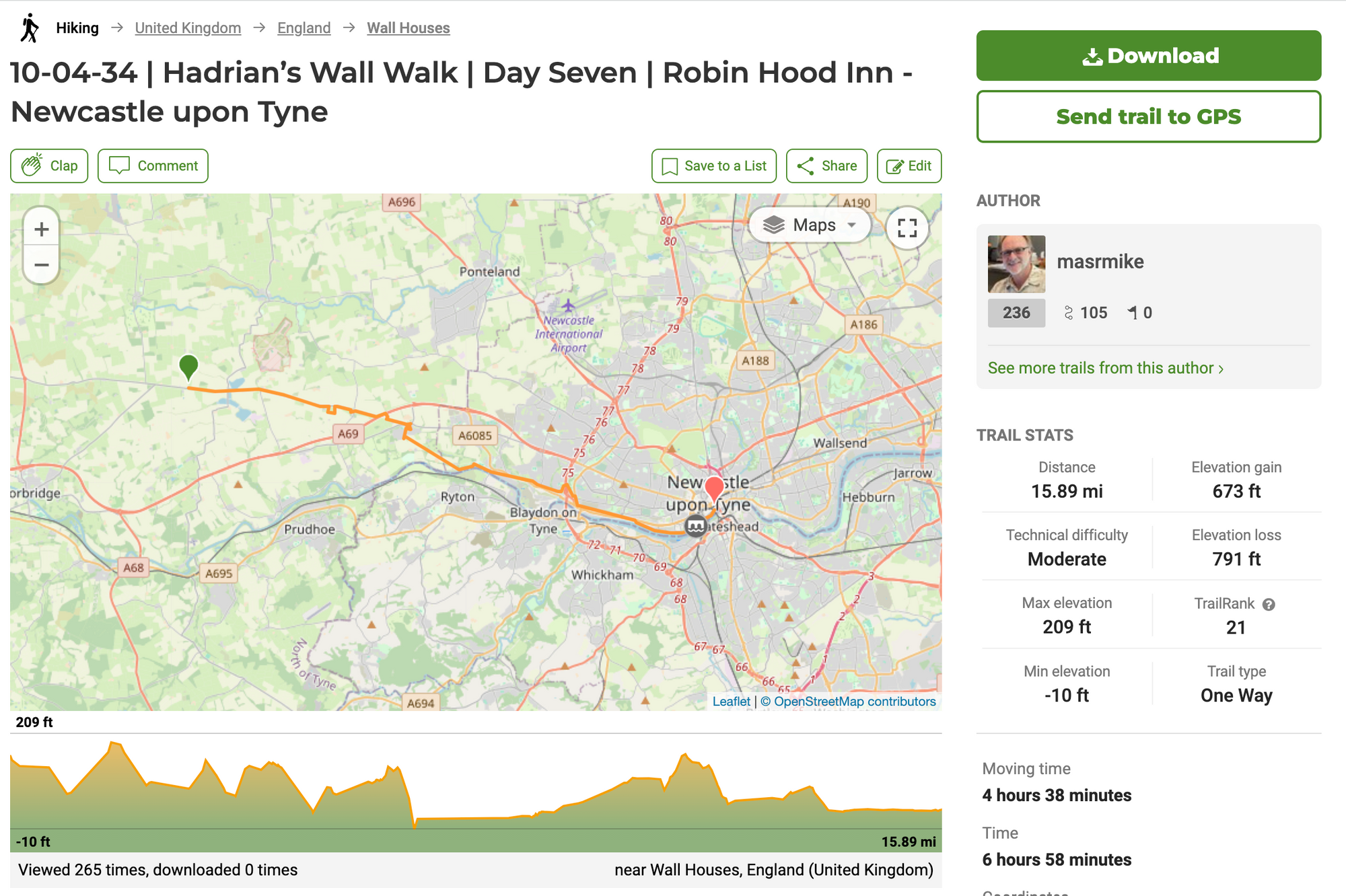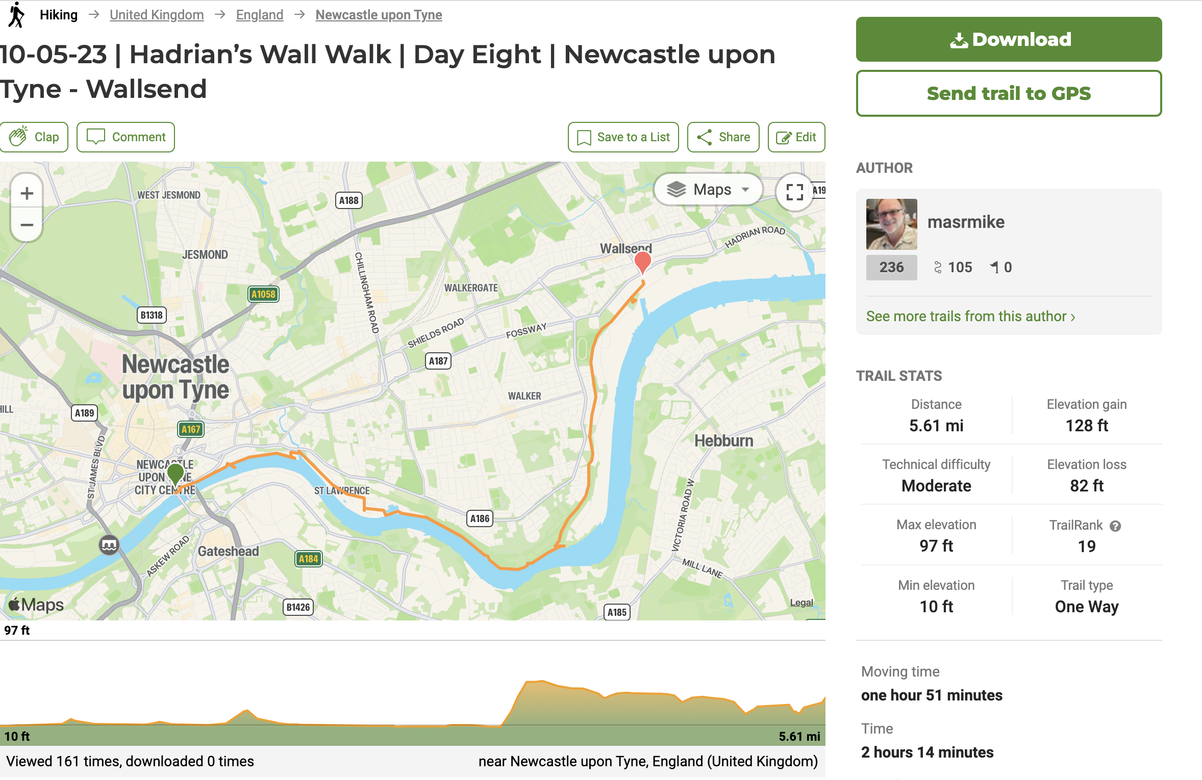 At Heddon-on-the-Wall, the path divergences significantly from the wall trajectory which enters the suburbs of Newcastle and is buried under roads. The path descends to the Tyne River which it follows pretty much the rest of the way to Wallsend (Segundum).