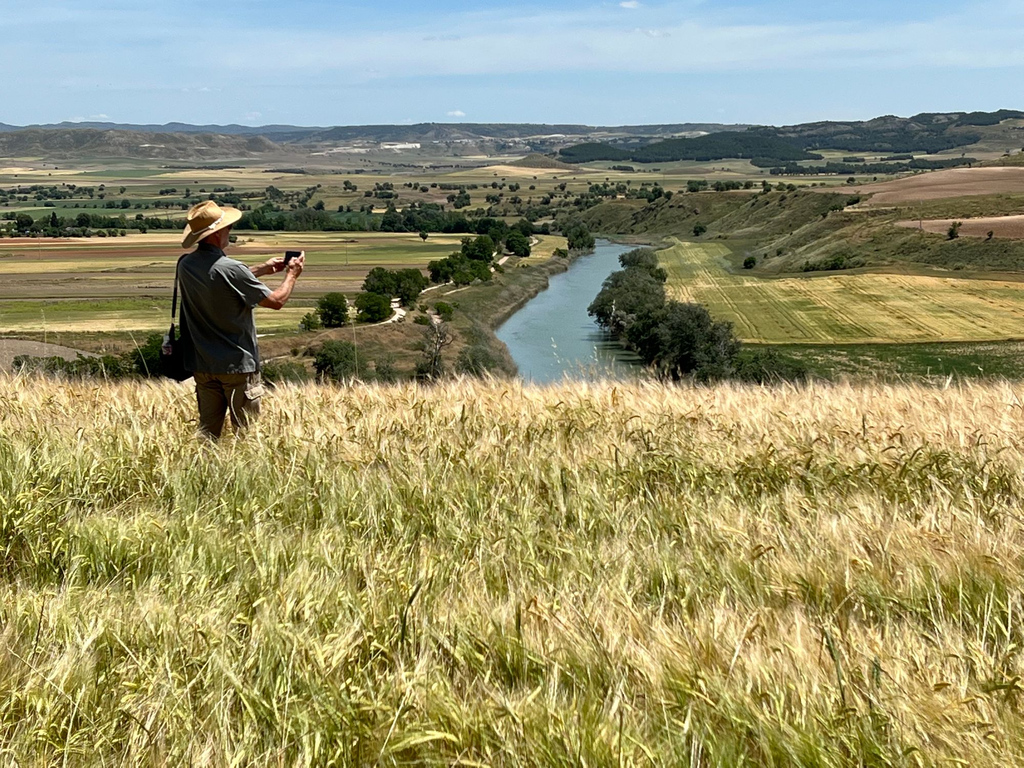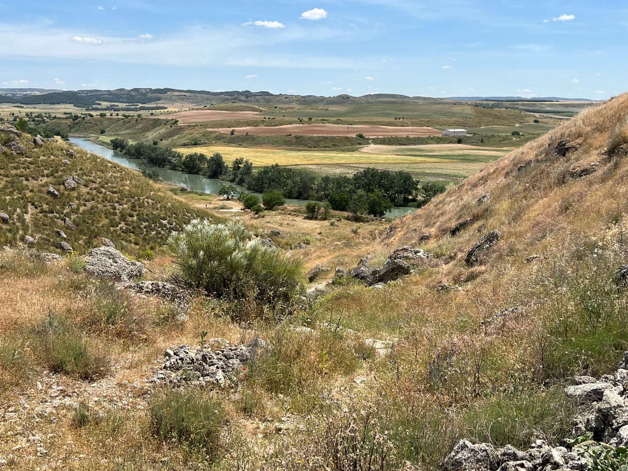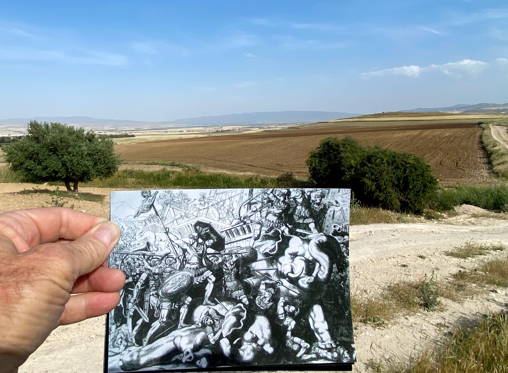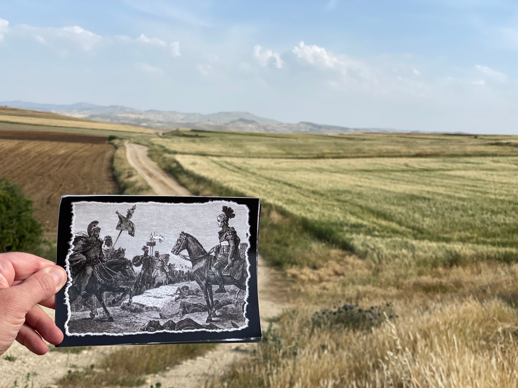 "There in the middle of this wheat field that I walked across to meet up with Al was the foundation ruins of a church and also a tiny Roman archaeological site. Spewed among the wheat fields were many fragments of Roman pottery. It was windy and warm, with a wispy cloud splattered blue sky. I looked out over the battle field from the Spanish tribal coalition perspective and imagined the battle unfolding in front of me". from my journal | 05-23-22