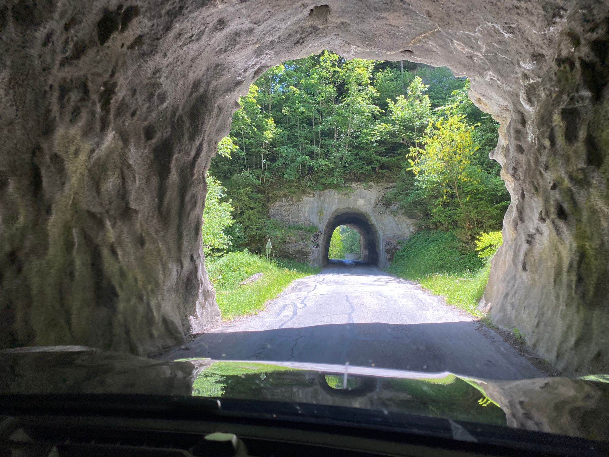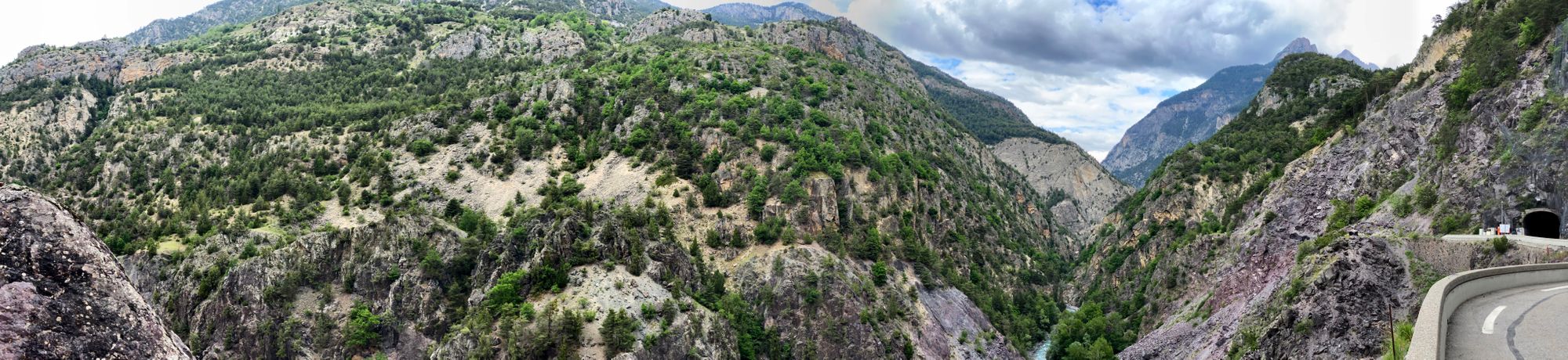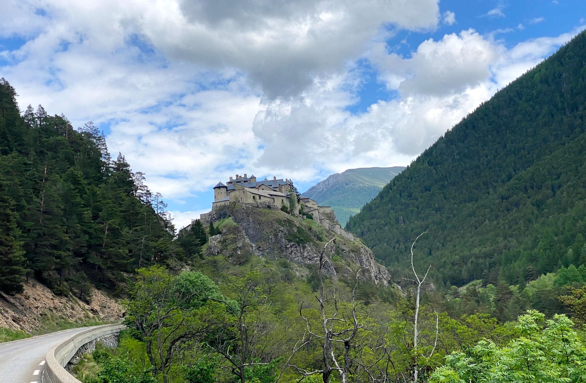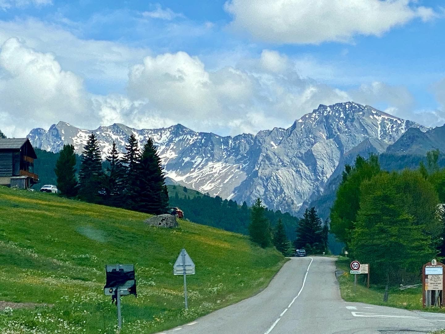 I found another road on the French side that seemed passable and after a crawling along in a long line of cars through the border and into the packed French town we started up the road and drove around a barrier saying “Residents Only” and up to the pass. Still a narrow twisting road but paved and passable.