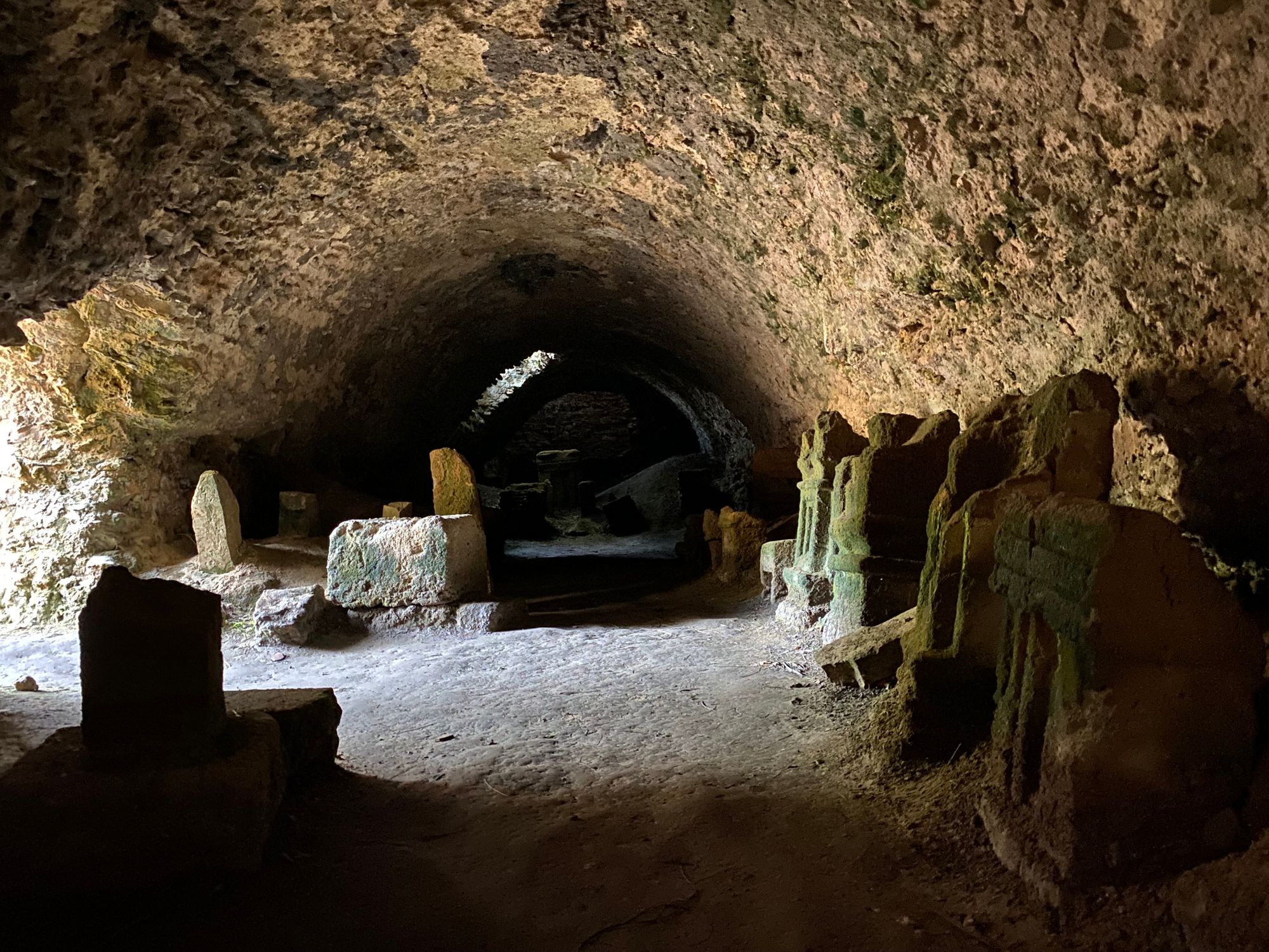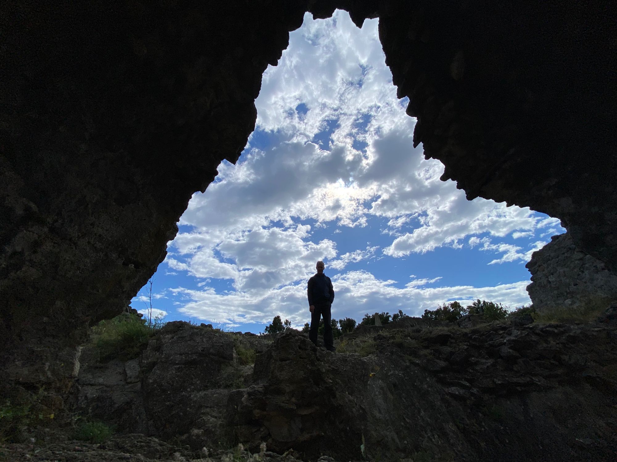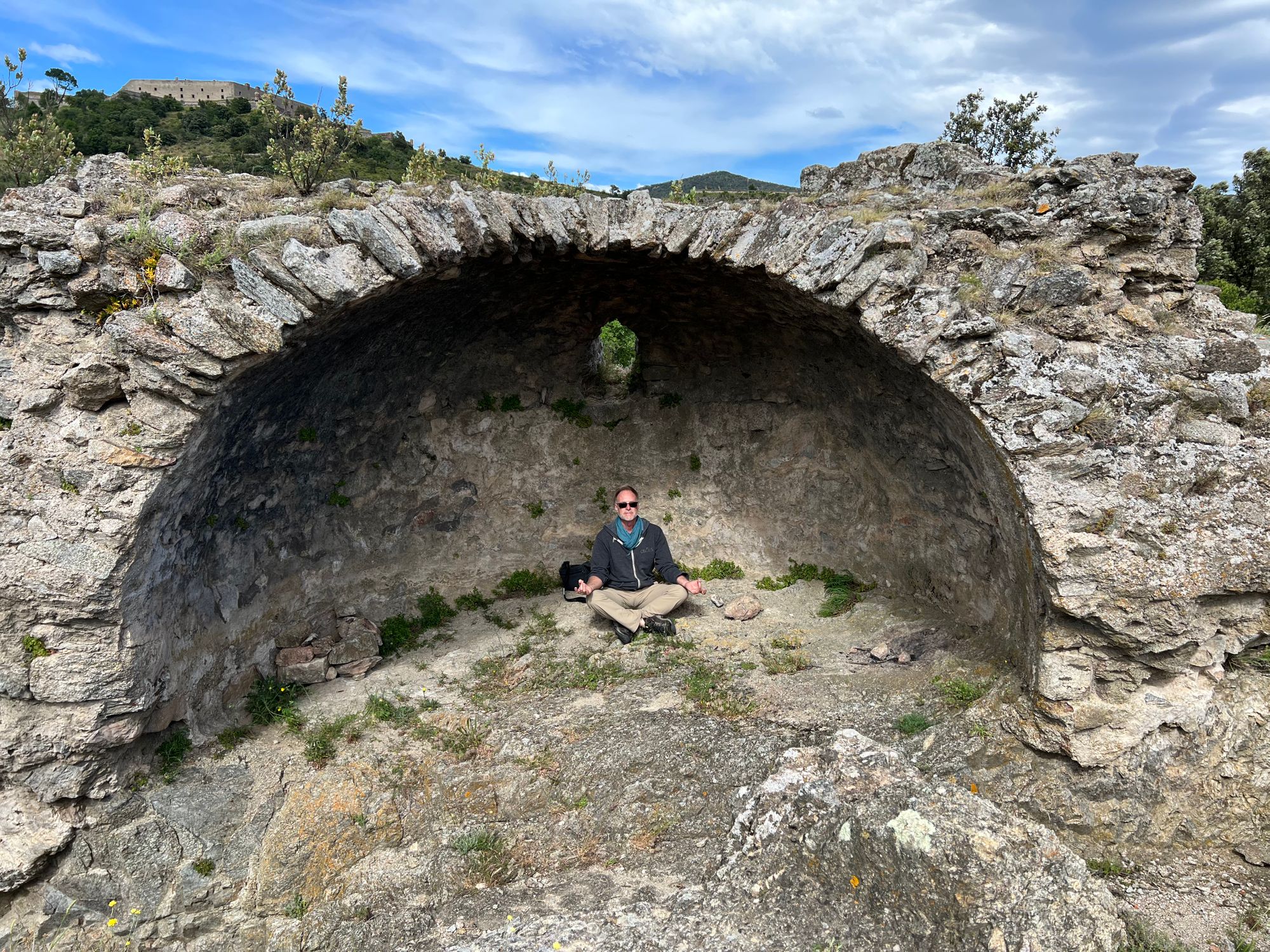 At the top was an enclosed French war graveyard (primarily to victims of WWI as most of them are). It was windy and eery with an ancient tower marking the border. We wanted to find the ruins of a Roman village at the summit where the Roman roads Via Domitia and Via Augusta met. We decided on a small trail that ran along the border and I discovered a small underground bunker complex that looked like it could have been a heavy machine gun emplacement. We made it to the Via meeting place and it was more expansive than what I had seen in photos online. I posed for a meditative zen pic in an arched enclosure and contemplated Hannibal and his army of 80,000 and elephants crossing this narrow, but relatively low pass on his way towards Italy." from the journal | 05-25-22
