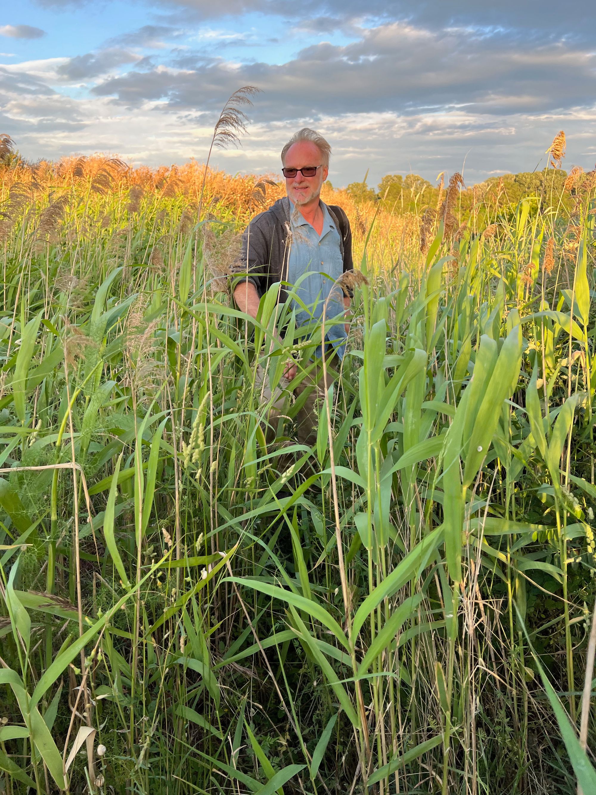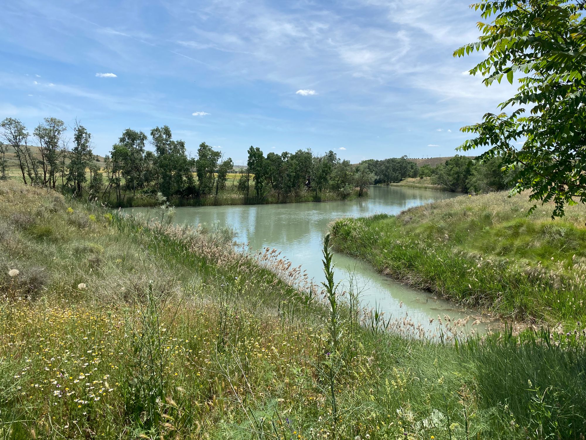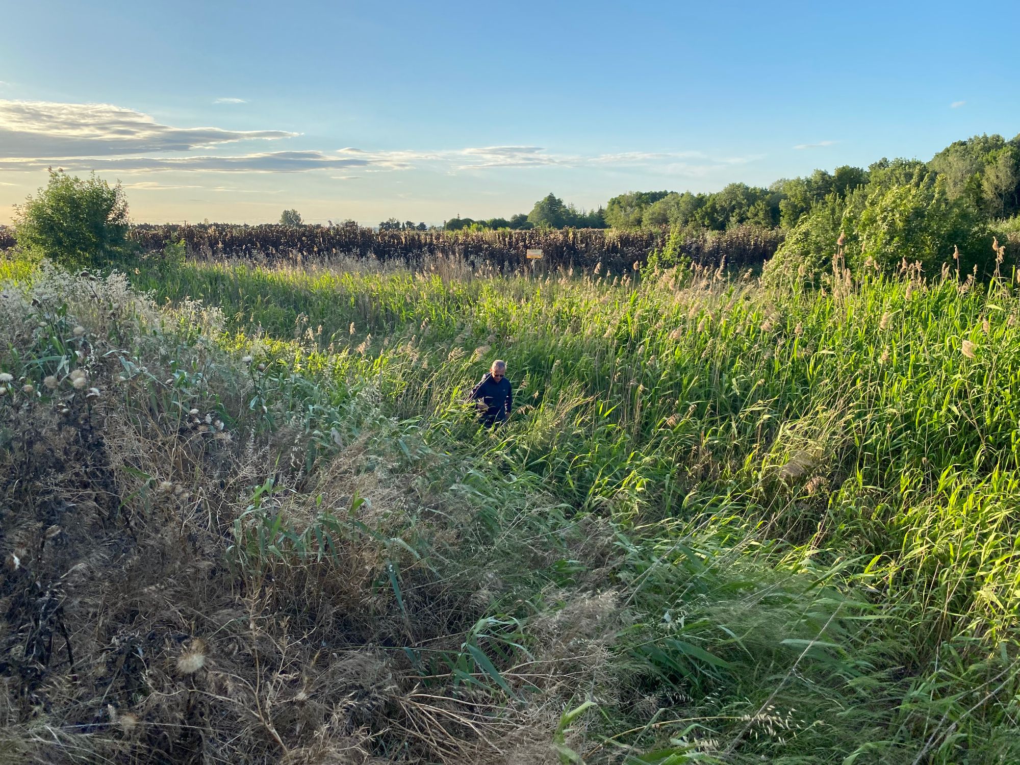 "Back in the car, we raced towards the Rhone River crossing. We passed Rivesaltes internment camp which we would revisit in a few days and then as the sun was low in the sky we approached an area north of Arles at Fourques where the most logical estimates put the difficult and dramatic river crossing. I had selected what I thought would be an accessible place and possible crossing place where we could park the car and overlook the river. Well as it turns out there are two levies before the river and in between, the area is overgrown and not meant to be walked through. We had little choice as the sun was about to set and finding another more accessible place might take us further from the likely crossing area. So over one levy and into the underbrush which was sometimes 8 feet high and full of barbs. . Our socks and pants were covered with them. We fought through the brush and climbed a forested embankment and in front of us lay the slow flowing Rhone River." from my journal | 05-25-22