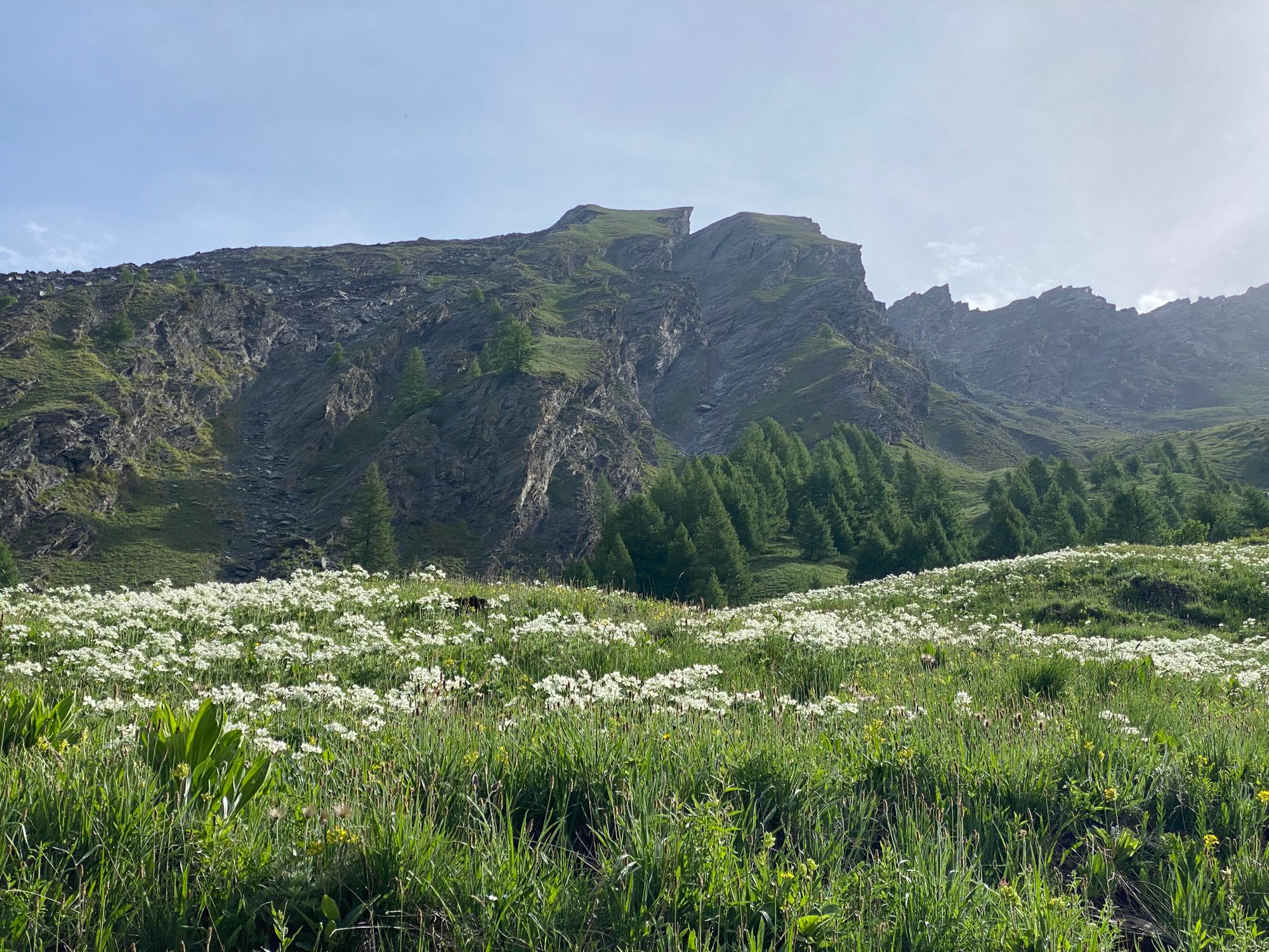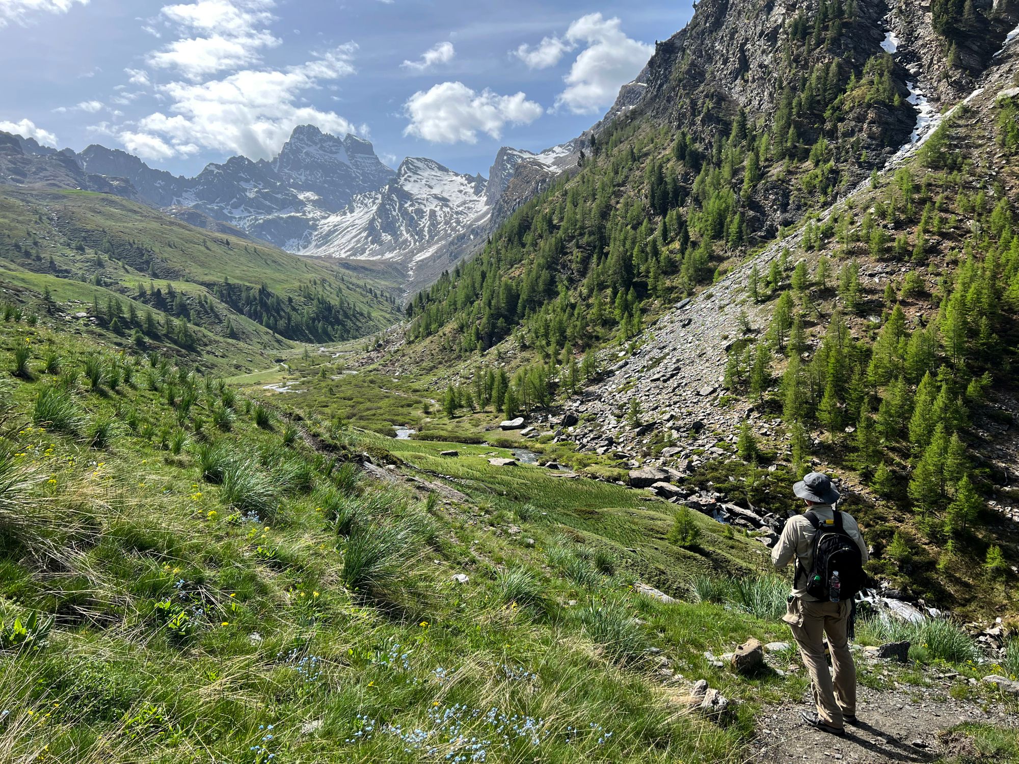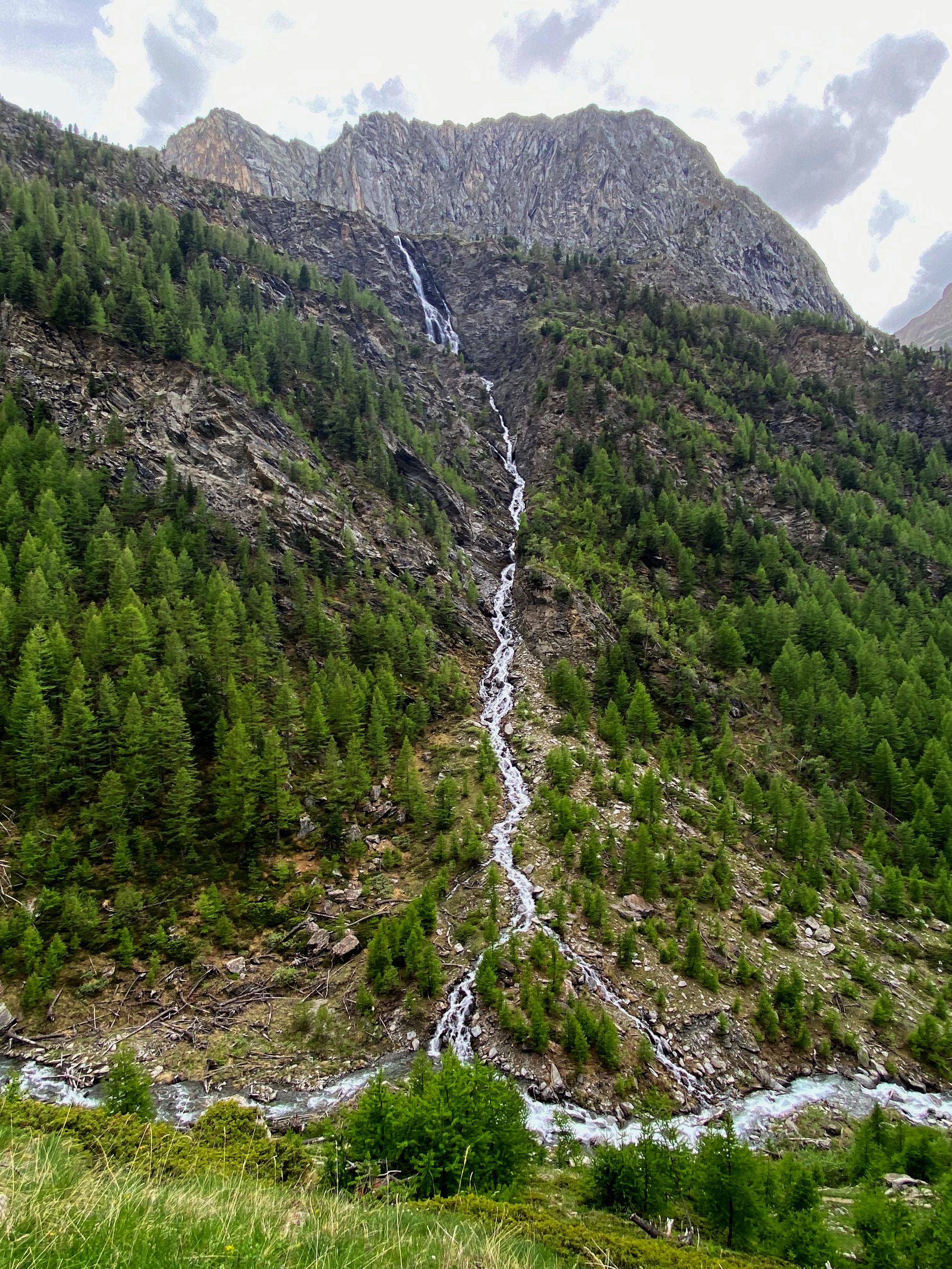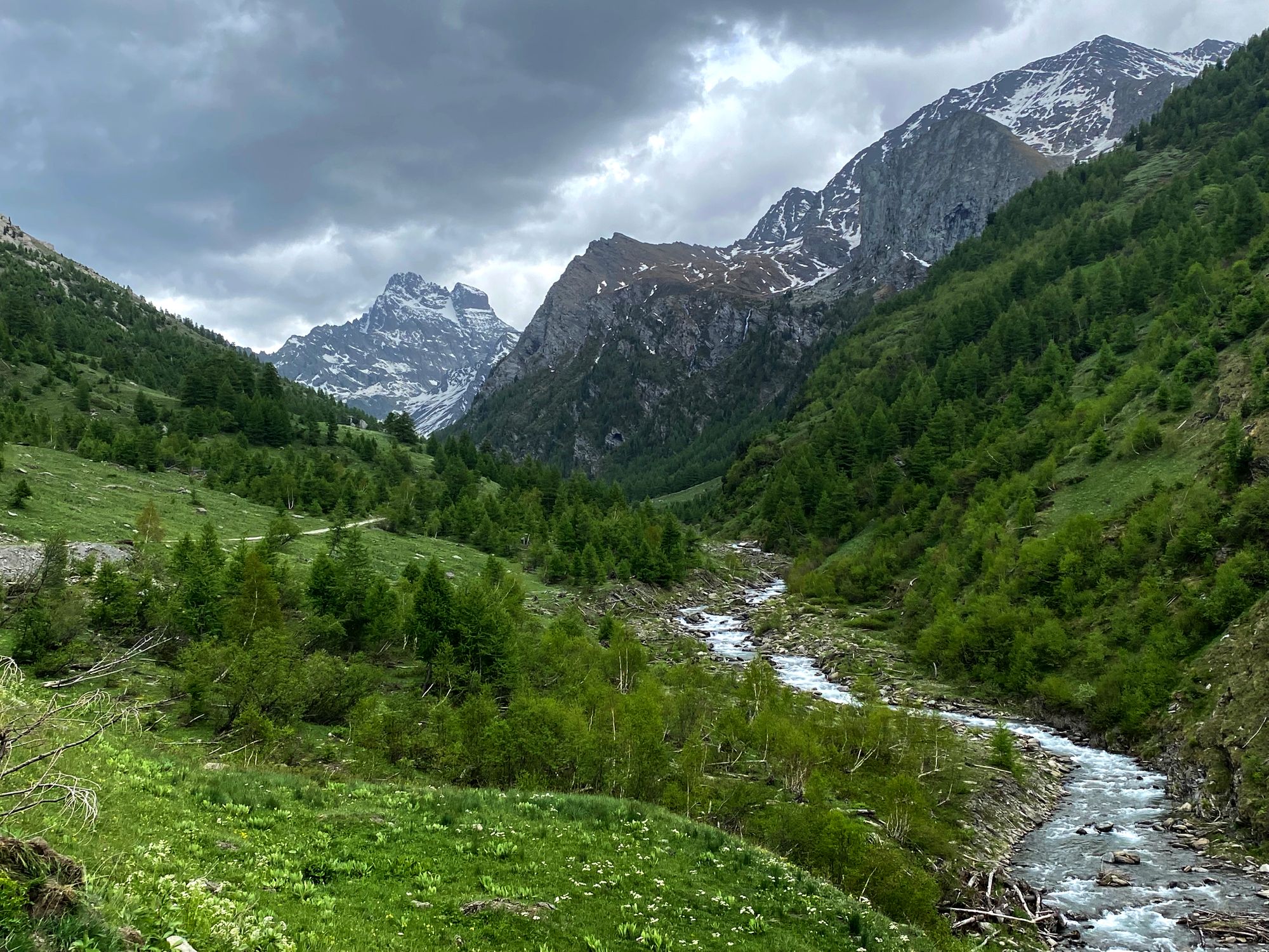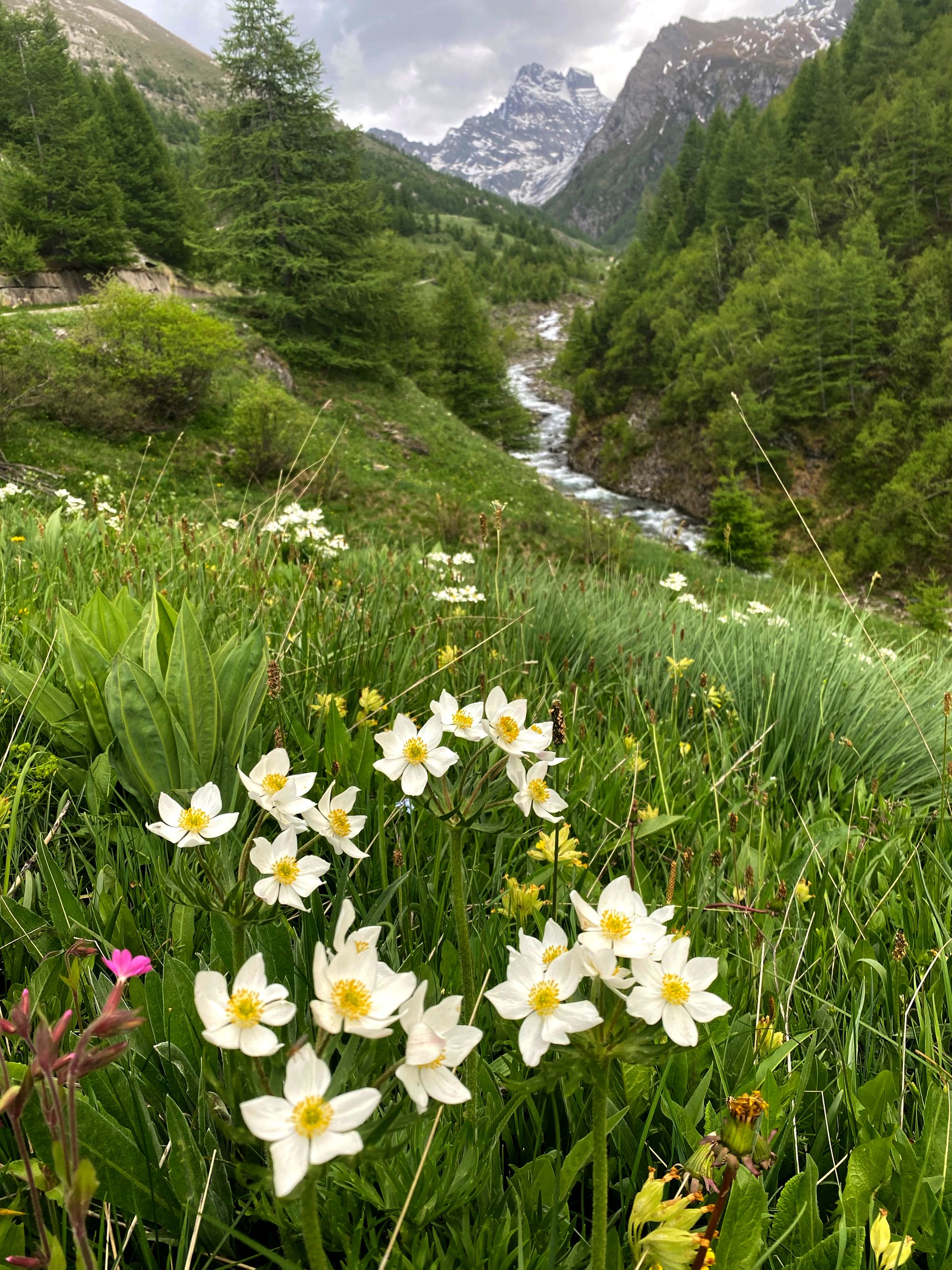 "Al walked ahead and he was soon out of site. I admired and photographed the thin waterfalls that streamed down from the high reaches of the peaks into Le Guil river. Photographed a nice flower scene as accumulating clouds on the Italian side started to mass into a grey ominous weather front. No time to dally." journal excerpt 05-27-22