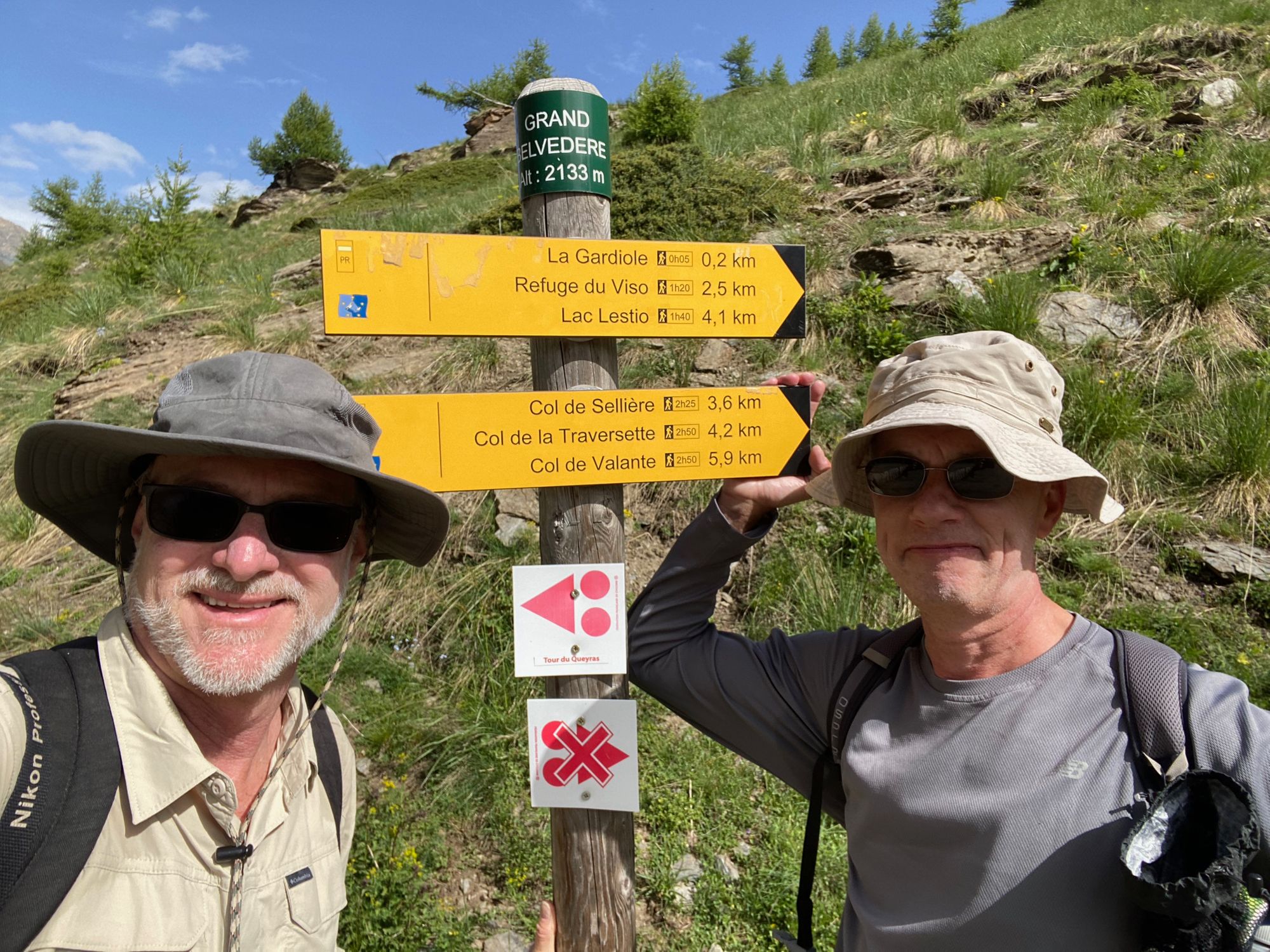 "It was 1:30pm and though the weather looked good..the wind was strong and clouds were accumulating. I put on my jacket and Al help hold the illustrations as I tried to photograph scenes between gusts of wind. We posed for some photos. I took a minute to venture a few minutes down into Italy where I sat contemplatively and enjoyed the sandwich I had prepared. The clouds started to gather around the higher peaks and it was time to take one last look and head down back into France along the marked trail." journal excerpt 05-27-22