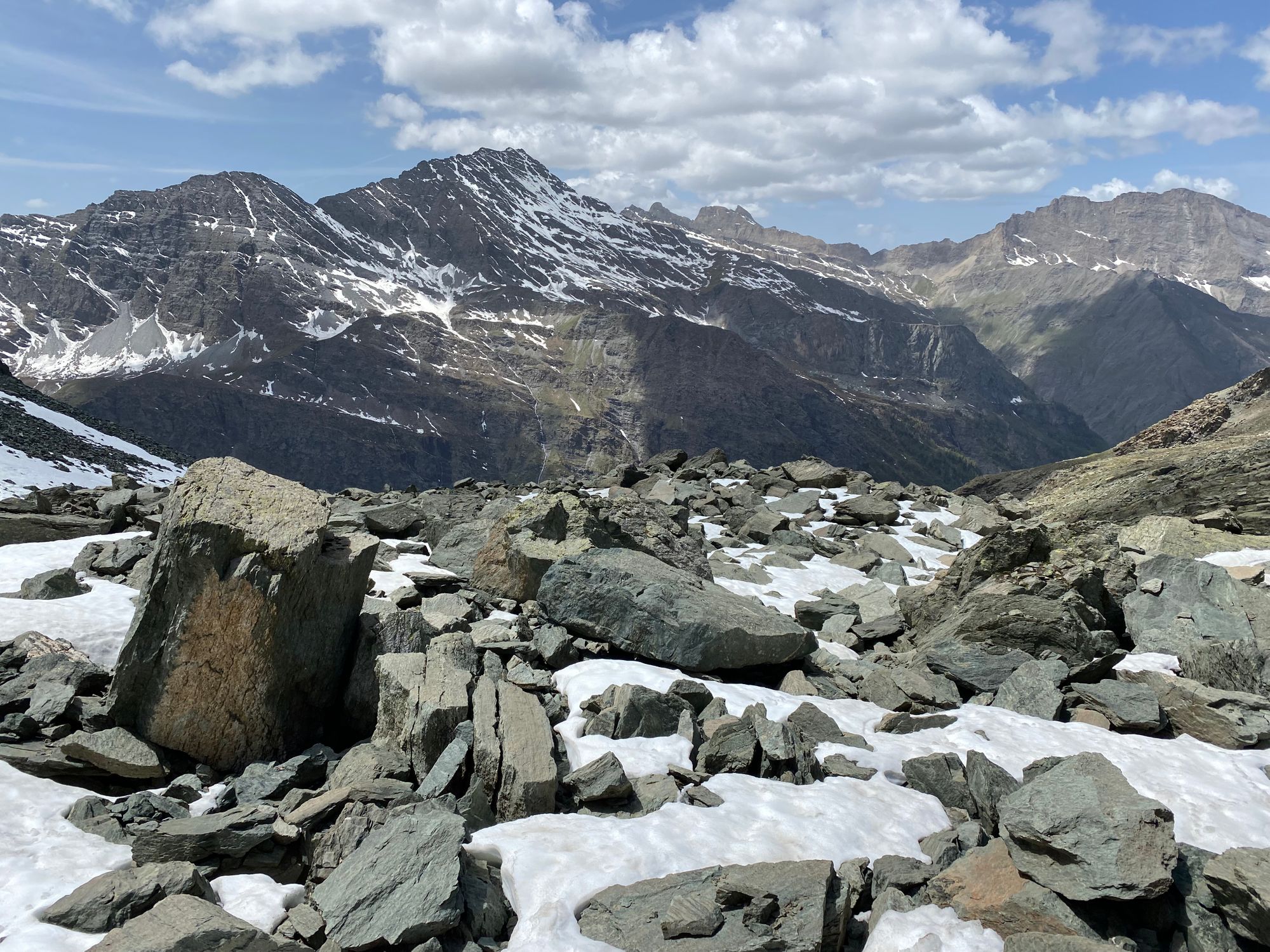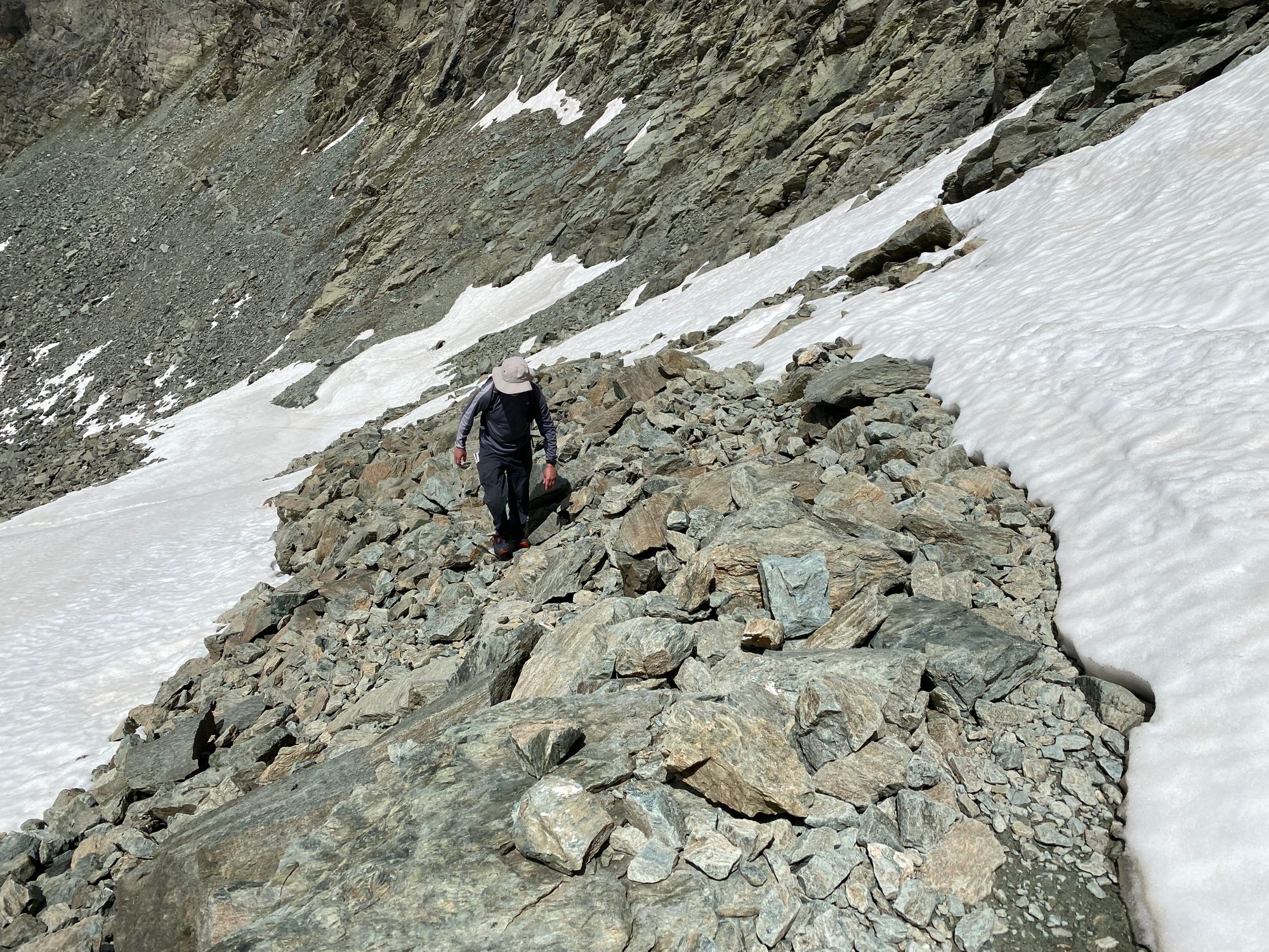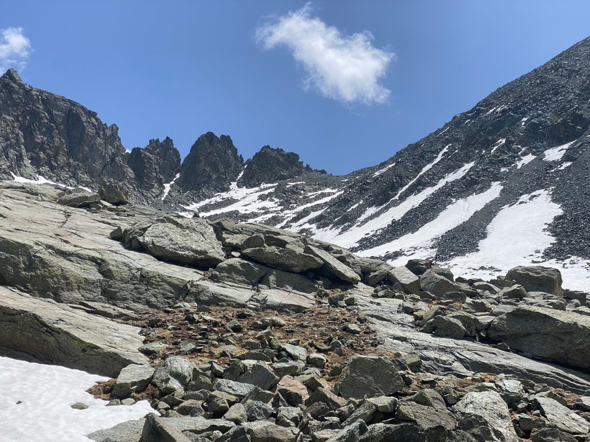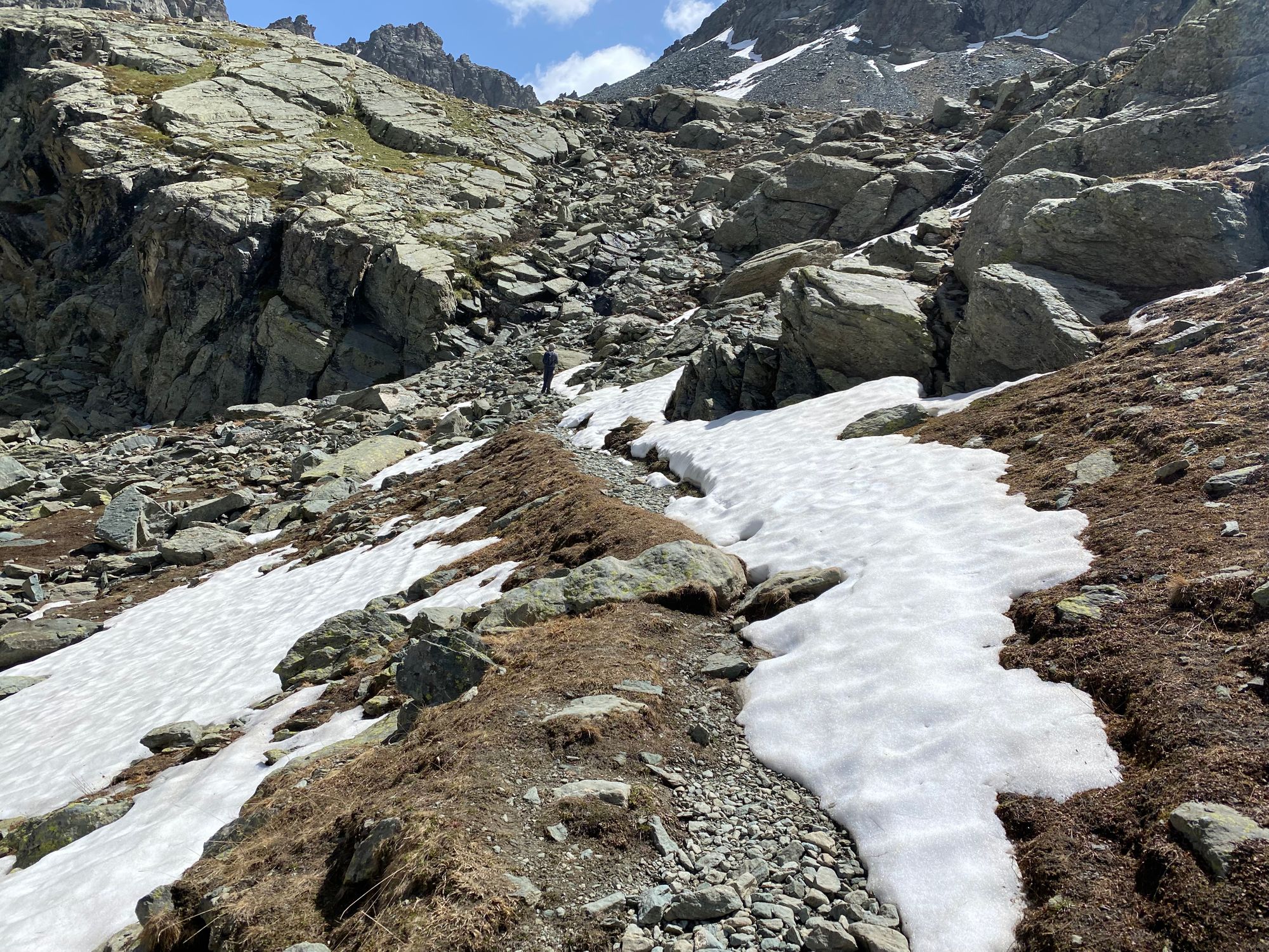 "I headed in the general direction up towards where the pass should be. Still the Col de la Traversette could not be seen. But from the photos I had seen this was the right way. I encountered a huge boulder slide and now started climbing using my hands and carefully placing my feet - as many of what seemed like solid big rocks would move when weight was put on them. It was slow going. Snow patches separated parts of the boulder fields. I tried to circumnavigate these snow fields fearing that with the warm sun they would be soft and I could sink deep into them." journal excerpt 05-27-22