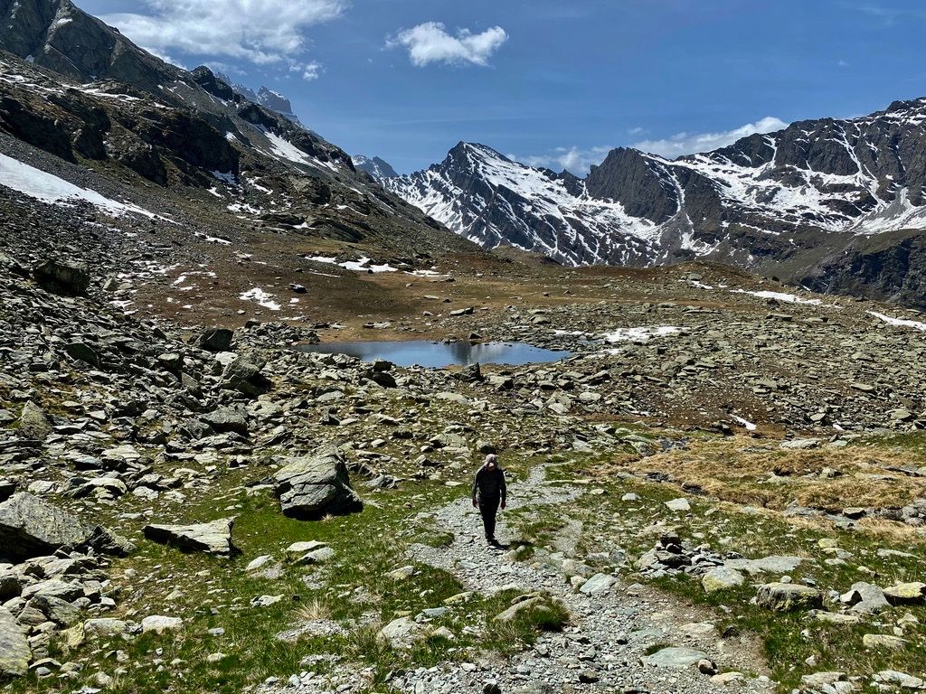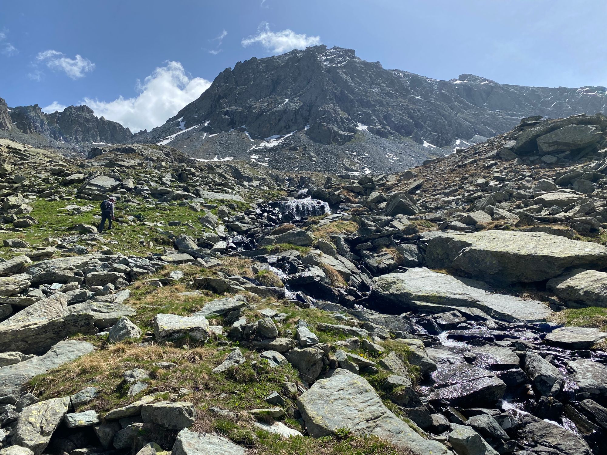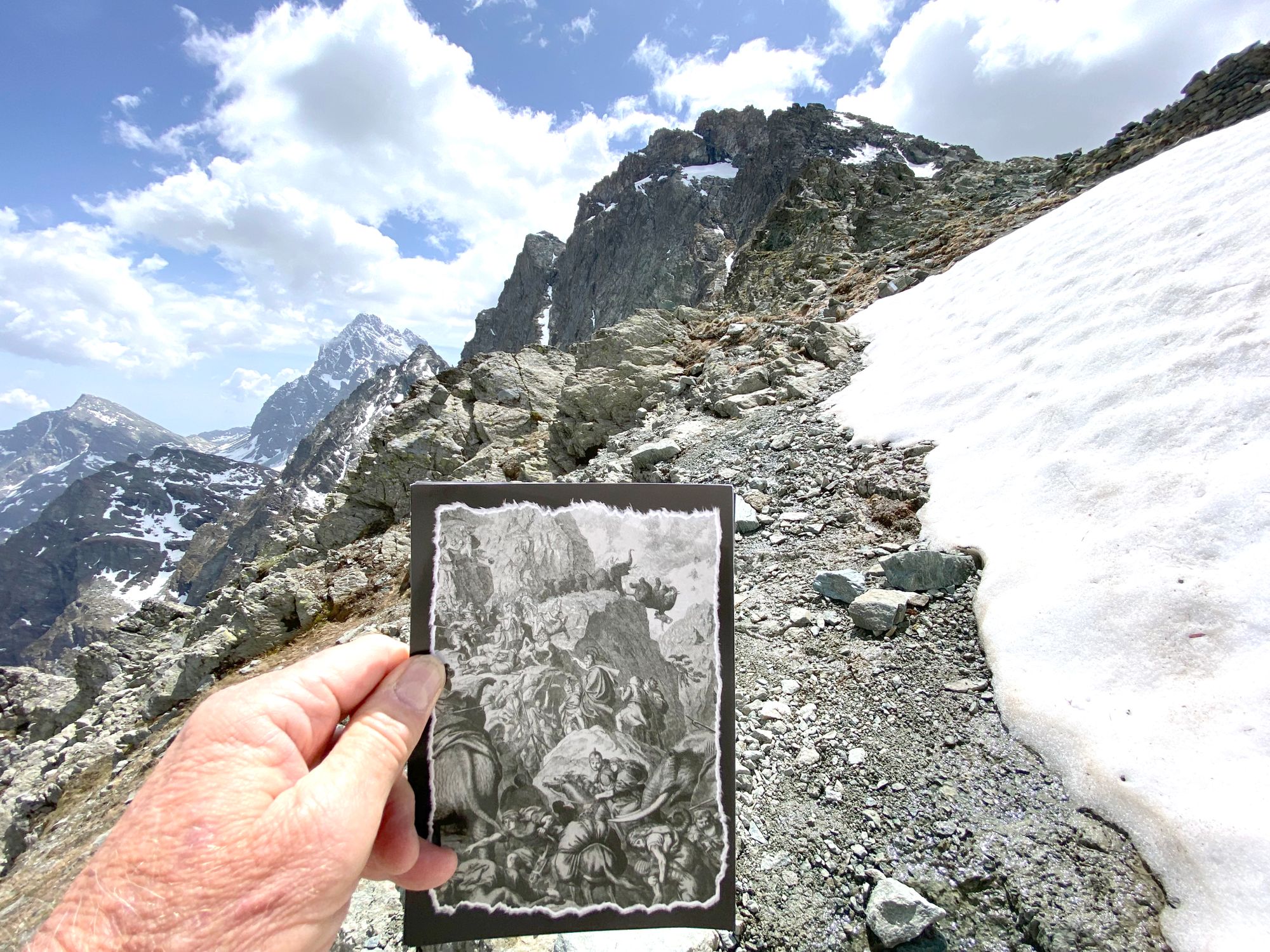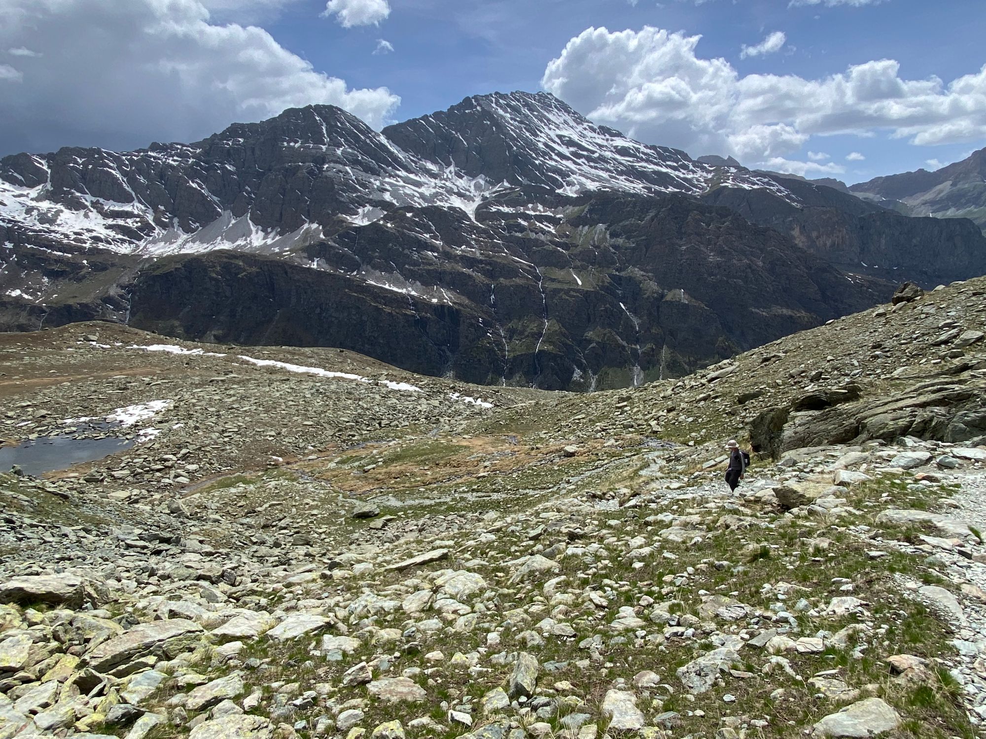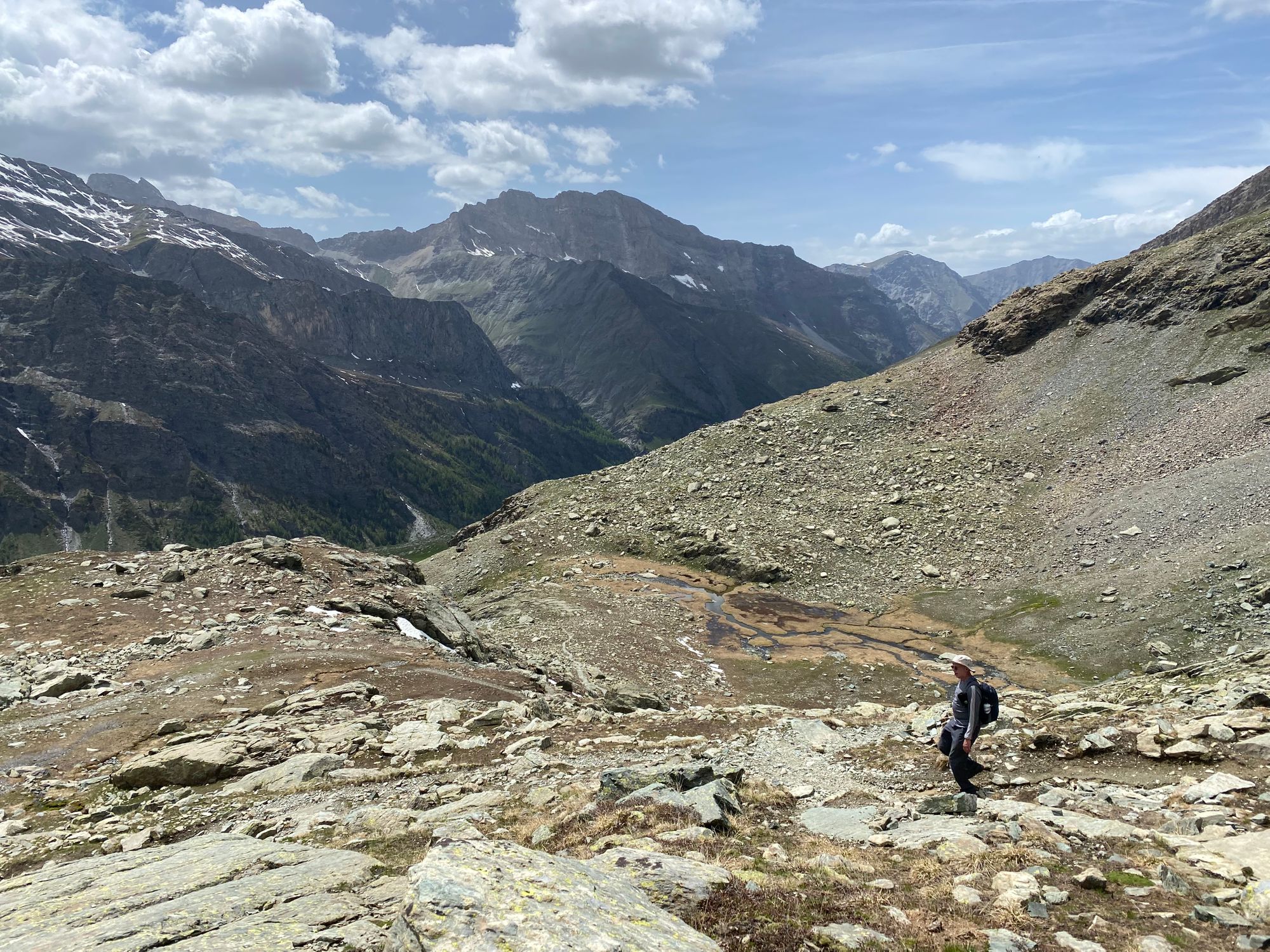 "I headed in the general direction up towards where the pass should be. Still the Col de la Traversette could not be seen. But from the photos I had seen this was the right way. I encountered a huge boulder slide and now started climbing using my hands and carefully placing my feet - as many of what seemed like solid big rocks would move when weight was put on them. It was slow going. Snow patches separated parts of the boulder fields. I tried to circumnavigate these snow fields fearing that with the warm sun they would be soft and I could sink deep into them." journal excerpt 05-27-22