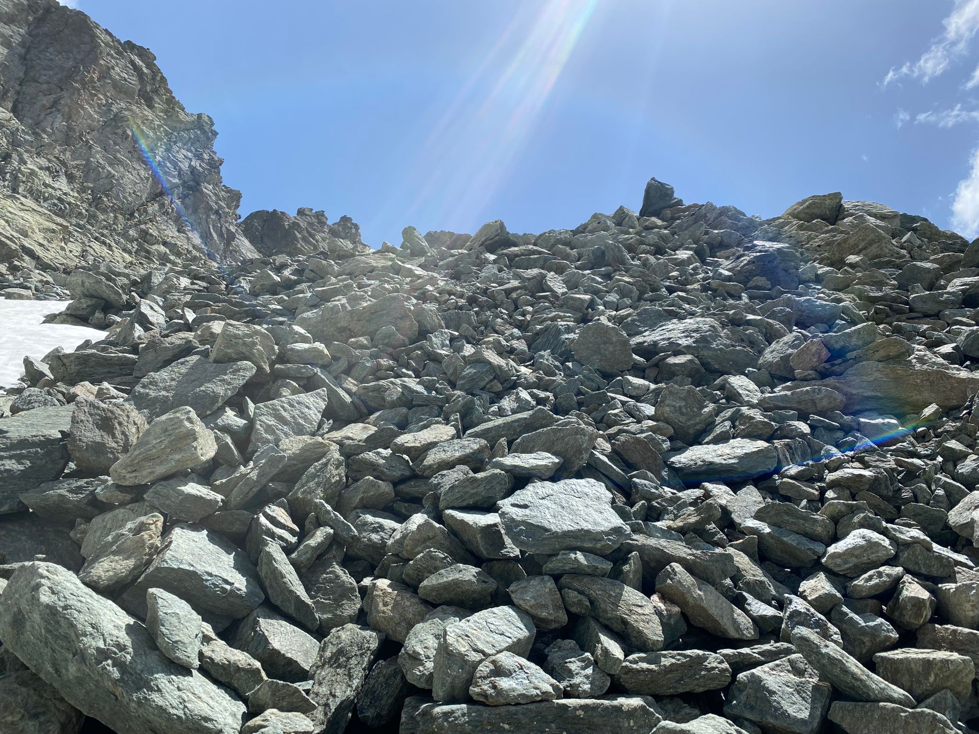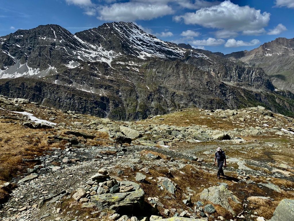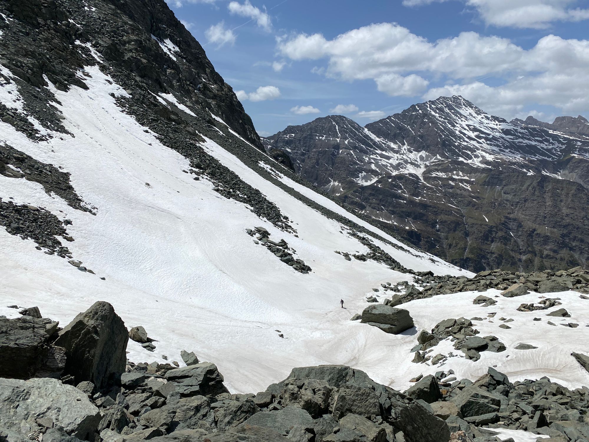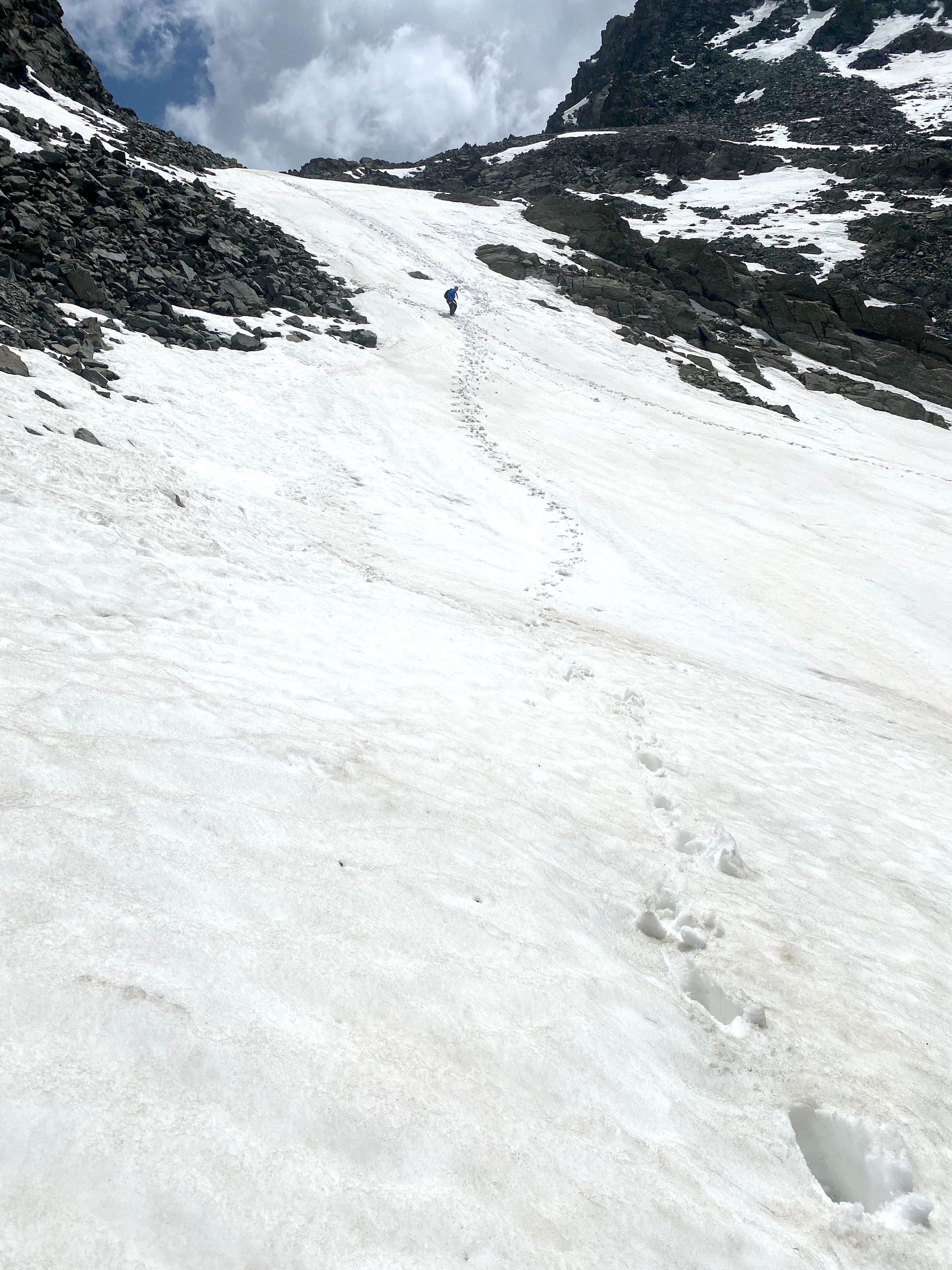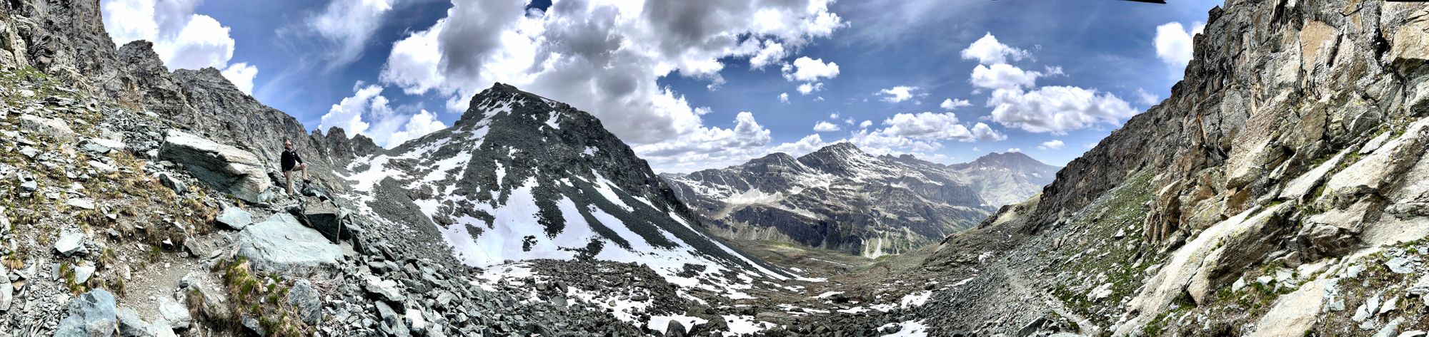 "I headed in the general direction up towards where the pass should be. Still the Col de la Traversette could not be seen. But from the photos I had seen this was the right way. I encountered a huge boulder slide and now started climbing using my hands and carefully placing my feet - as many of what seemed like solid big rocks would move when weight was put on them. It was slow going. Snow patches separated parts of the boulder fields. I tried to circumnavigate these snow fields fearing that with the warm sun they would be soft and I could sink deep into them." journal excerpt 05-27-22
