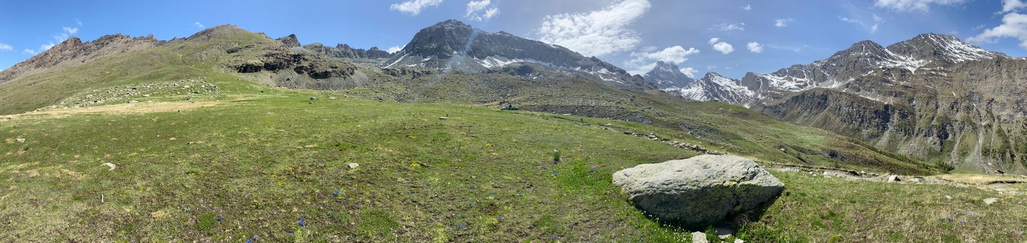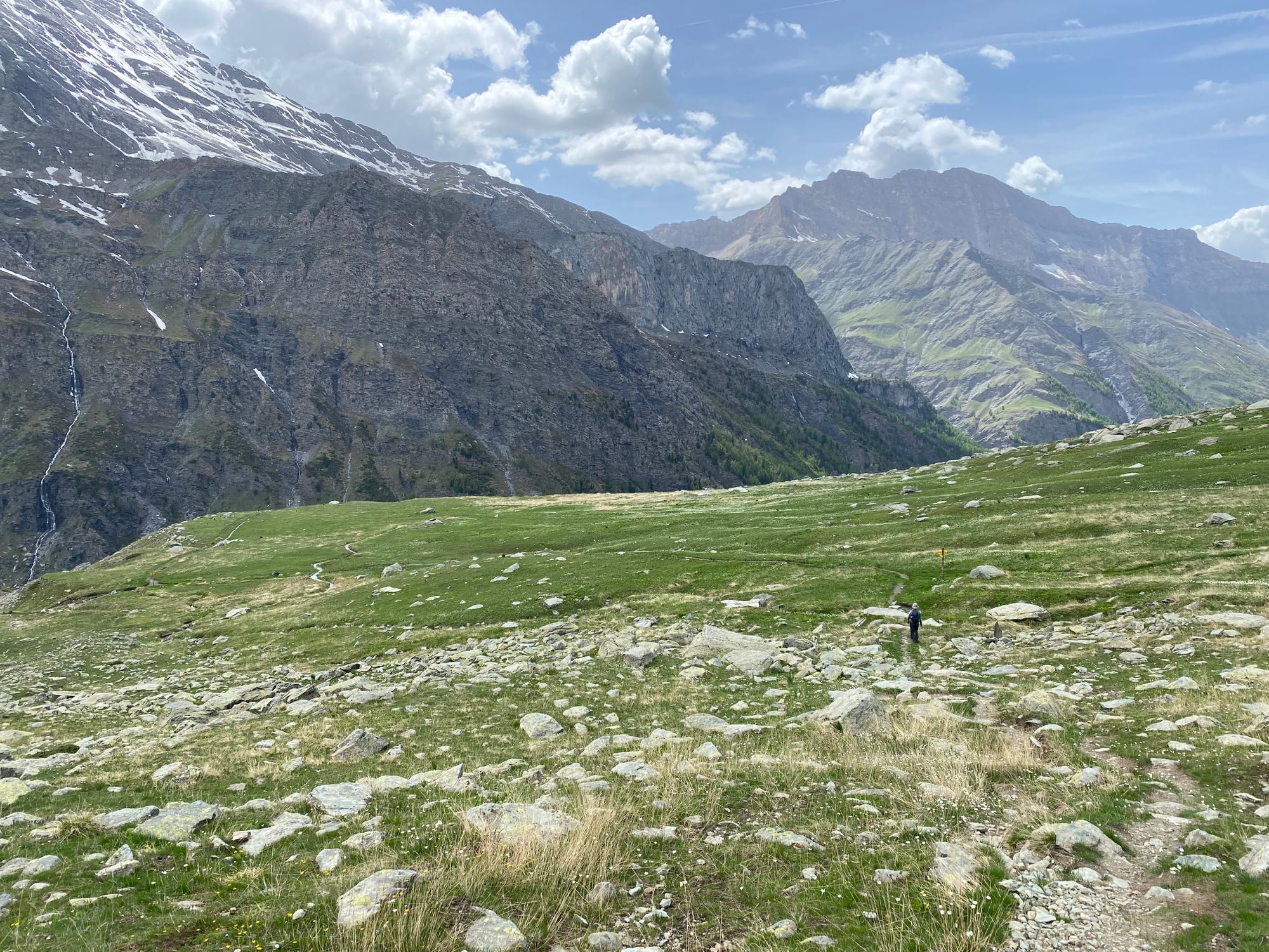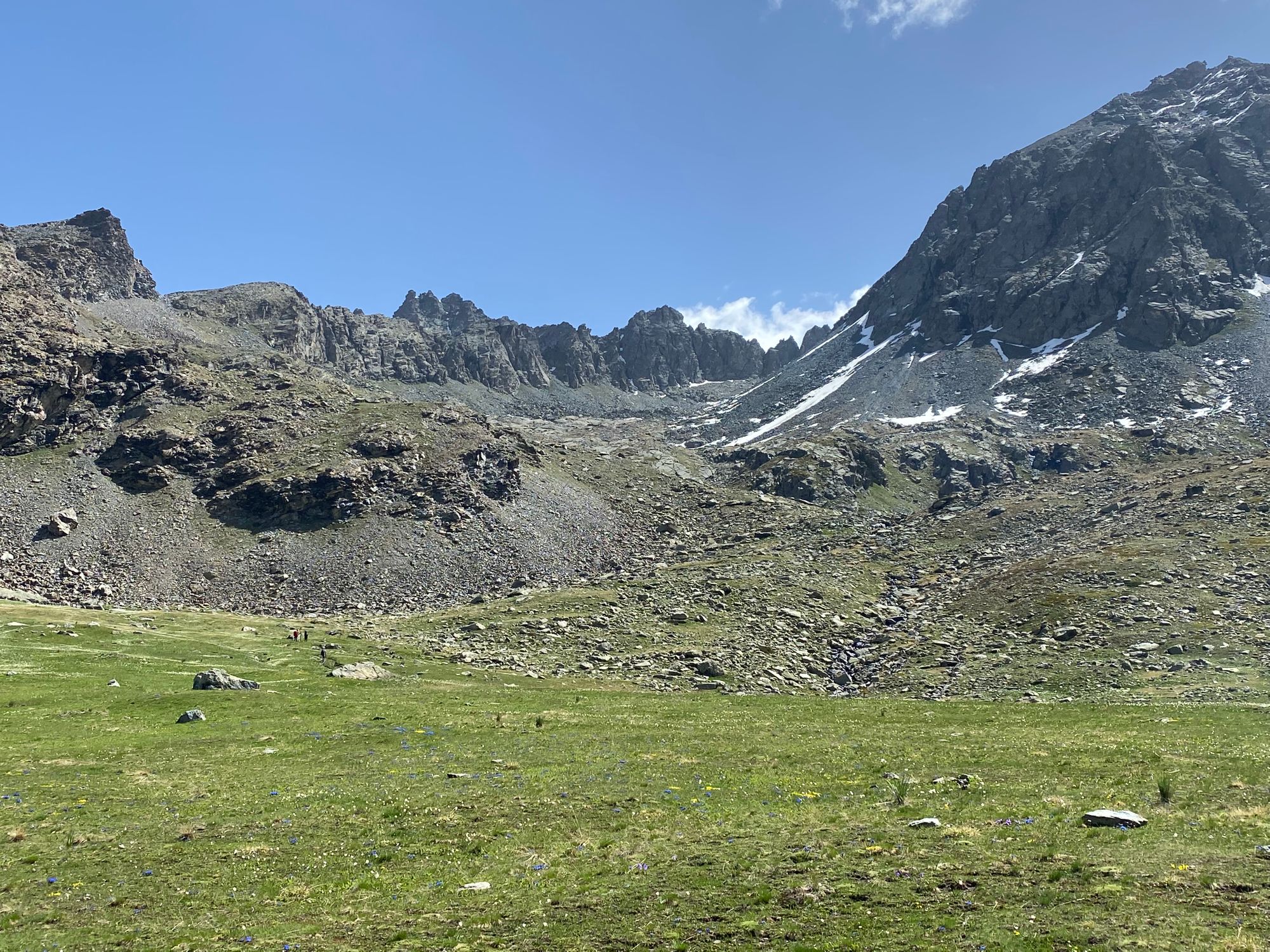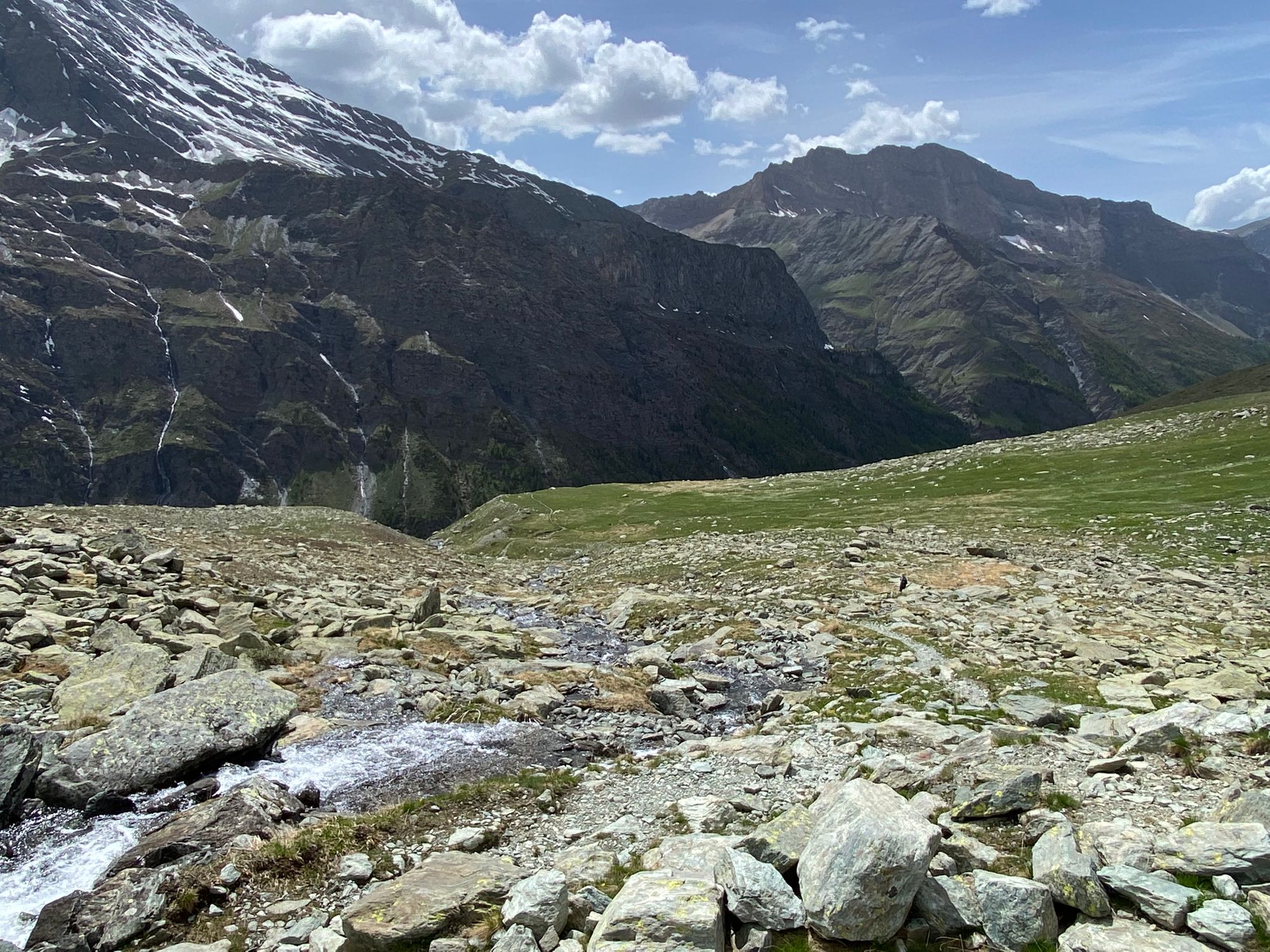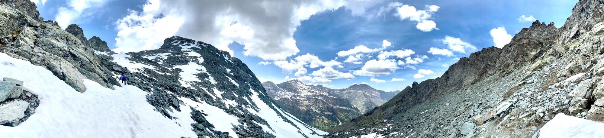 "I headed in the general direction up towards where the pass should be. Still the Col de la Traversette could not be seen. But from the photos I had seen this was the right way. I encountered a huge boulder slide and now started climbing using my hands and carefully placing my feet - as many of what seemed like solid big rocks would move when weight was put on them. It was slow going. Snow patches separated parts of the boulder fields. I tried to circumnavigate these snow fields fearing that with the warm sun they would be soft and I could sink deep into them." journal excerpt 05-27-22