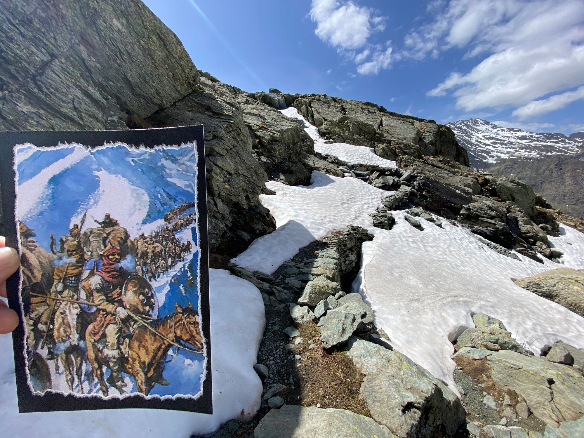 Though hostile tribes lurked about they left the struggling army on its own. The new snow had accumulated on top of the permanent year round snow. Men and beasts trampling through the snow could not getting a footing on the frozen under layer and would loose their footing and fall - sometimes over precipice cliffs that proved fatal.