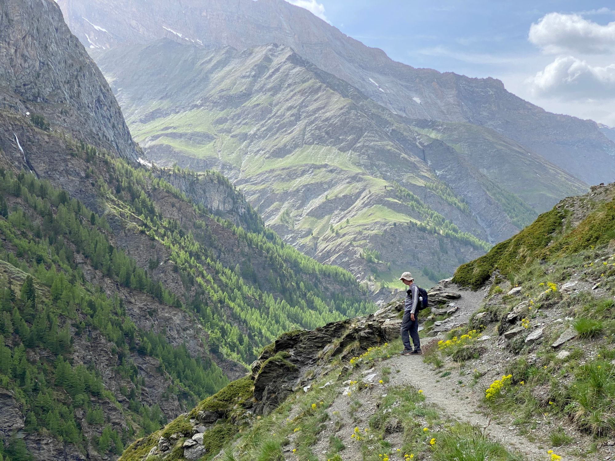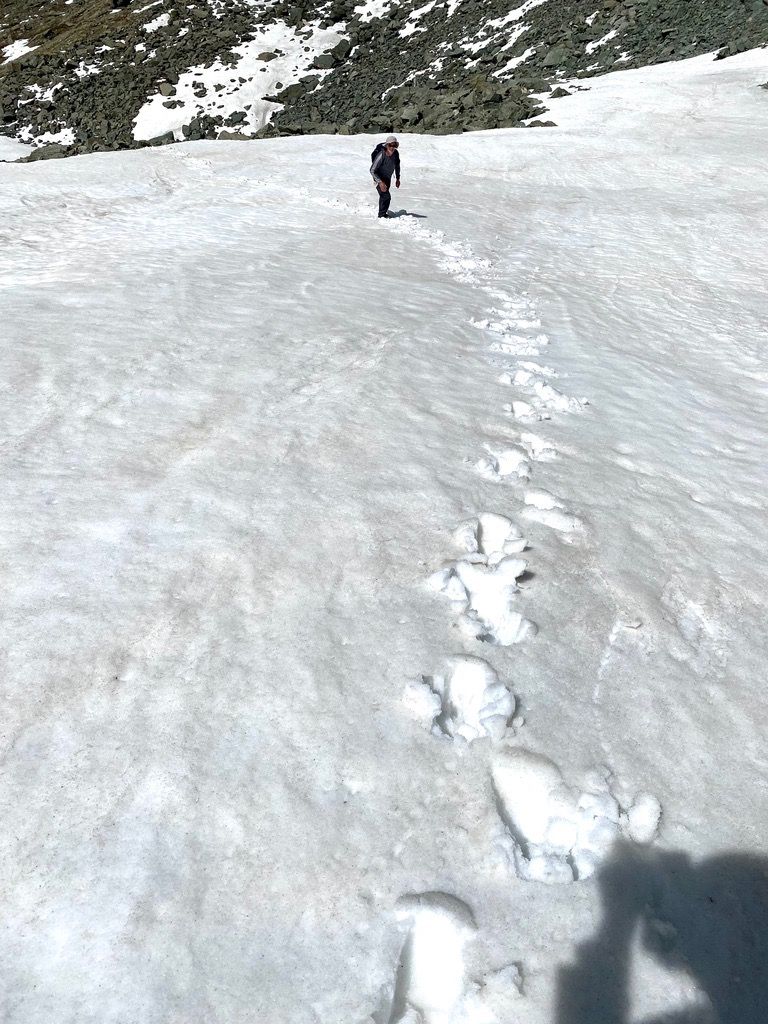 The partially snow-covered and steeper trail on the Italian side of the Alps |
