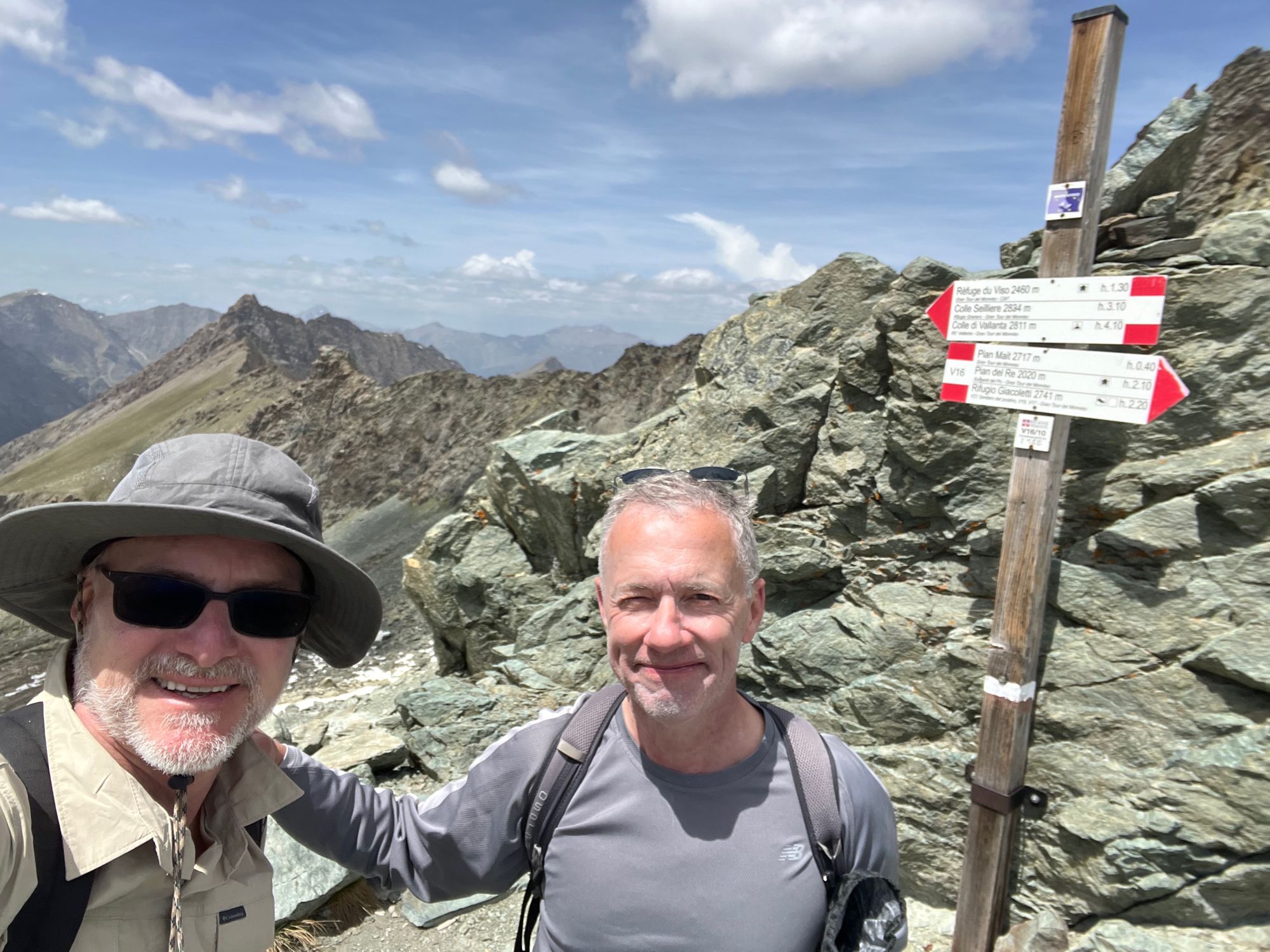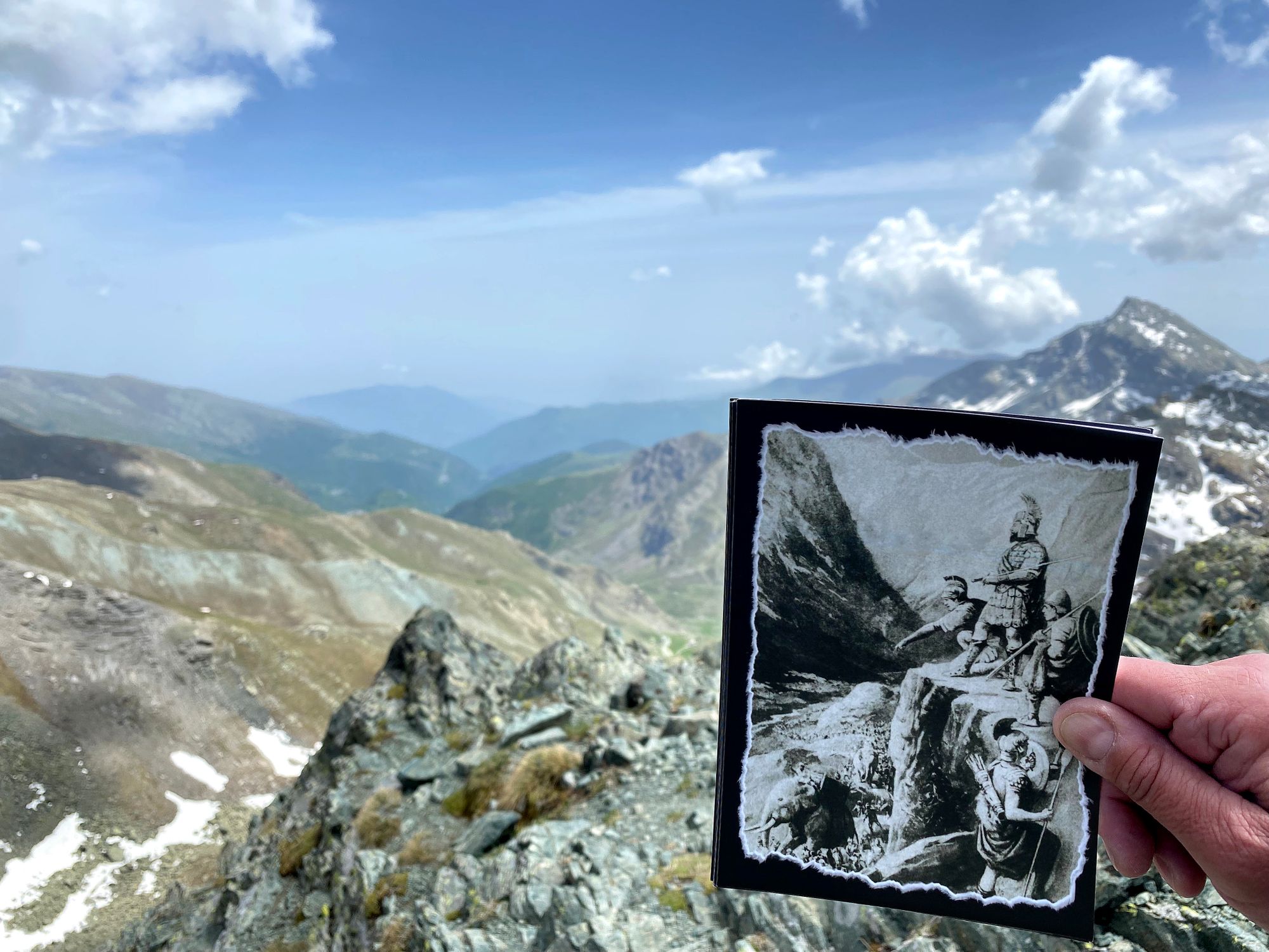 My voice labored, my boots crunching on the gravel path, a wind picking up, I reached the summit marker and looked down into Italy and the Po Valley many miles away. Al was right behind me, and I recorded him, a big grin on his face, and the elation of having overcome a trial of ice, snow, rock and almost 4,000 feet in elevation gain to make it to this place where one of ancient history's great leaders urged his depleted and utterly exhausted army on and into the unknown of the upcoming campaign against Rome that would last 16 years. We shook hands and then hugged and then just admired the shear beauty and magnificence of the Col de la Traversette.