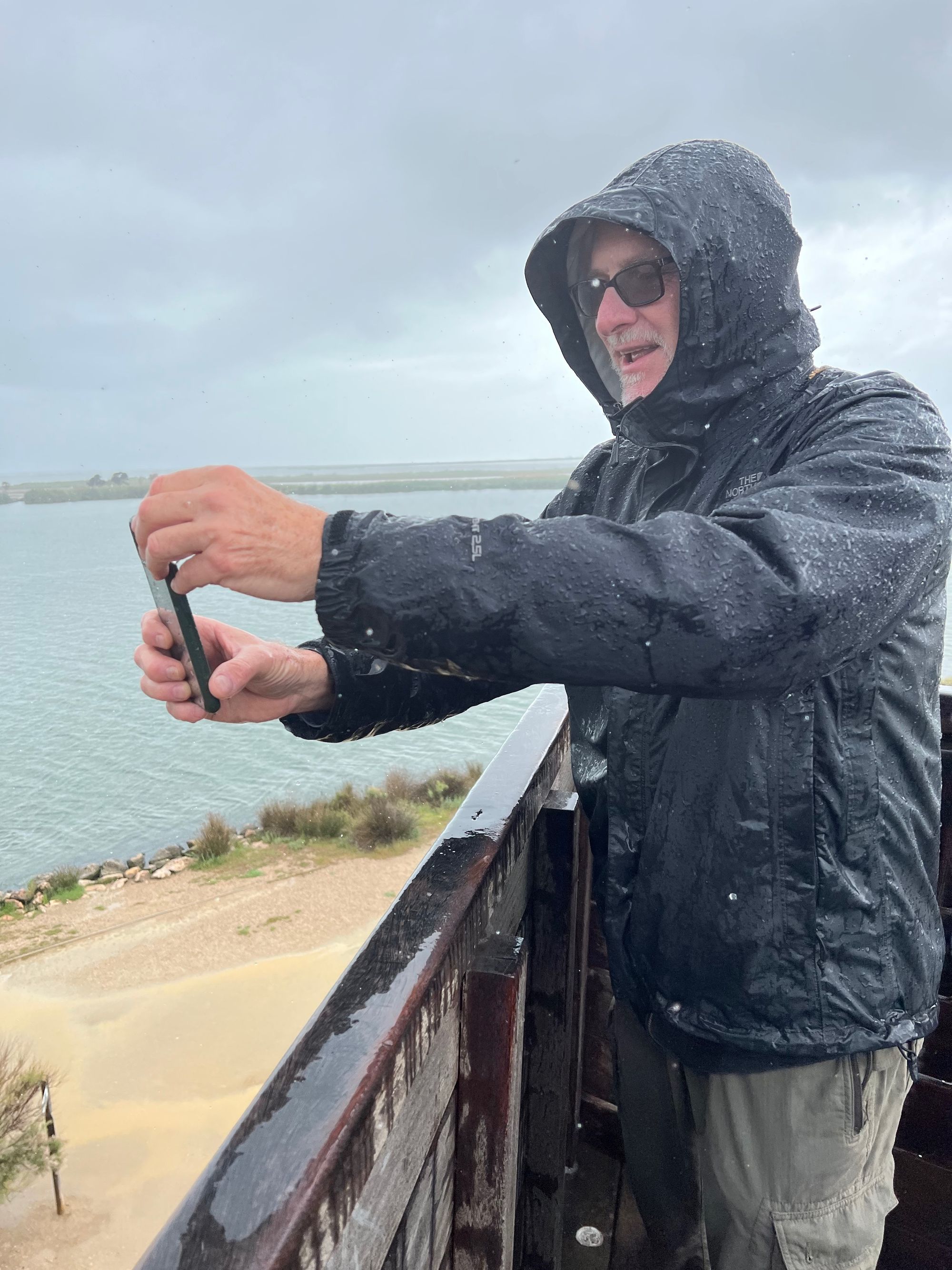 "It was now raining pretty hard when we parked at the end of the road. I had seen a tower on Google Maps and strange art type displays and thought that we could park there. Just was we opened the back hatch to don rain gear a tremendous thunder and lightening bolt struck in the vicinity. It was scary and both Al and I were concerned about proceeding in the open to the tower hundreds of meters away.