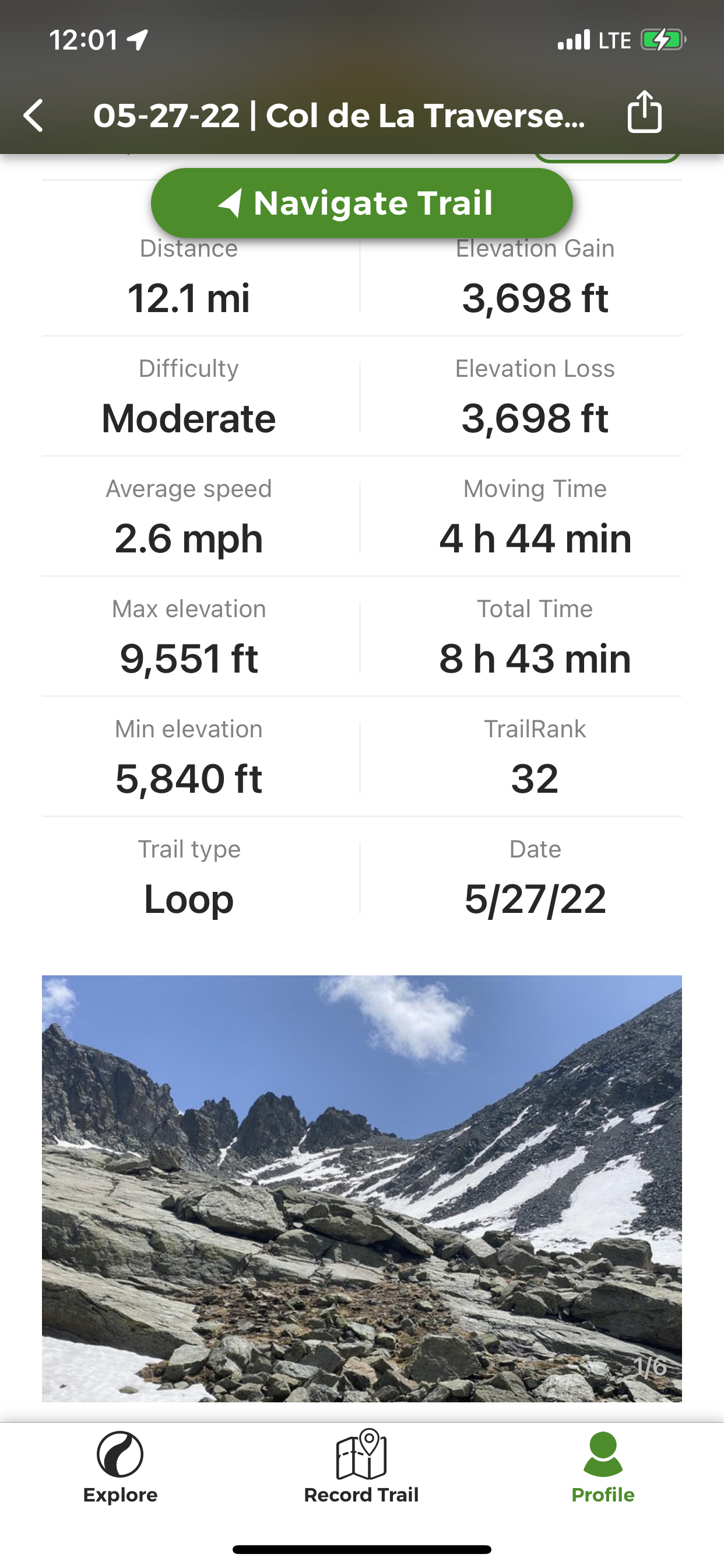 "After about 30 minutes we were faced with a large snow field that either had to be crossed or continue up the rocks until another smaller snow field. It would keep us on the wrong side of the marked trail that was somewhat visible now. I proposed taking our chances and cross the large snowfield and then climb to where the trail was. Al had crossed the snow down below and agreed this was the best approach. I went first and first my footing was good on the icy surface. I was wearing hard leather hiking books and was able to dig into the soft ice as I sidestepped up the steep surface....edging upwards and across the snow field. Al followed a safe distance and halfway across near where a boulder slightly broke the surface, I sunk in halfway up my thighs. I freed myself and diverged away from the boulders and the footing improved. Soon I was on the other side and I scrambled up to the trail and rested and waited for Al." journal excerpt 05-27-22