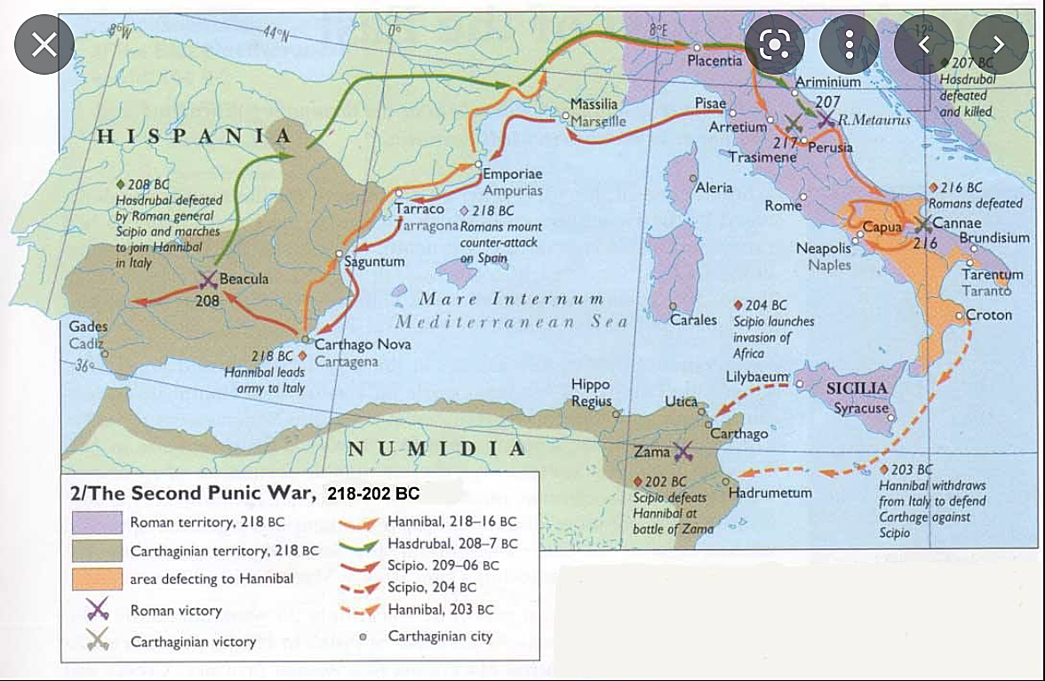 Map of the western Mediterranean depicting the Second Punic War | Hannibal Trail to Italy is marked in orange