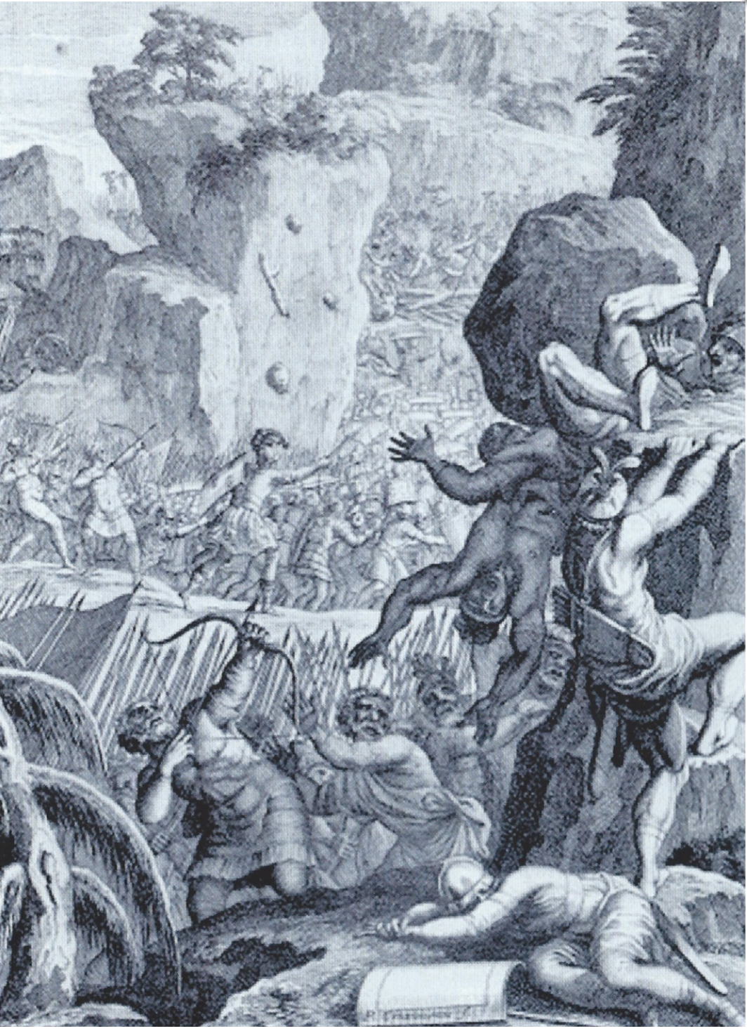 Hannibal's army was stuck. Stones were rolled down from the cliffs, burning logs and arrows rained down on the soldiers. Men and pack animals panicked and lost their footing, plunging off the precipitous paths. Others were crushed and burned. With the boulder obstruction finally removed, the column moved forward as night fell.