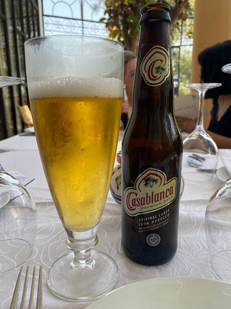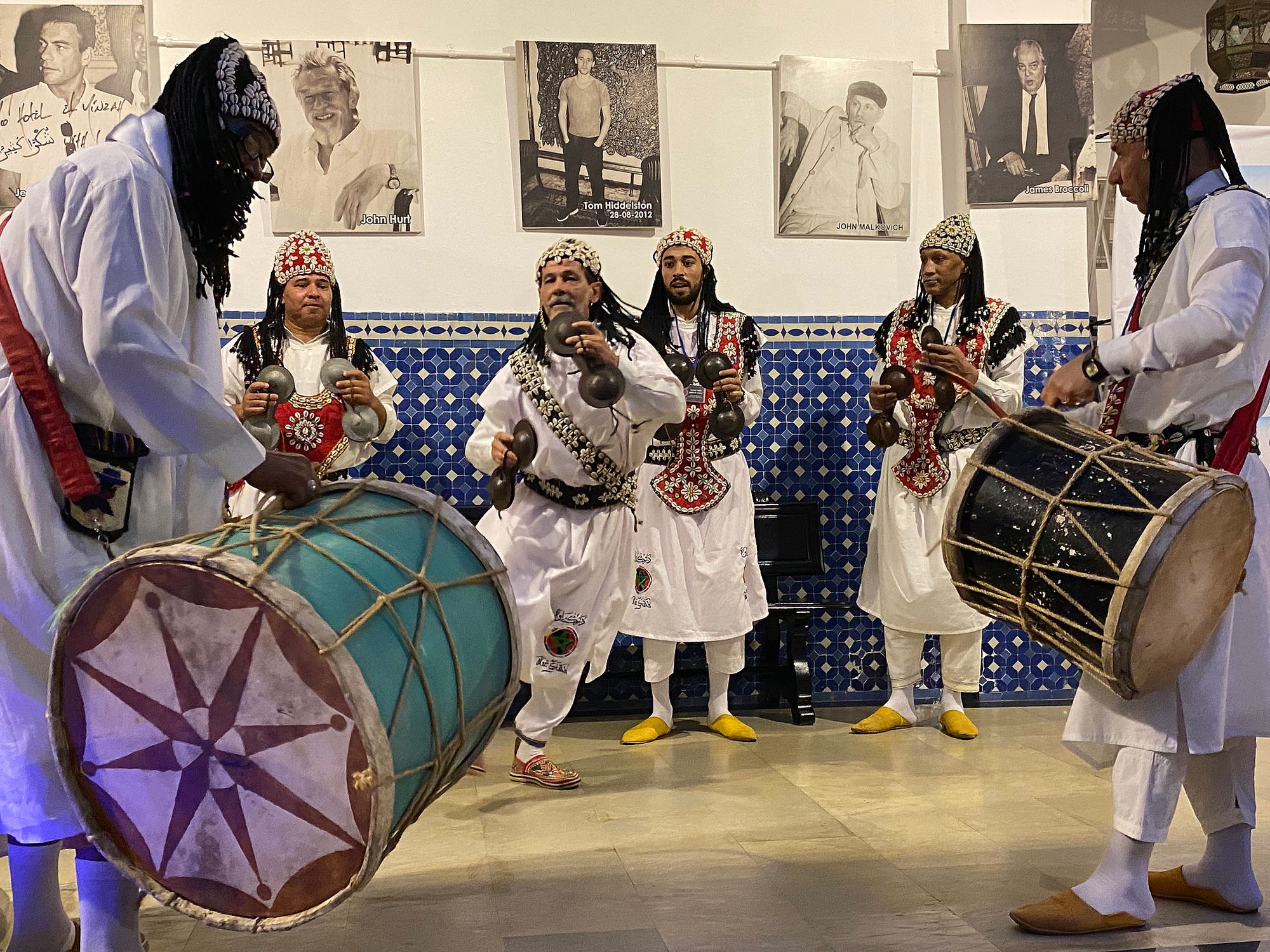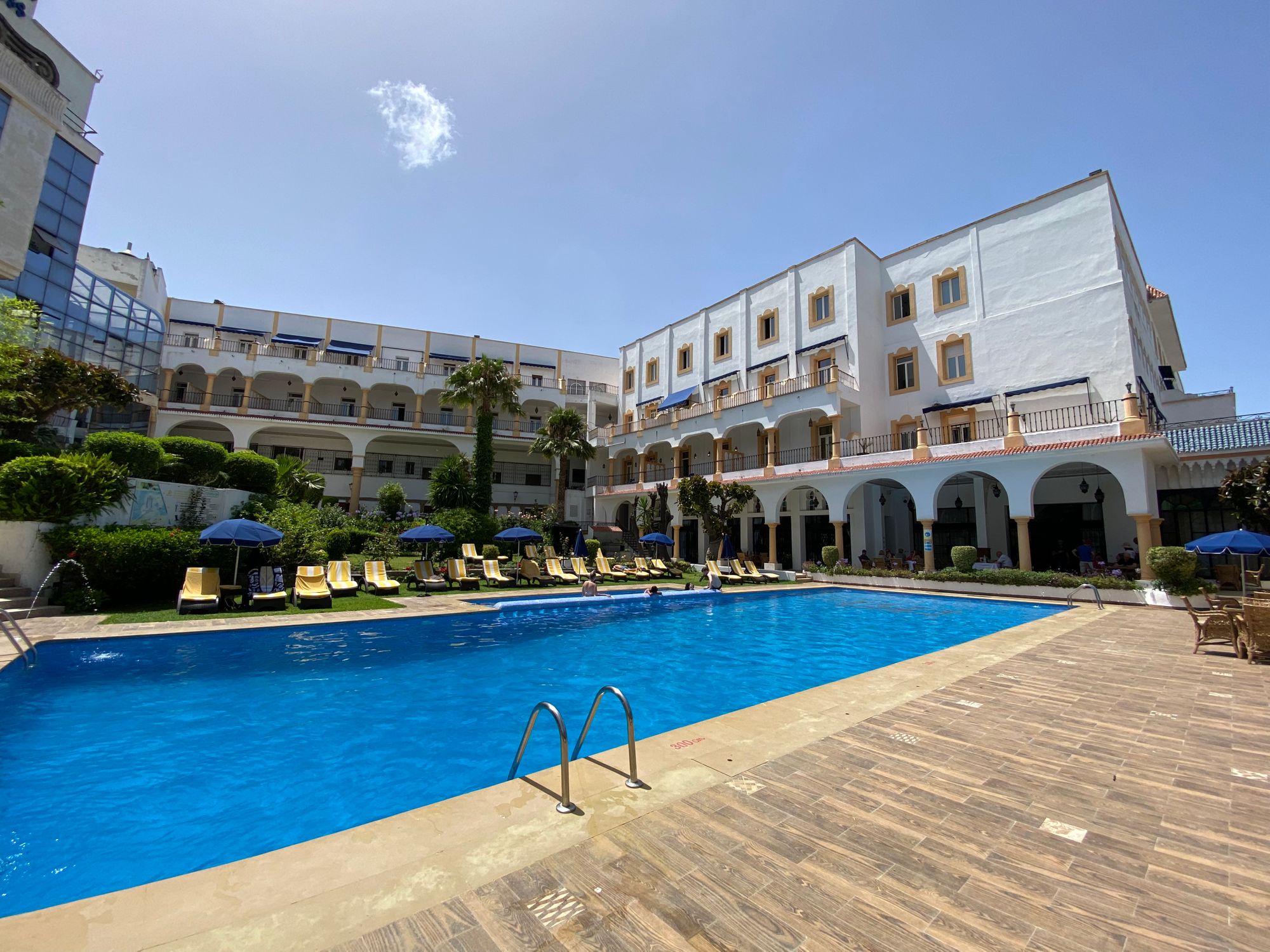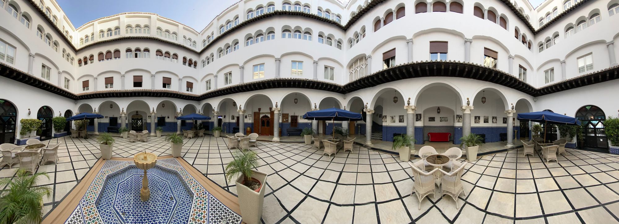 El Minzah Hotel | Jajouka dancers | AST gala and belly dancer | the view from my room - Spanish coast in distance - left | Casablanca beer | interior courtyard | pool