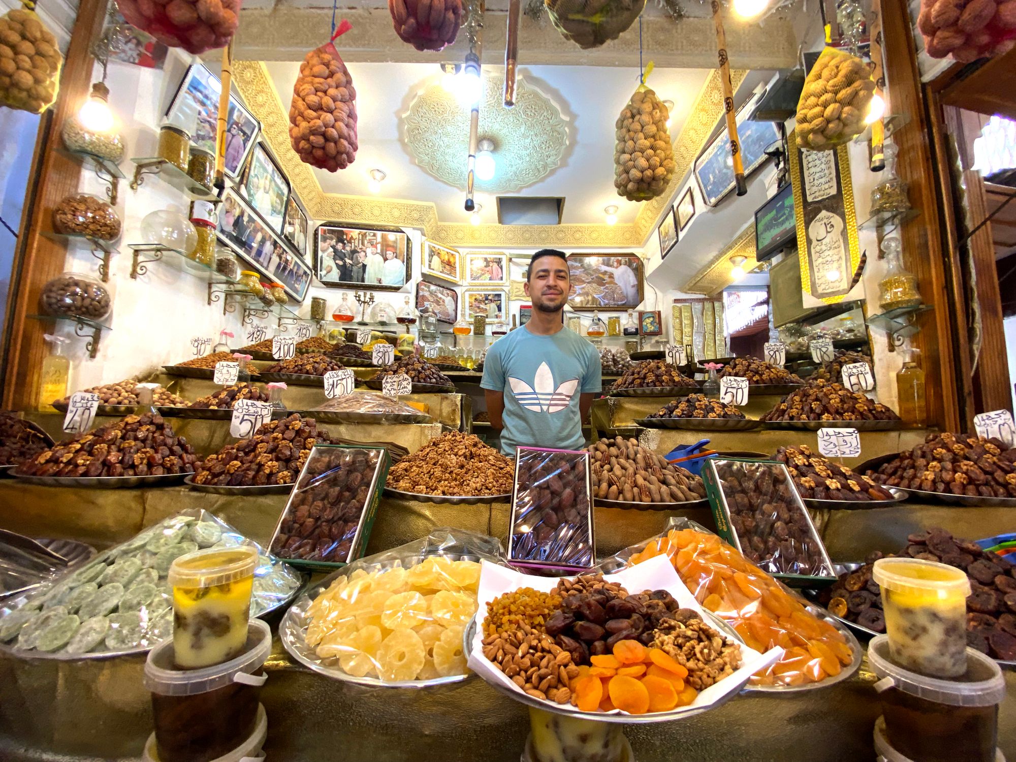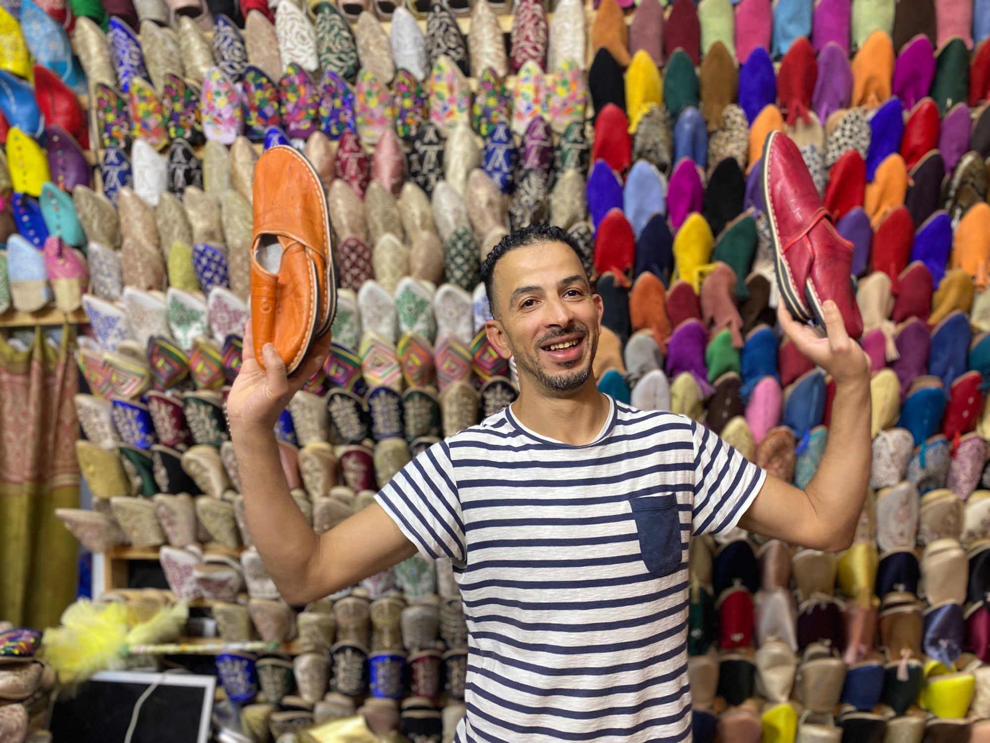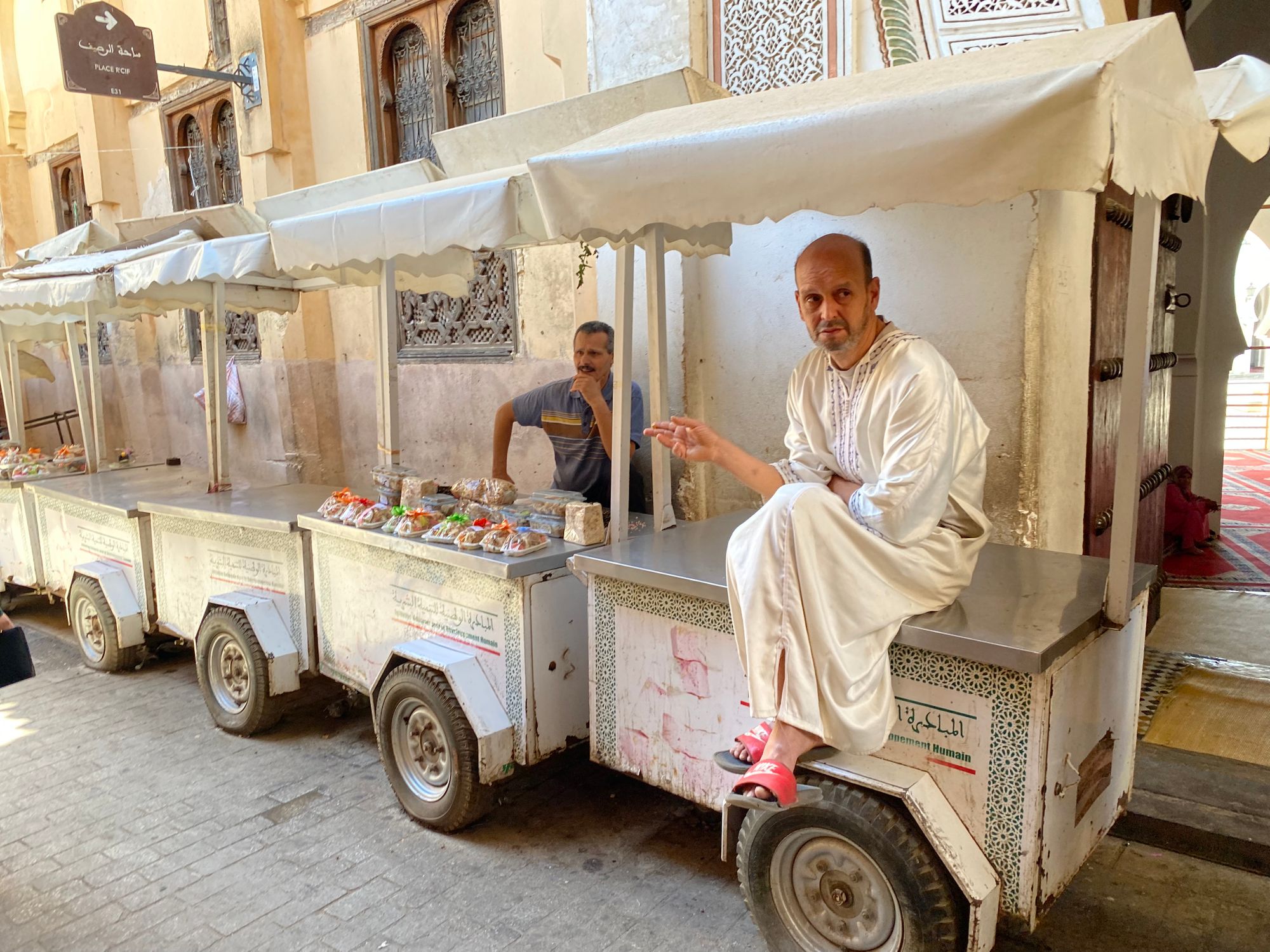 mobile pastry man | Ilham - Salon de The | babouche salesman | silk thread maker | Ayoub - dried fruit shop keeper | residents outside mosque entrance | riad porter | baker