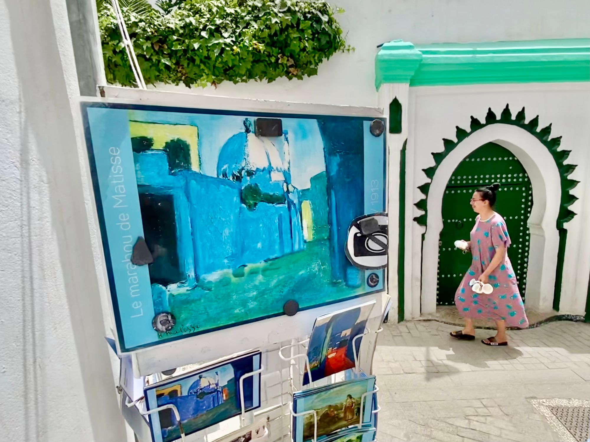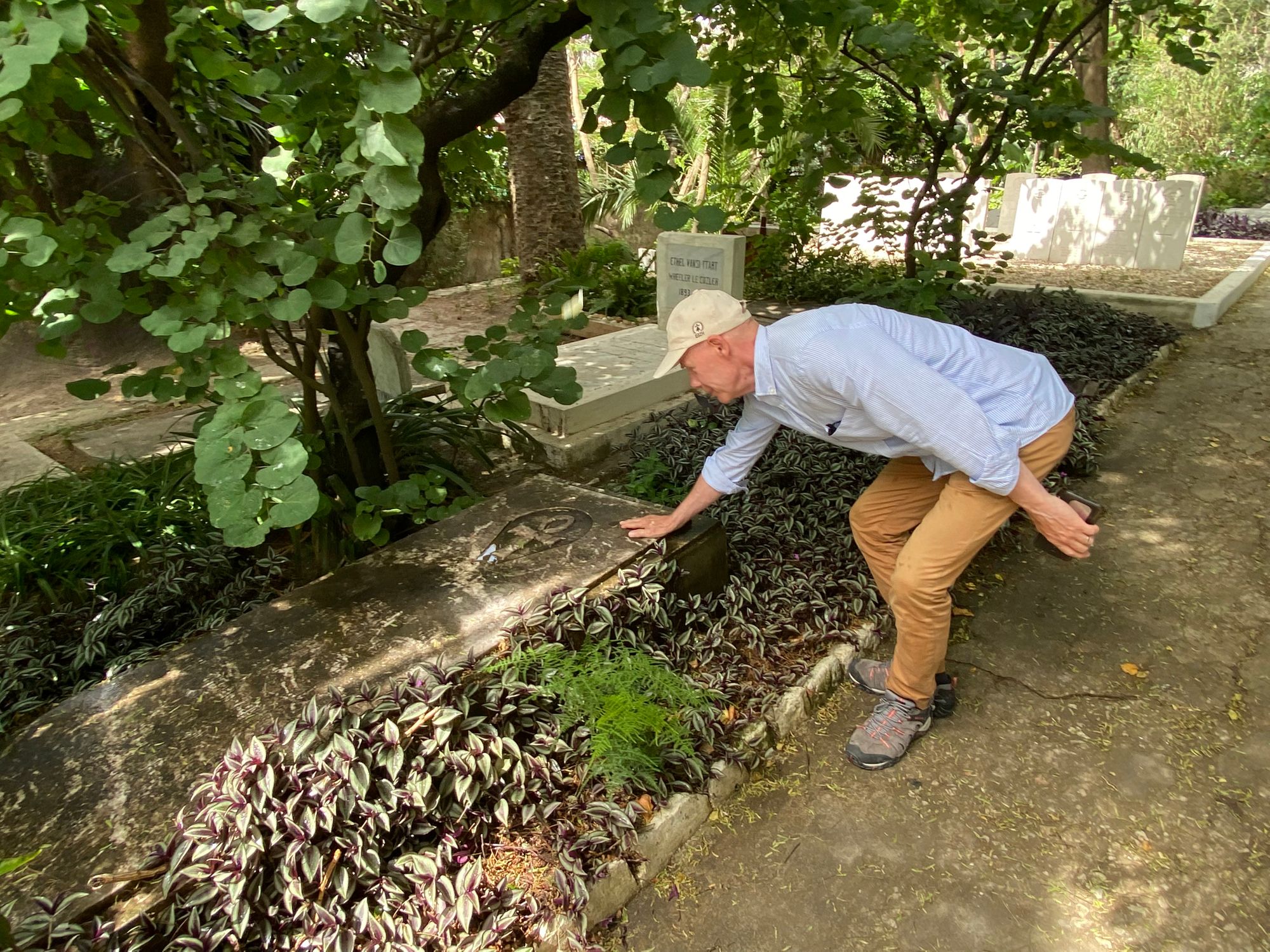 AST alumni Mike Van der Meer touches the headstone of his grandfather who ran the Villa de France hotel | Matisse reproduction and location in Grand Socco bazaar