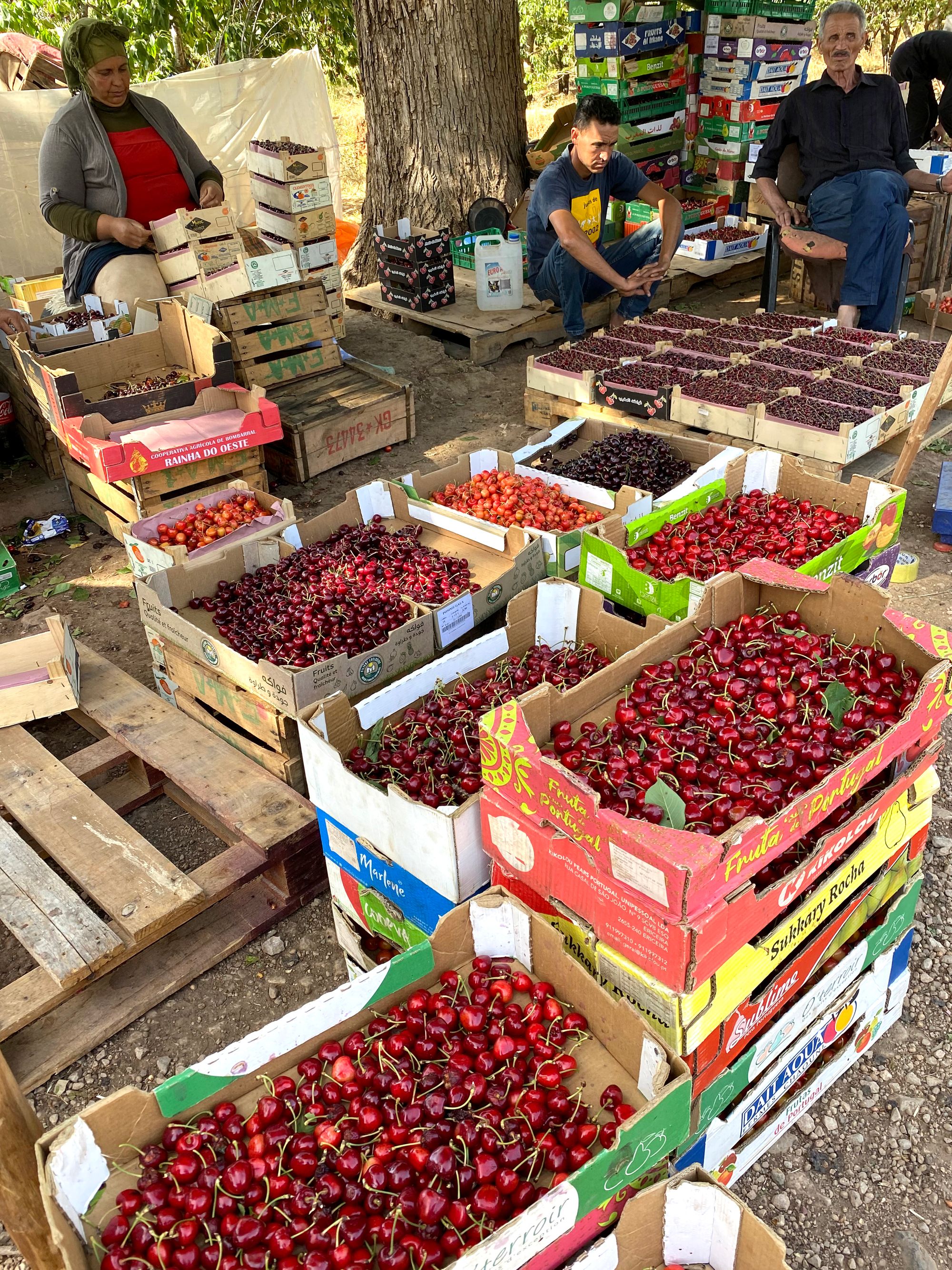 After a very magical time in the Sahara, we headed back into the mountains through rocky gorges with scattered river oases and up into ancient cedar trees and forests with Barbary Apes. At one point a car in front of us started throwing out baguettes to canines waiting along side the road which we called "Dog Alley". We sped along passing shepherds and nomad encampments, but did finally stop for cherries |
