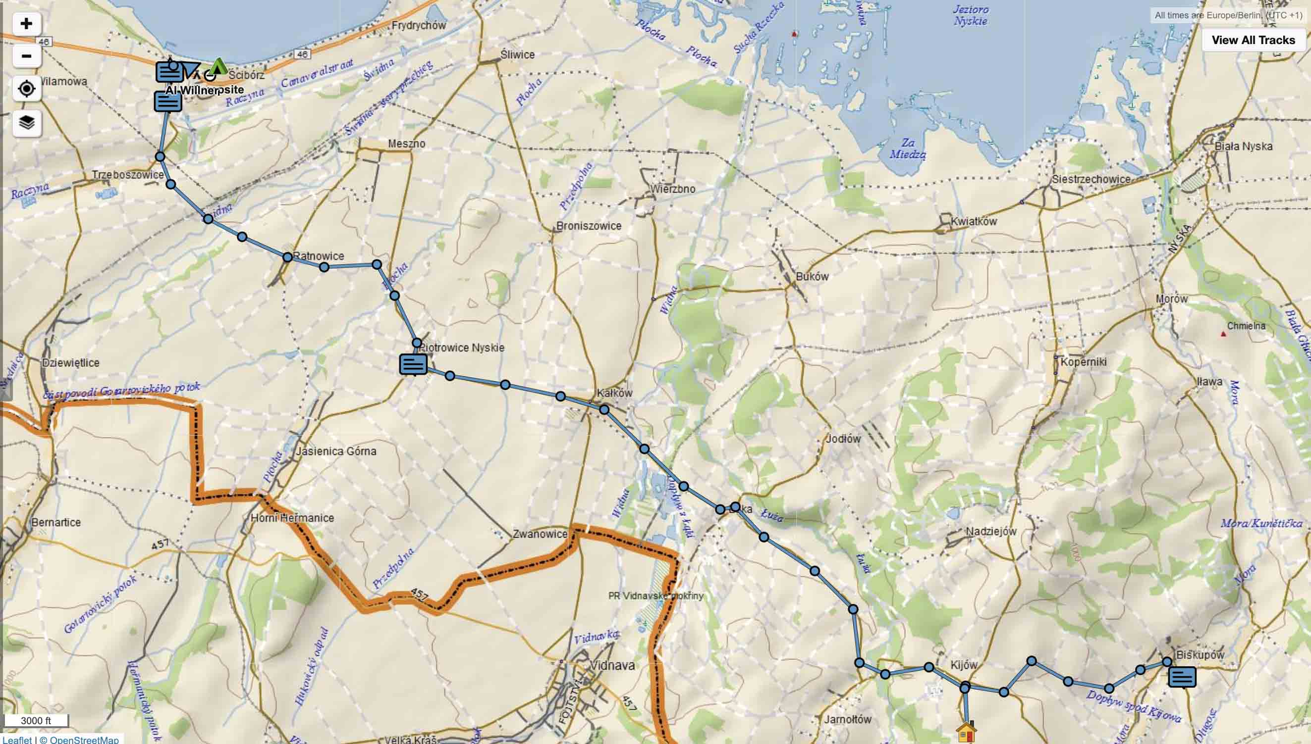 Al and Mike accompany by Marciej and Rudy walk from Jarnoltow to Sciborz. I locate them using Al's GPS uploads that tracks them every 10 minutes. At 4pm they start to scout a location to camp.
