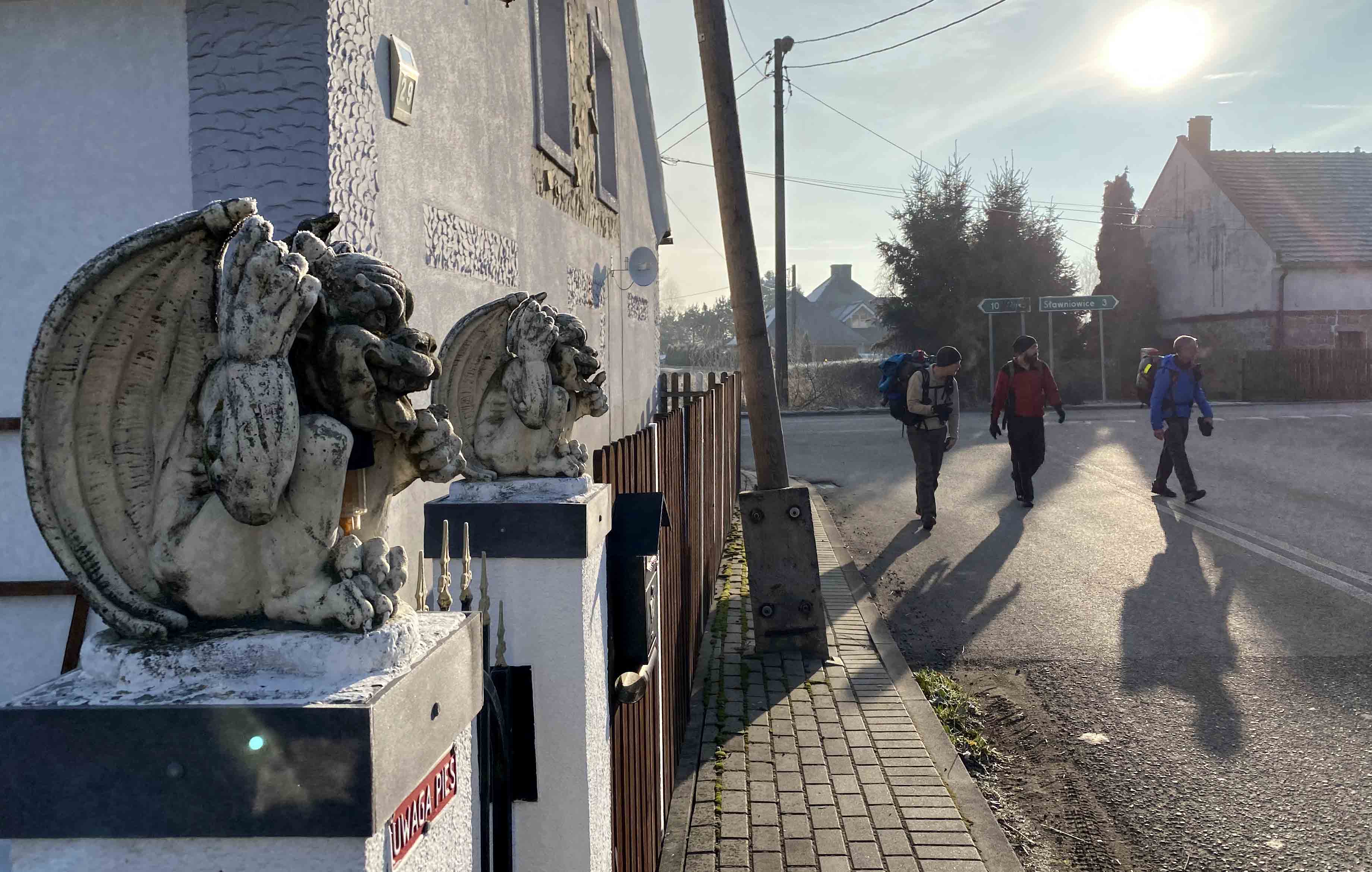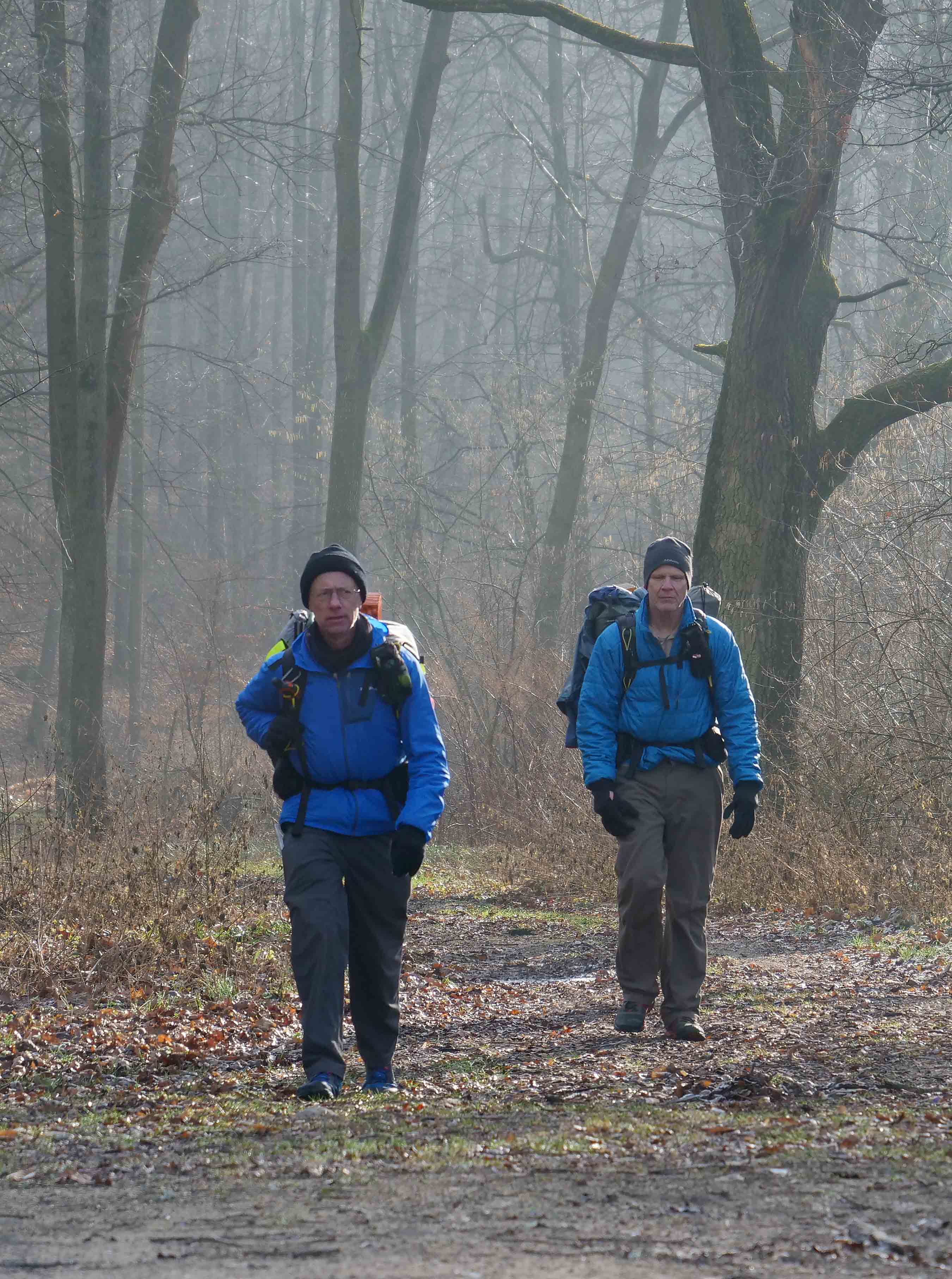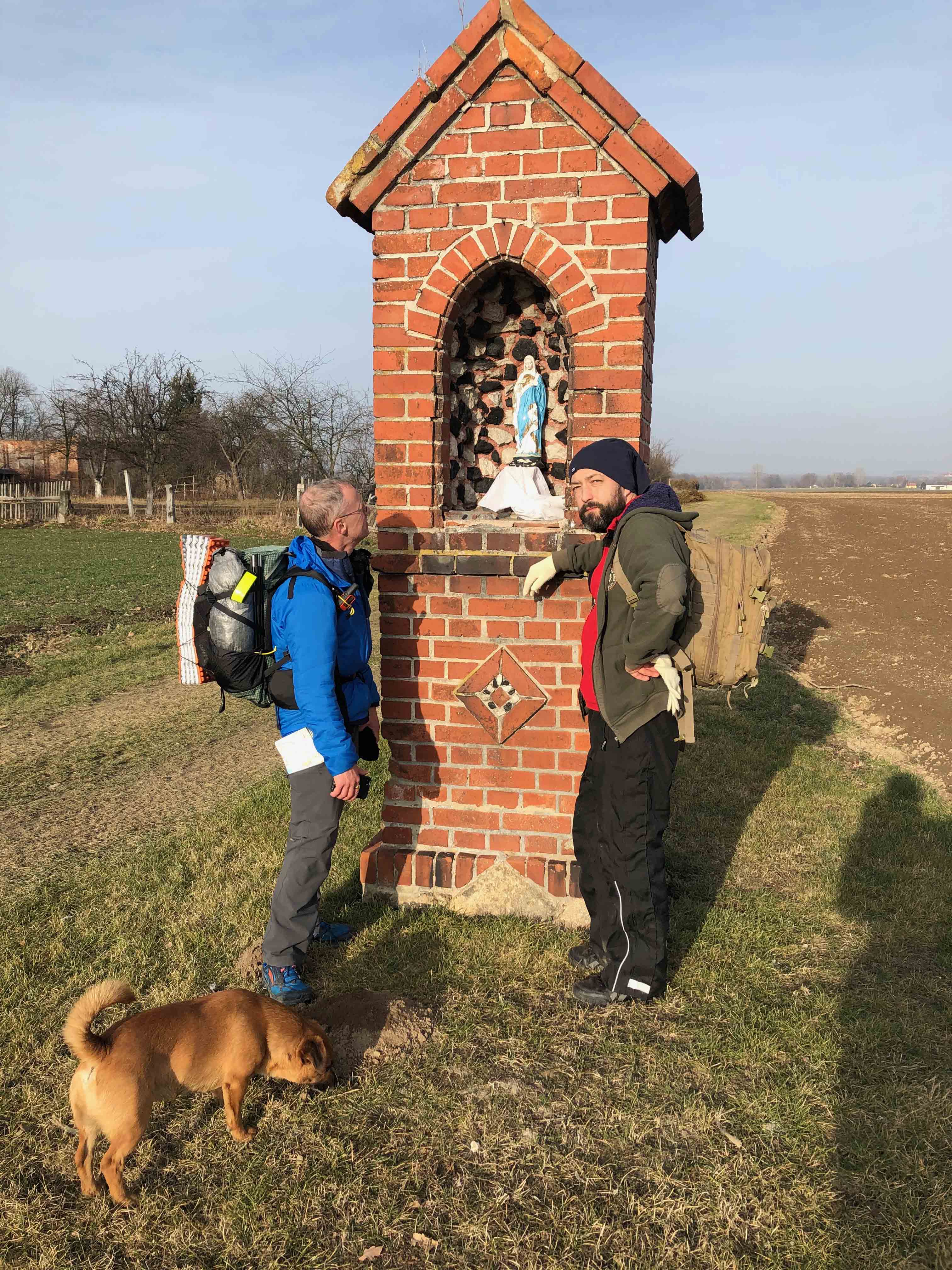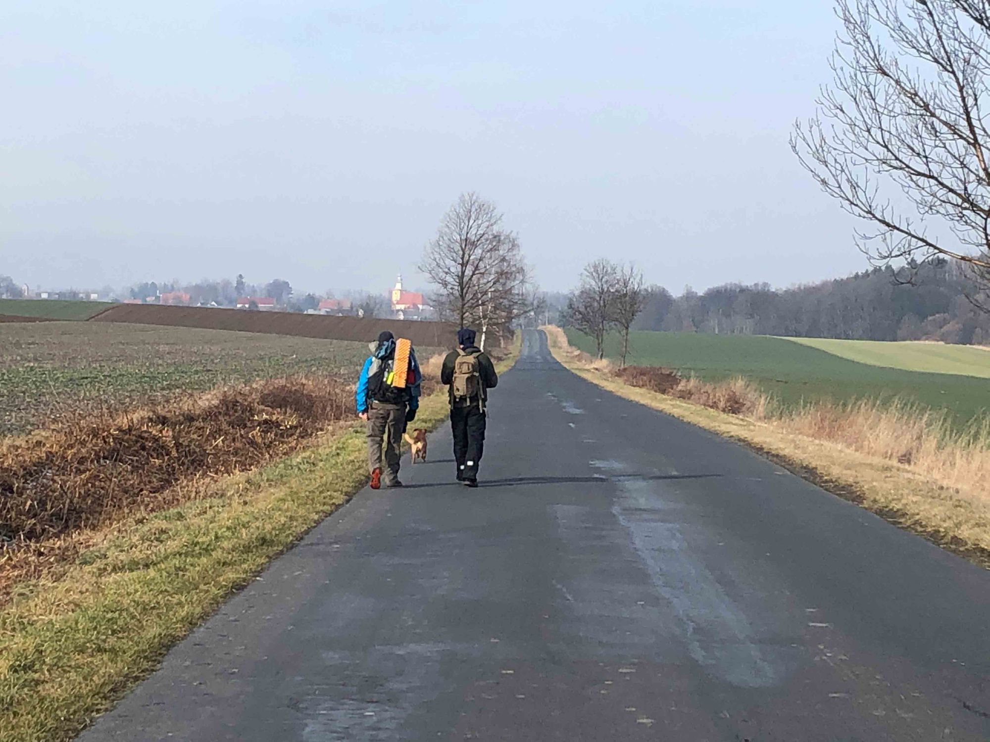Al and Mike along with Maciej Szop and his dog Rudy walked 15 miles in moderate above freezing temperatures along a hilly route eventually finding a camping spot next to Lake Otmuchowskie.