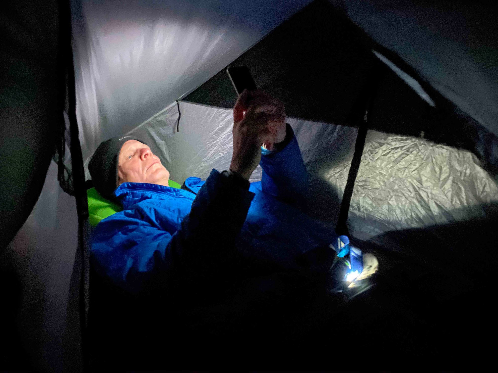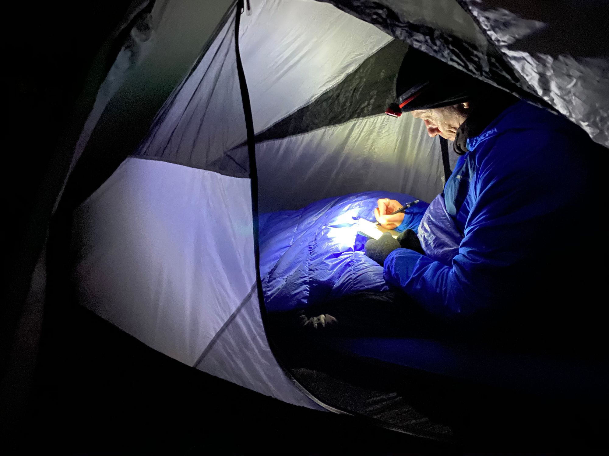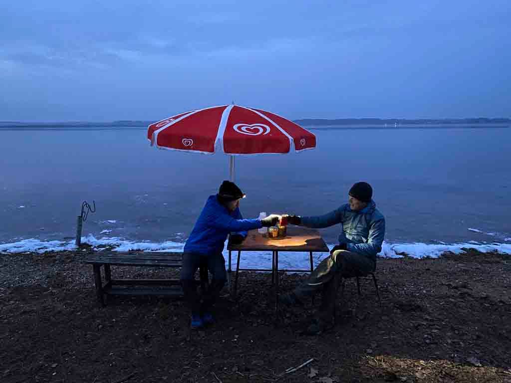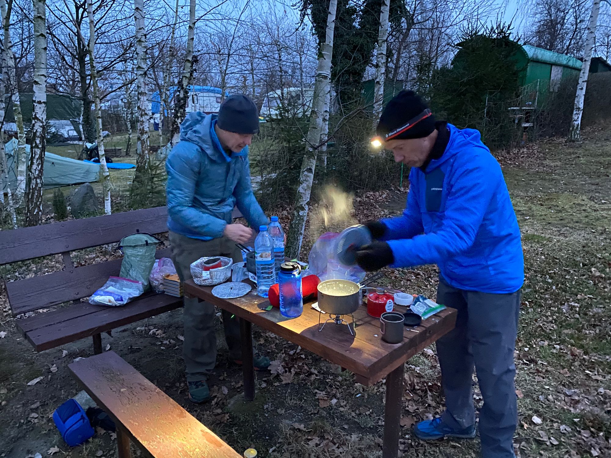4:30 pm: After reconnoitering along Lake Otmuchowskie for a wind protected location they set up camp and cook a meal of teriyaki chicken and salmon by pouring boiling water into food pouches. After a toast to a long day's walk, Al beds down to write in his journal and Mike checks his phone.
