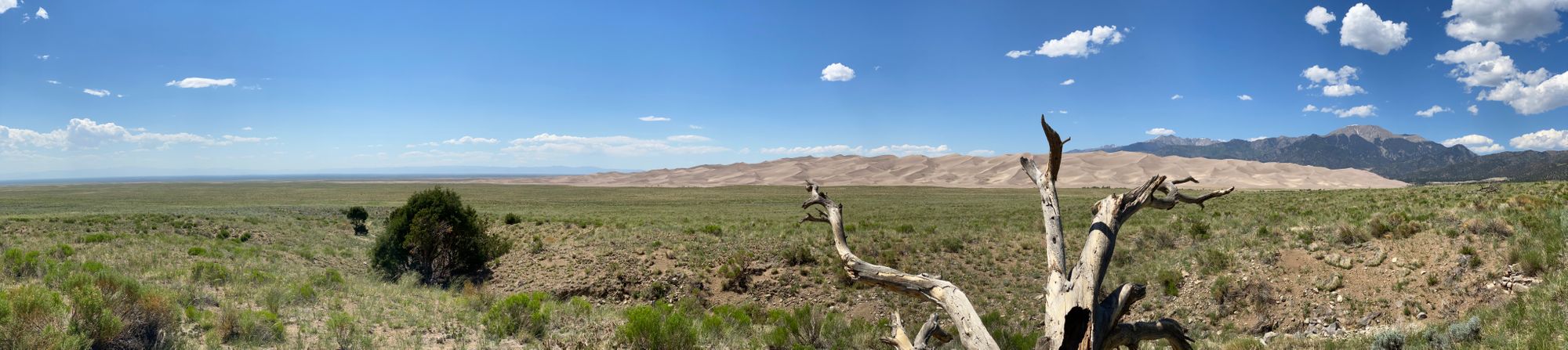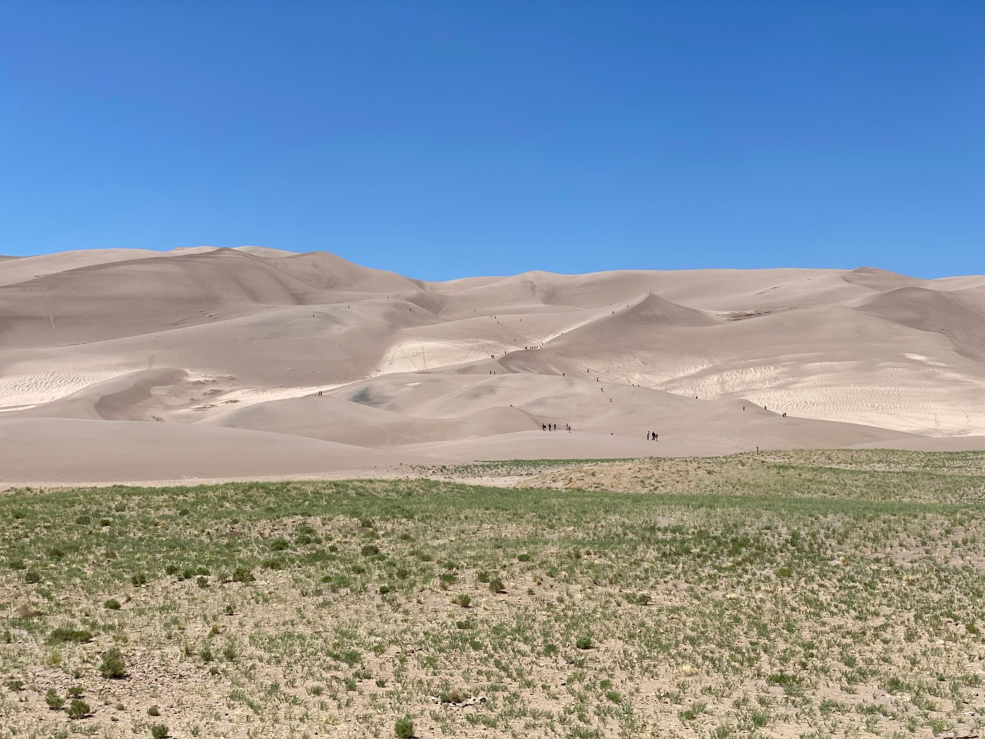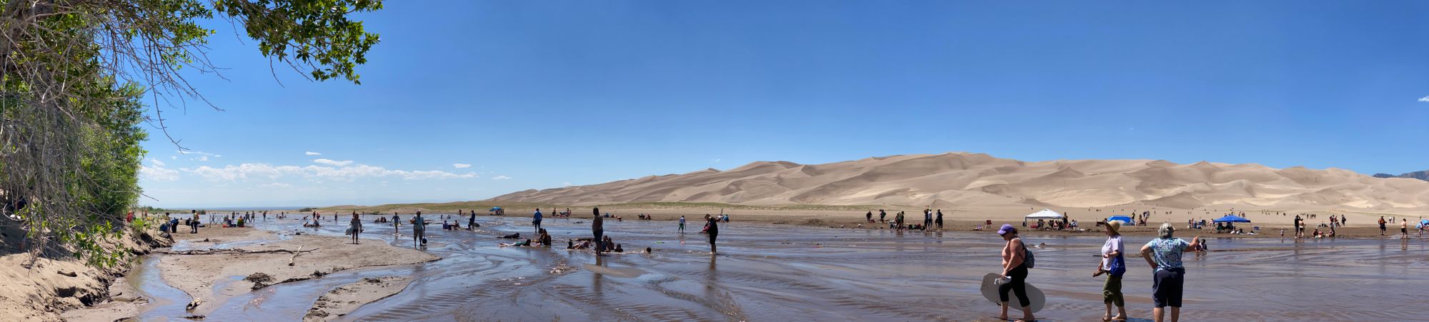 After bidding goodbye to the Willners, we headed to Great Sand Dunes National Park and Preserve. What an amazing place. Huge sand dunes, hundreds of feet high at the base of 12 thousand feet mountains with a very wide creek only inches deep, but 50 feet wide running along the edge of the dunes. The park was totally packed as people emerged from the awful year and half long pandemic.