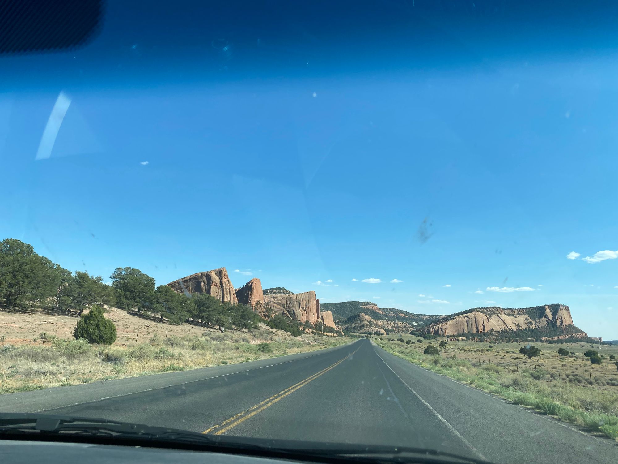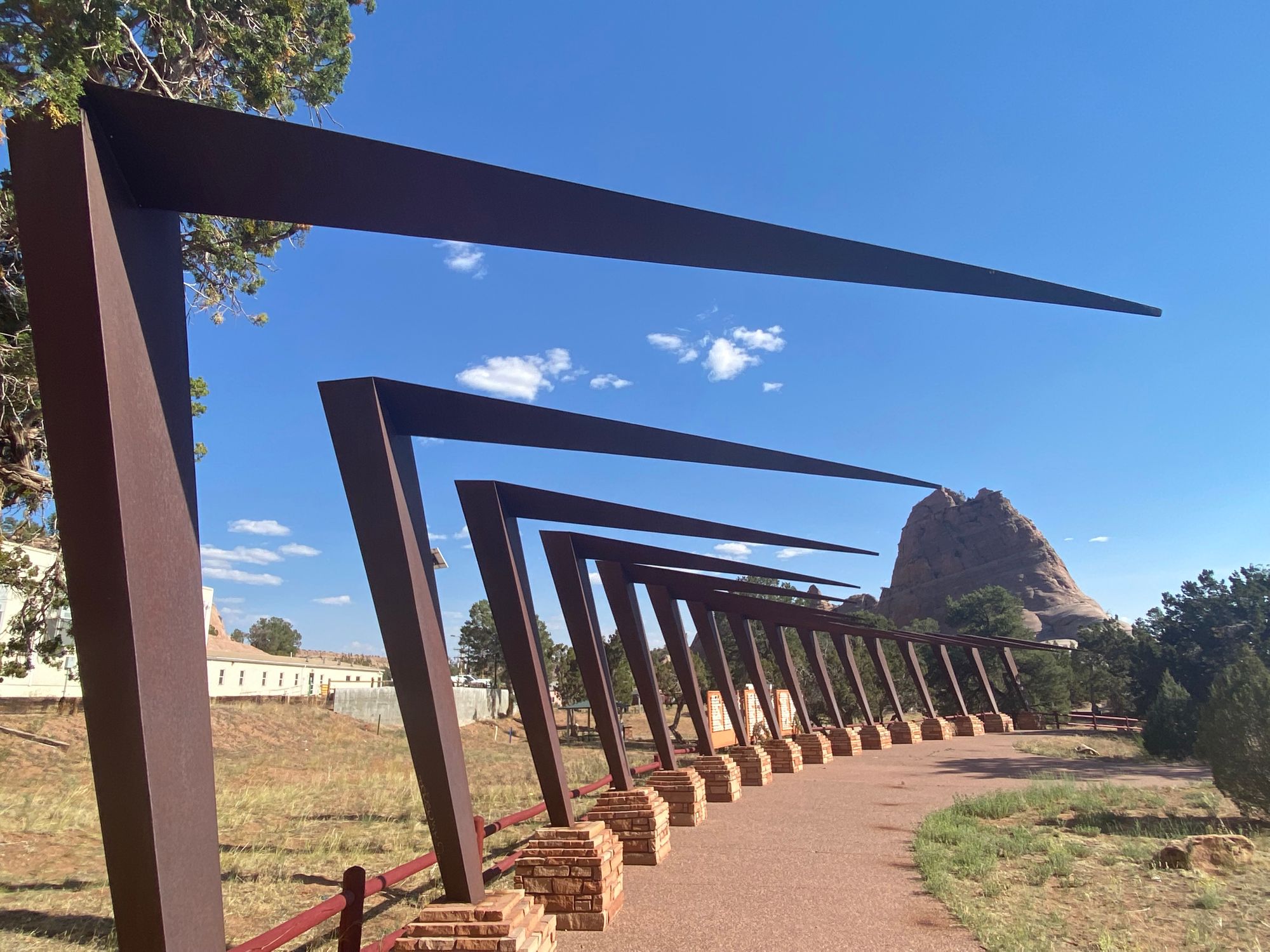 Back on the road, I had wanted to visit Four Corners (where Colorado, Utah, Arizona and New Mexico meet). There is a picture of me some 50 years ago, standing on the spot during one of our road trips with dad and last time I had been there. Unfortunately, like most Native American reservation sites it was closed due to the pandemic. So instead of heading north around Grand Canyon we headed south and skirted the boarders of Arizona and New Mexico, driving through Navajo country around Canyon Chelly. Blazing hot and very desolate but beautiful landscapes and monumental geological formations. And very poor roads. This could be an incredible visitors destination and could not understand why it had not been promoted by the reservation. I later learned from a Commanche about the difficulties and restrictions of the federal government administered Native American lands. No time to stop for photos so Mona took a few snaps from the car. Did stop at Window Rock, the Navajo people's administrative headquarters and location of the Code Talkers WWII veterans memorial.
