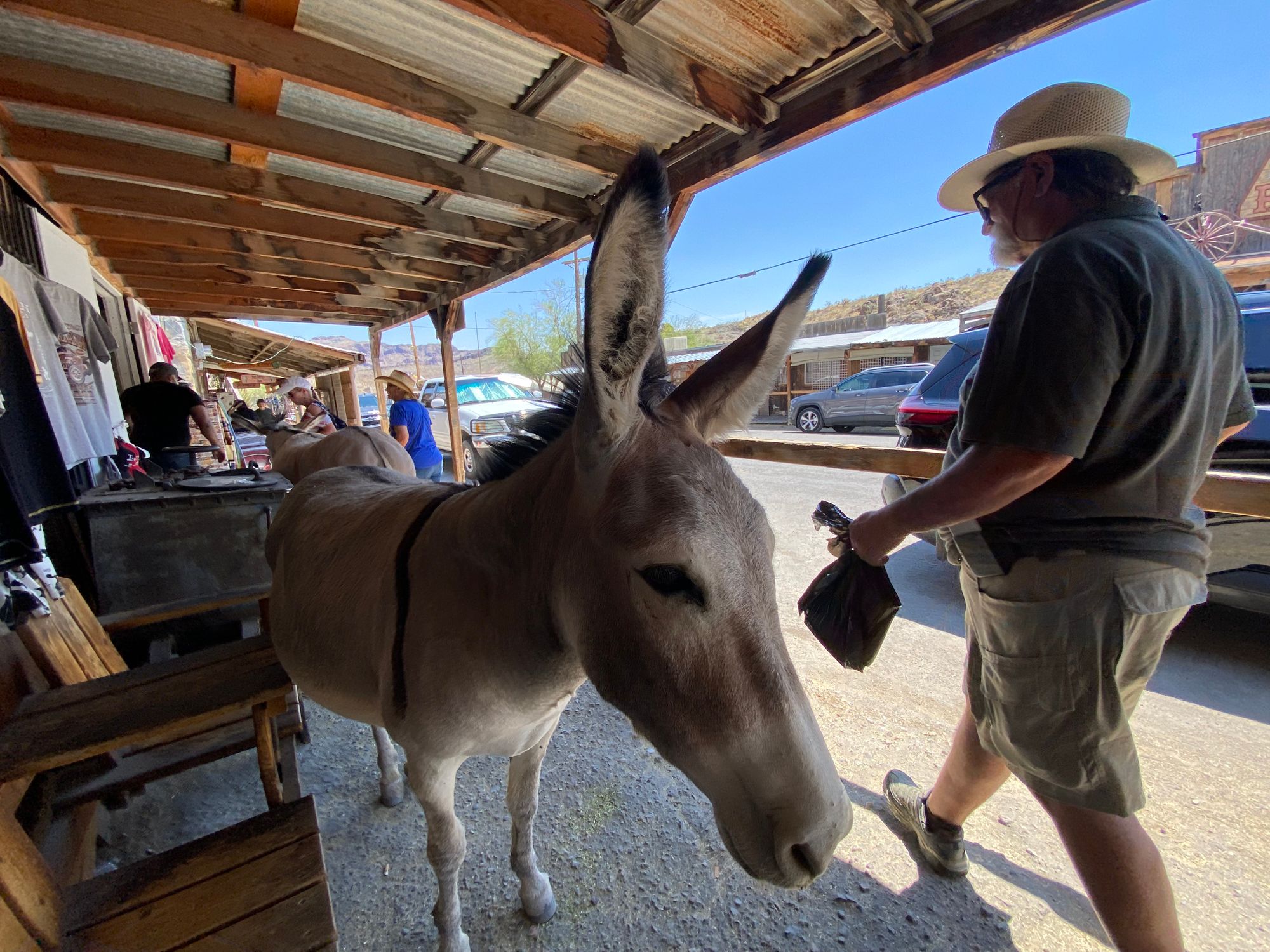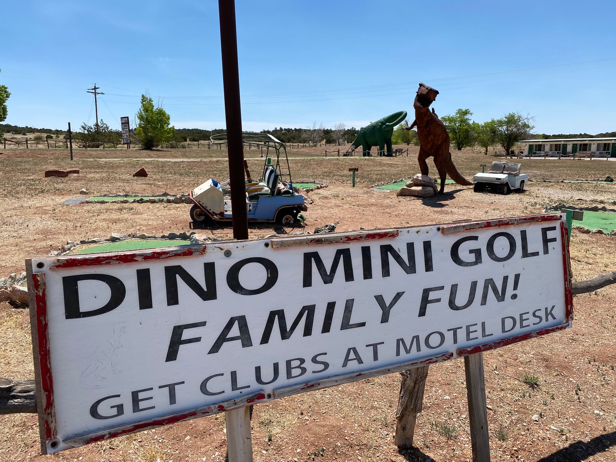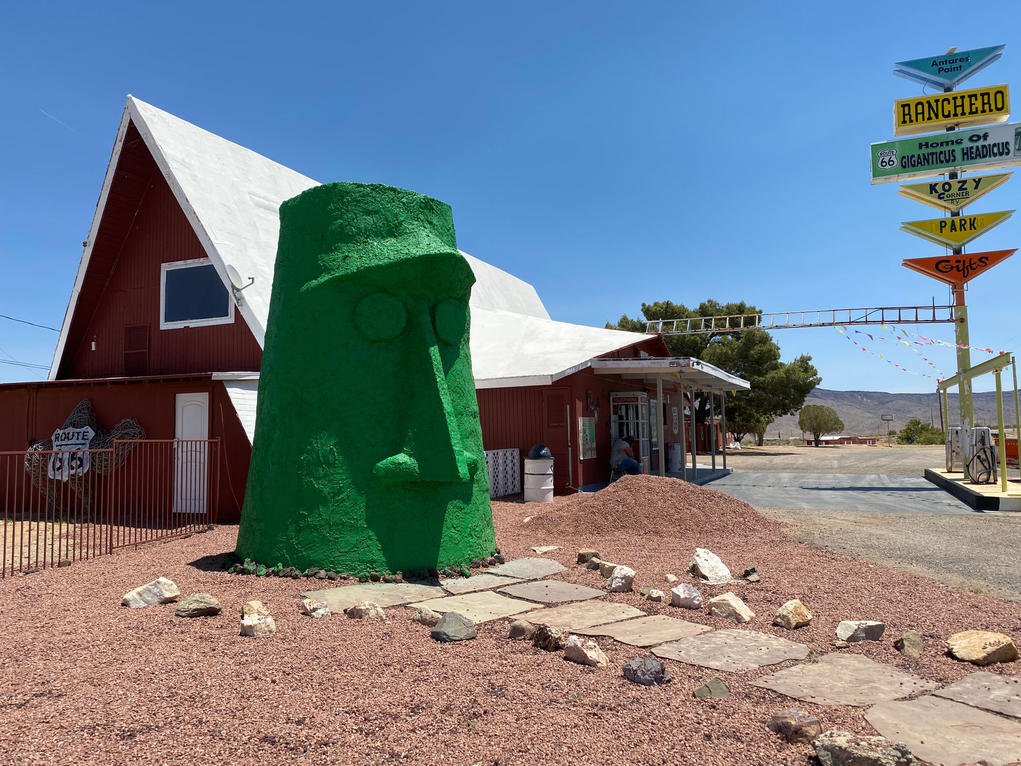 Route 66 scenes | Seligman hotel renovations | Oatman donkey and Dollar Bar | abandoned mini golf near Grand Canyon Caverns Grotto | Giganticus Headicus and gas station at Antares | Ramada Inn entrance in Kingman