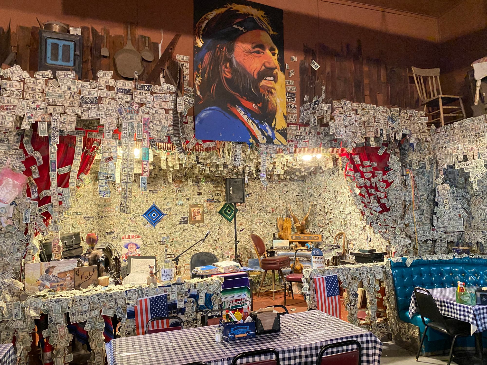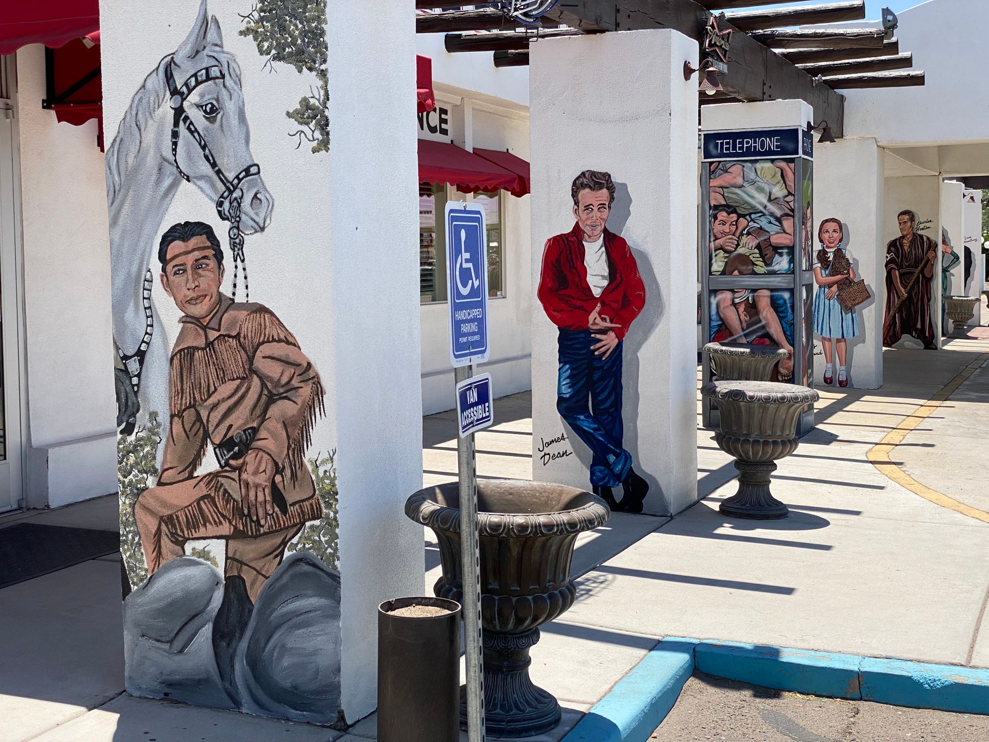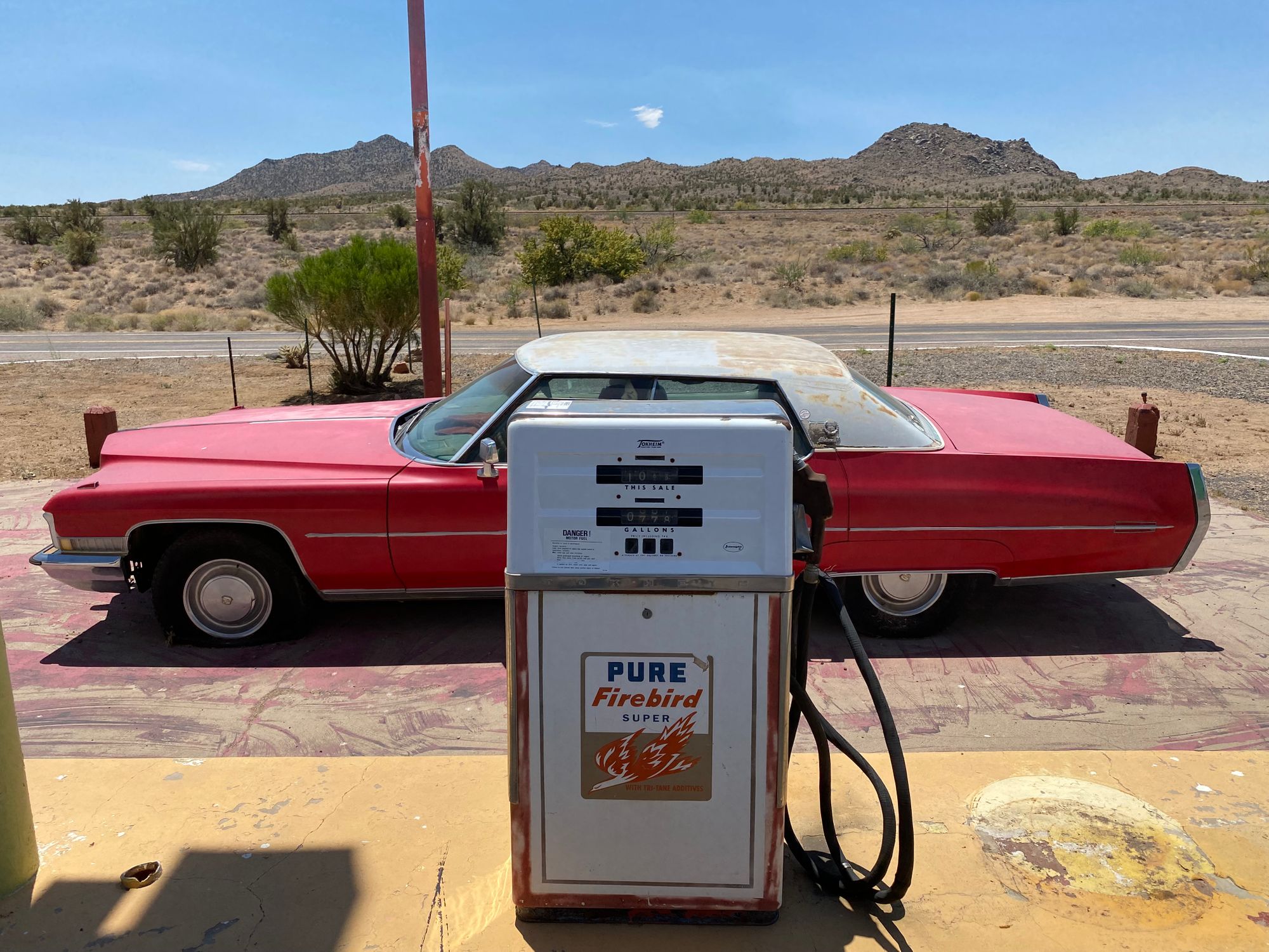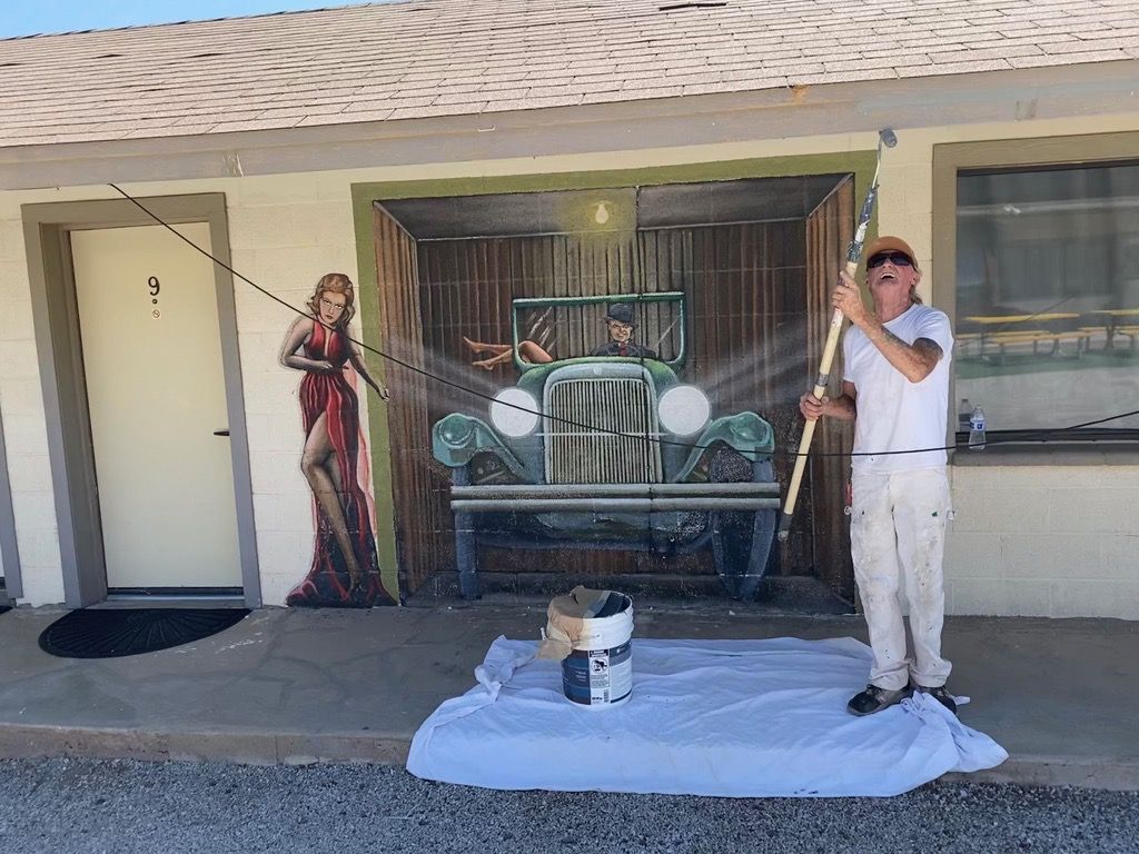 Route 66 scenes | Seligman hotel renovations | Oatman donkey and Dollar Bar | abandoned mini golf near Grand Canyon Caverns Grotto | Giganticus Headicus and gas station at Antares | Ramada Inn entrance in Kingman