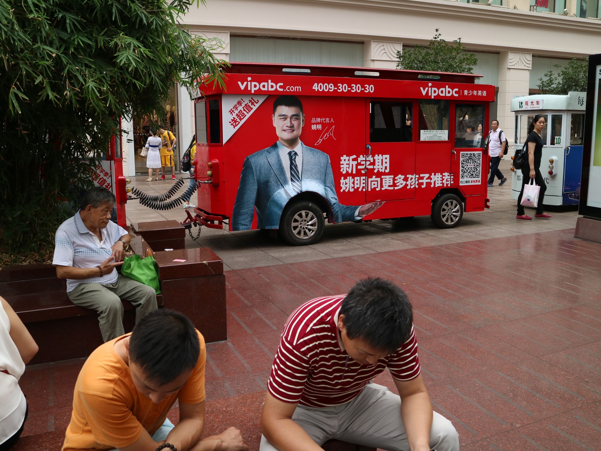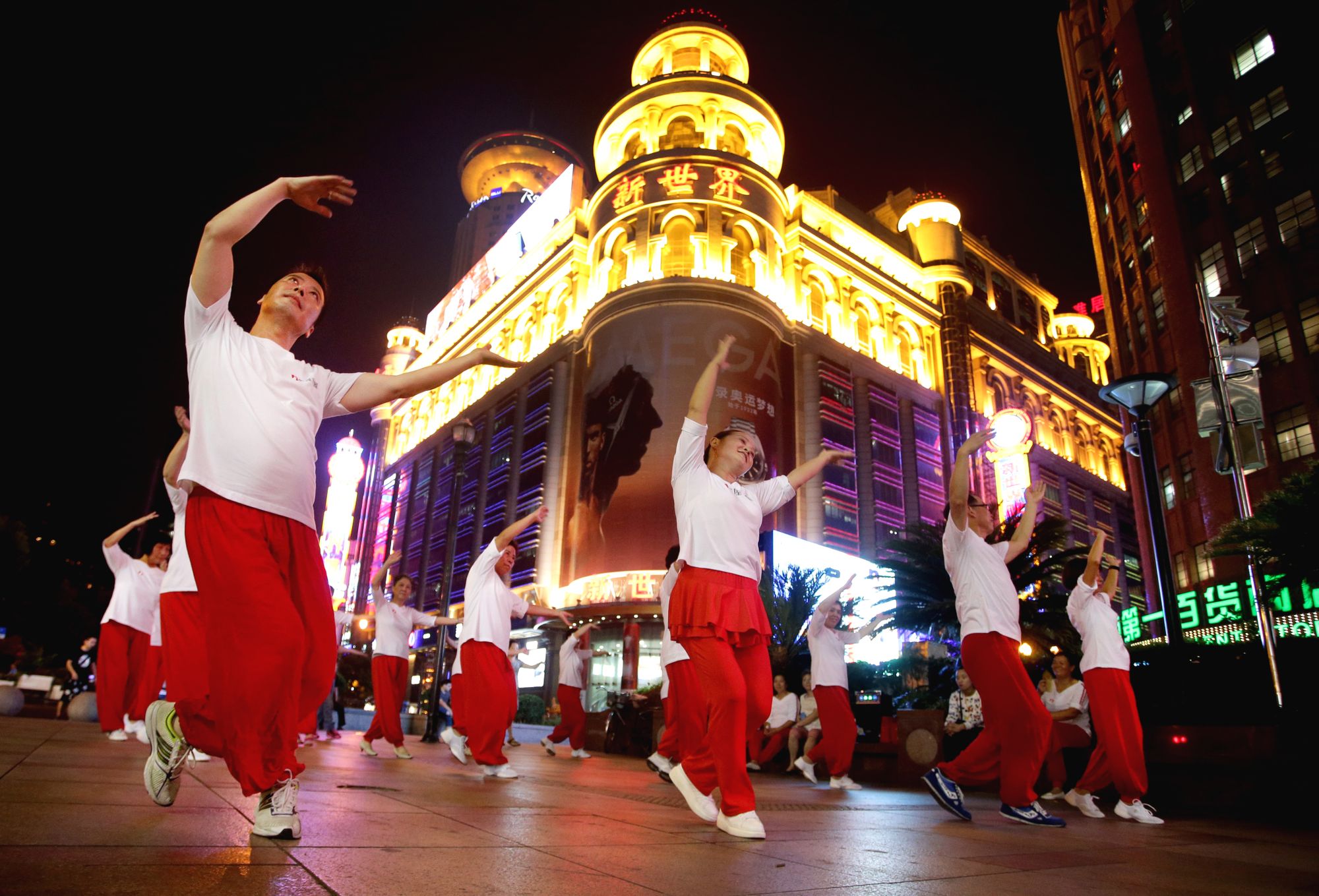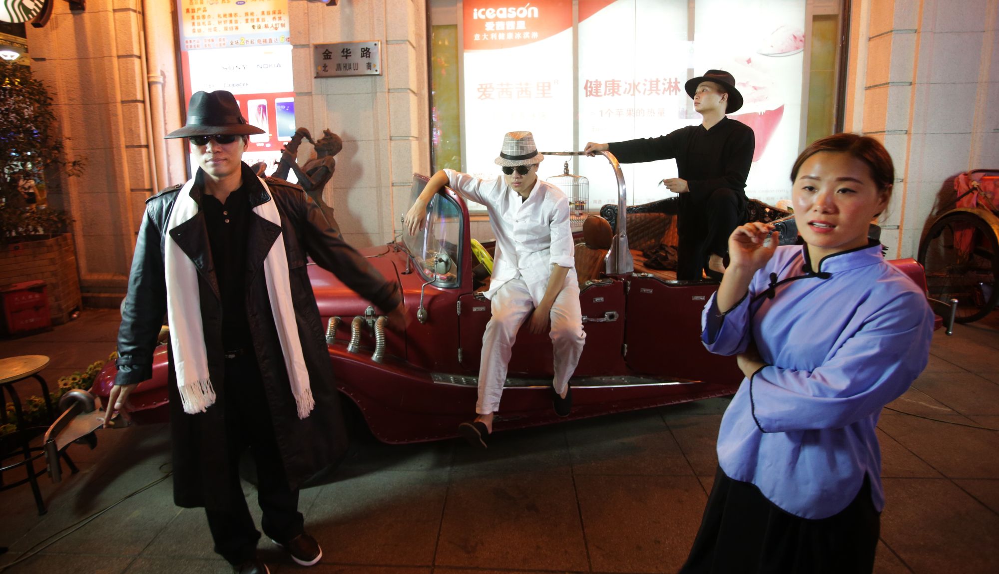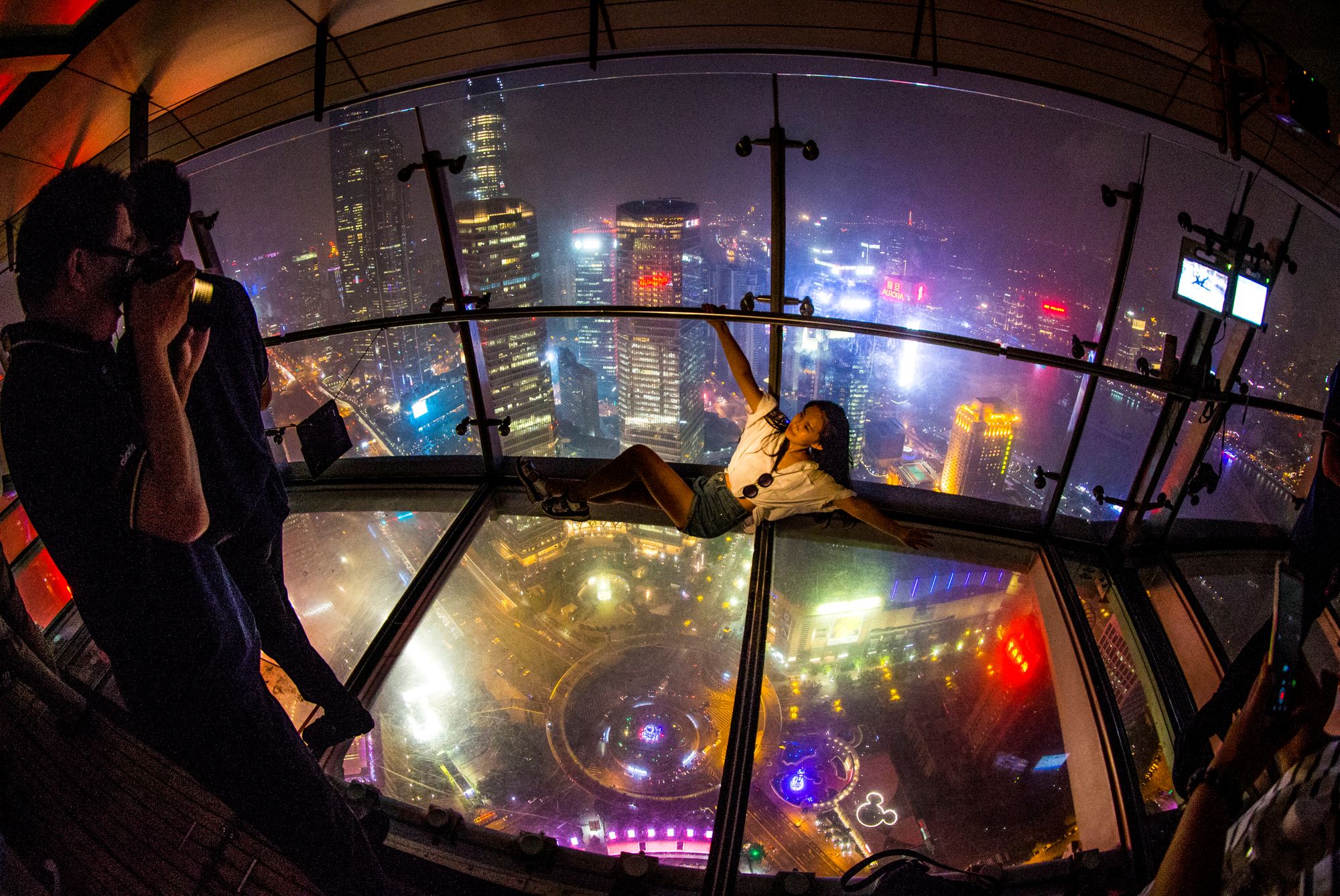 Chinese NBA basketball star Yao Ming advertisement | dancer on Nanjing Road | Shanghai People's Heroes Memorial Tower | Bride and groom on The Bund | View from the Xinmin Evening News building | Actors depicting Shanghai's gangster era on Nanjing Road