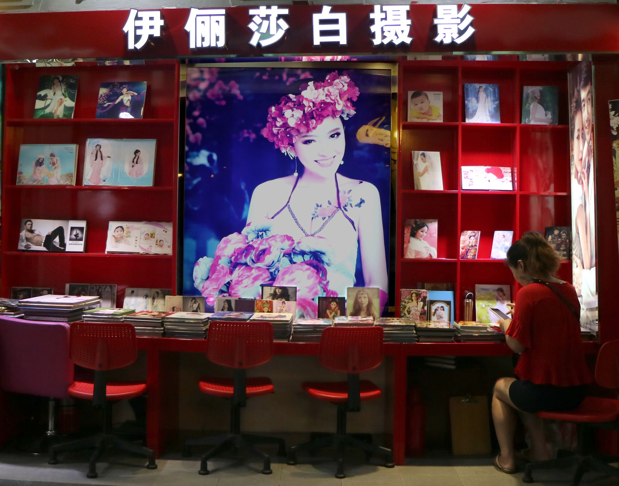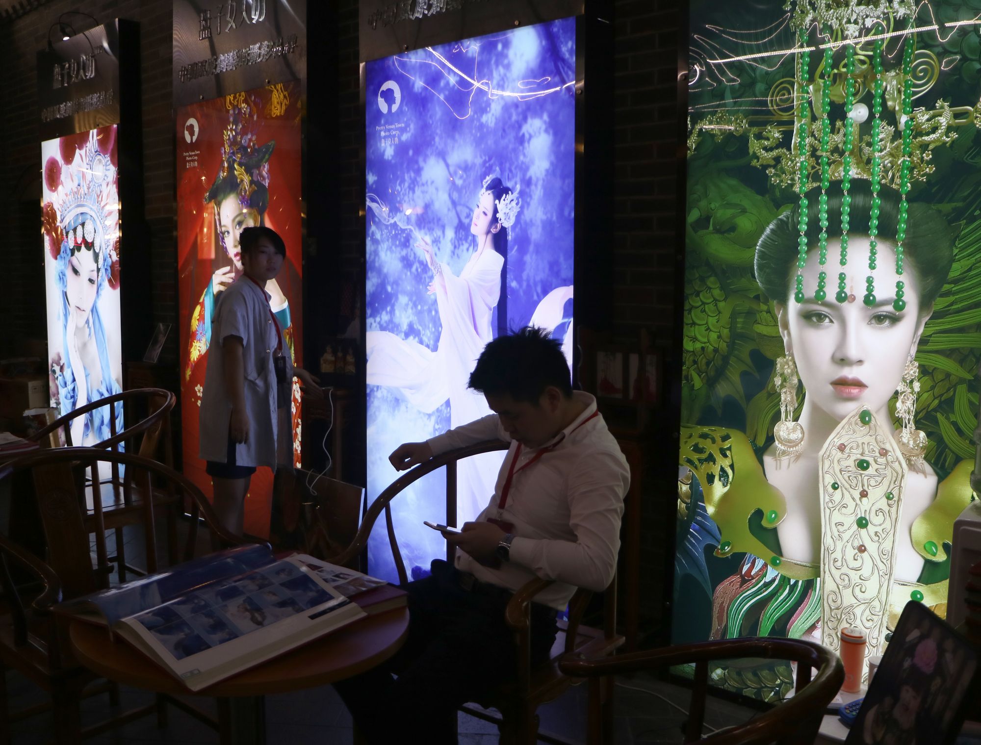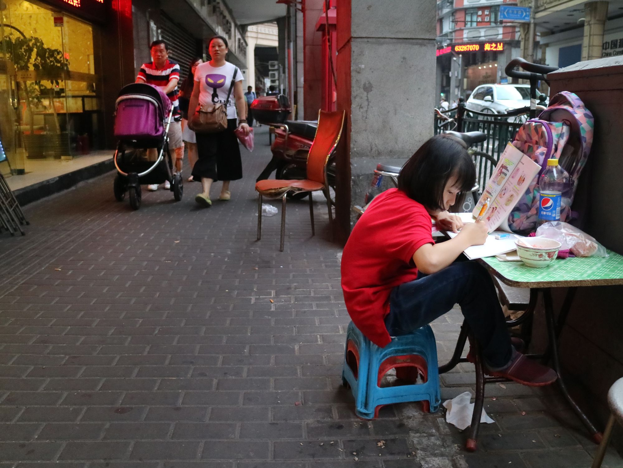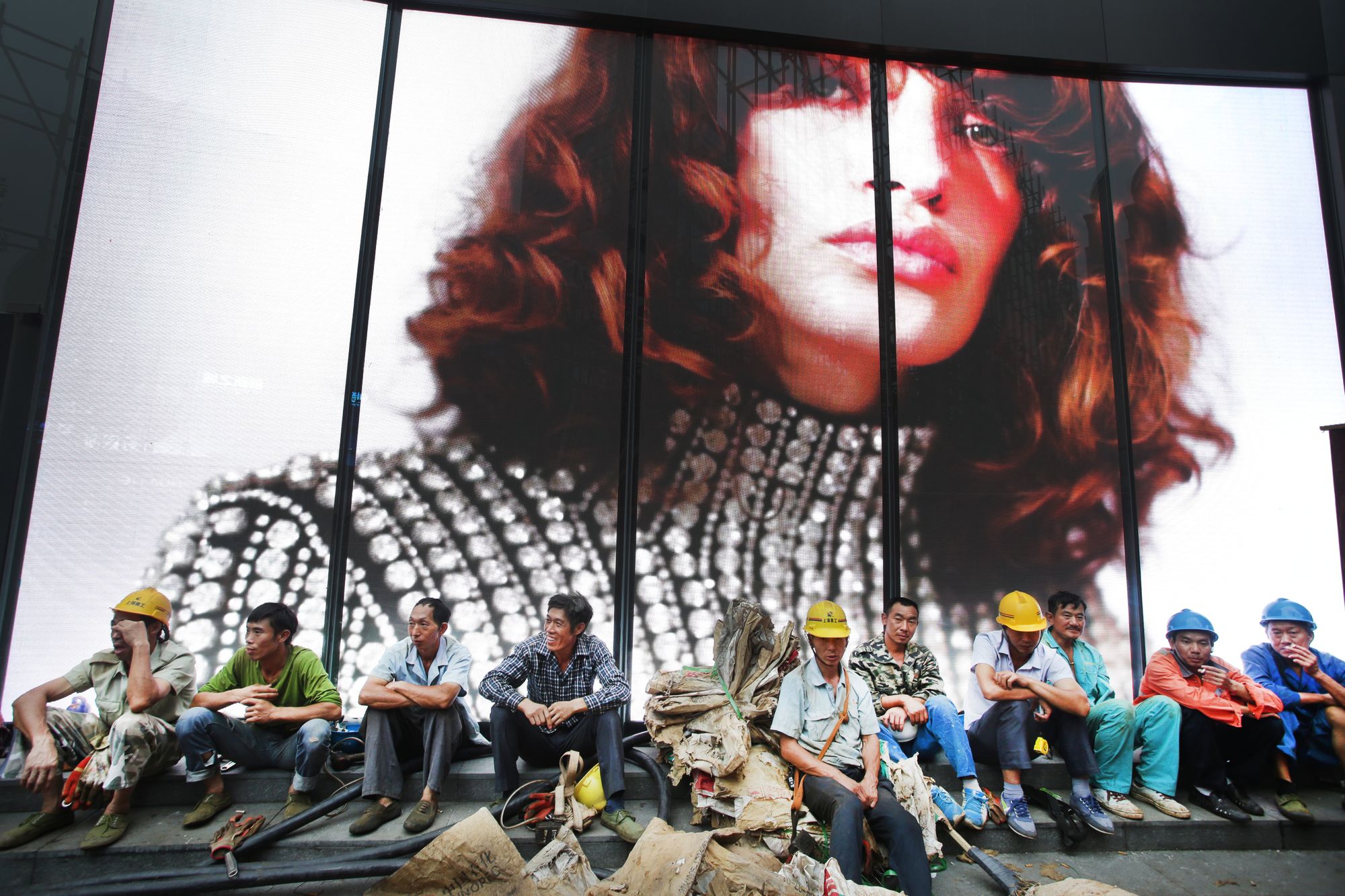 Our first full day of photographing took us to around town and gave us an idea of what Shanghai was all about. We went to the Shanghai Urban Planning Exhibition Center which had an amazing 360 degree movie presentation which was like an amusement ride | We flew through the air banking around buildings with the platform actually tilting. Among our other stops was Huaihai Road where I took two of my favorite pix | construction workers under a giant video mural that depicted high fashion models and a girl doing her homework outside her parents shop