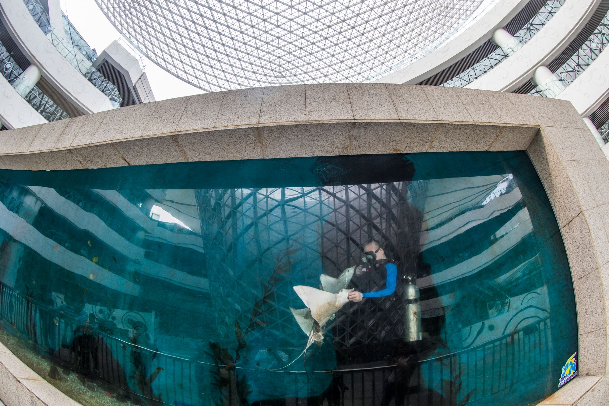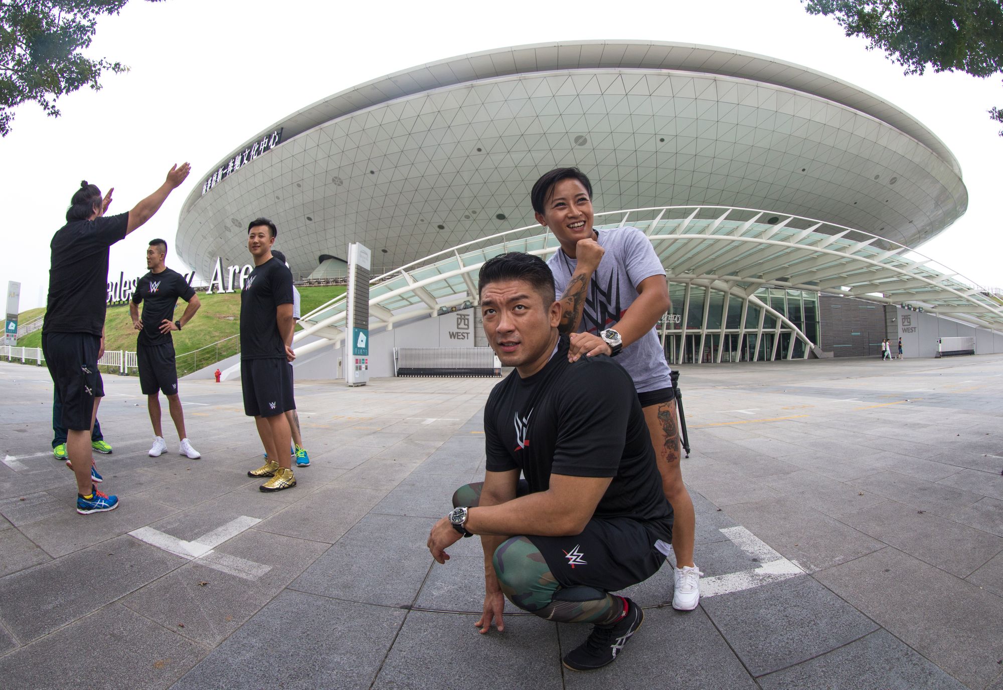 Pudong Expo Park was a giant multilevel mall complex that was almost deserted. It was full of strange things | an Eiffel Tower made of fruit | golfing figures outside a gold themed restaurant | huge hedges shaped into spooky figures | a wall menu 20 feet high | black swans | a giant aquarium with manta rays. I was on my own this time and wandered down to the river and over to the flying saucer shaped Mercedes Benz Arena where I came across a group of black t-shirt uniformed people who turned out to be professional wrestlers who were checking out the venue where they were to give an exhibition match. For some reason, one of the wrestlers was getting a shoulder massage.