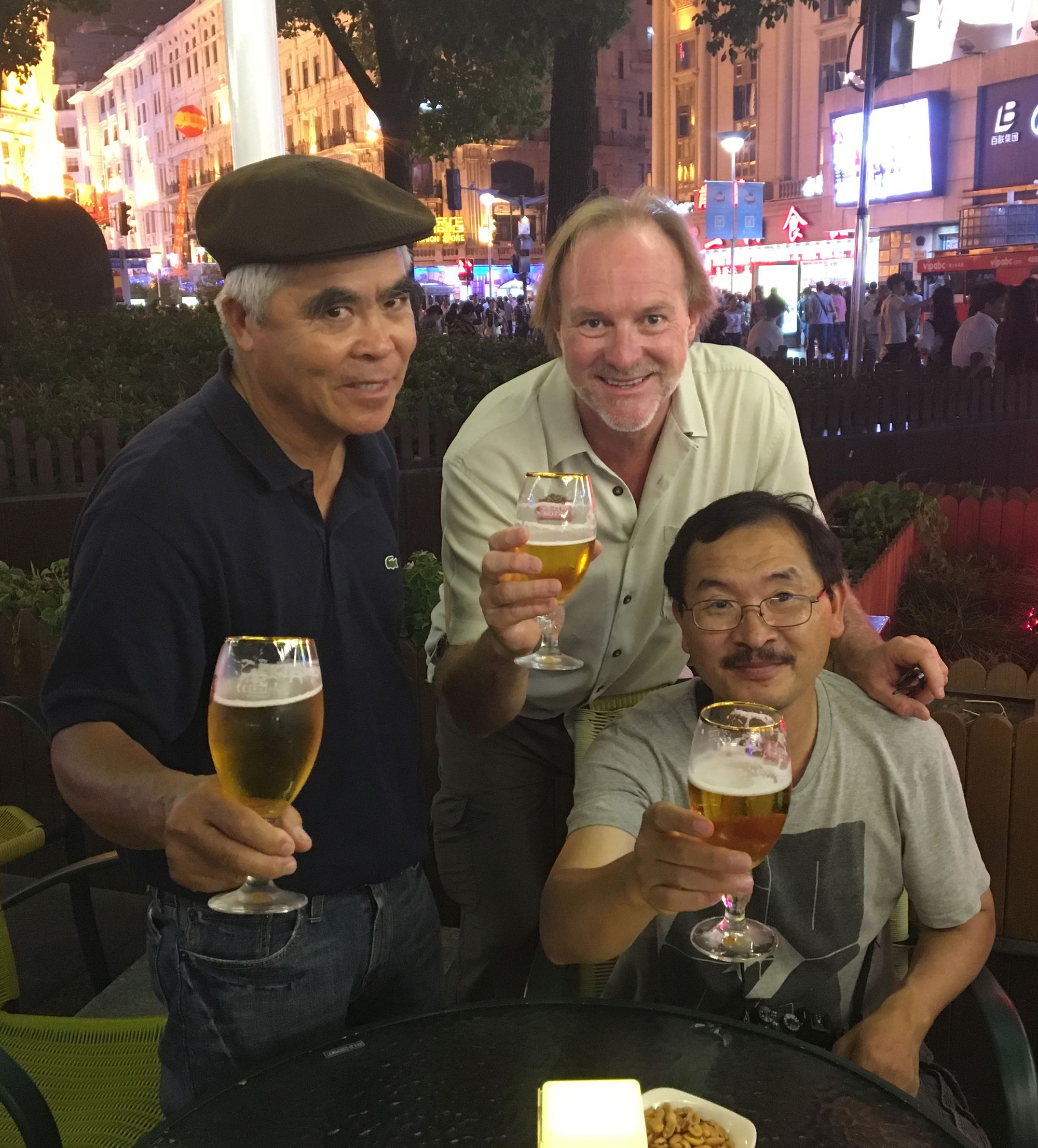 Some of our meals | Nick Ut, Ringo Chiu and I toast a friend at our favorite outdoor go-to bar and restaurant on Nanjing Road