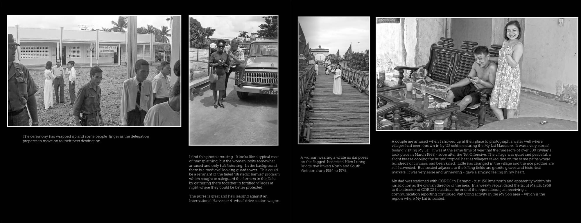 A woman wearing a white ao dai poses on the flagged-bedecked Hien Luong Bridge that linked North and South Vietnam from 1954 to 1975. A couple are amused when I showed up at their place to photograph a water well where villages had been thrown in by US soldiers during the My Lai Massacre. It was a very surreal