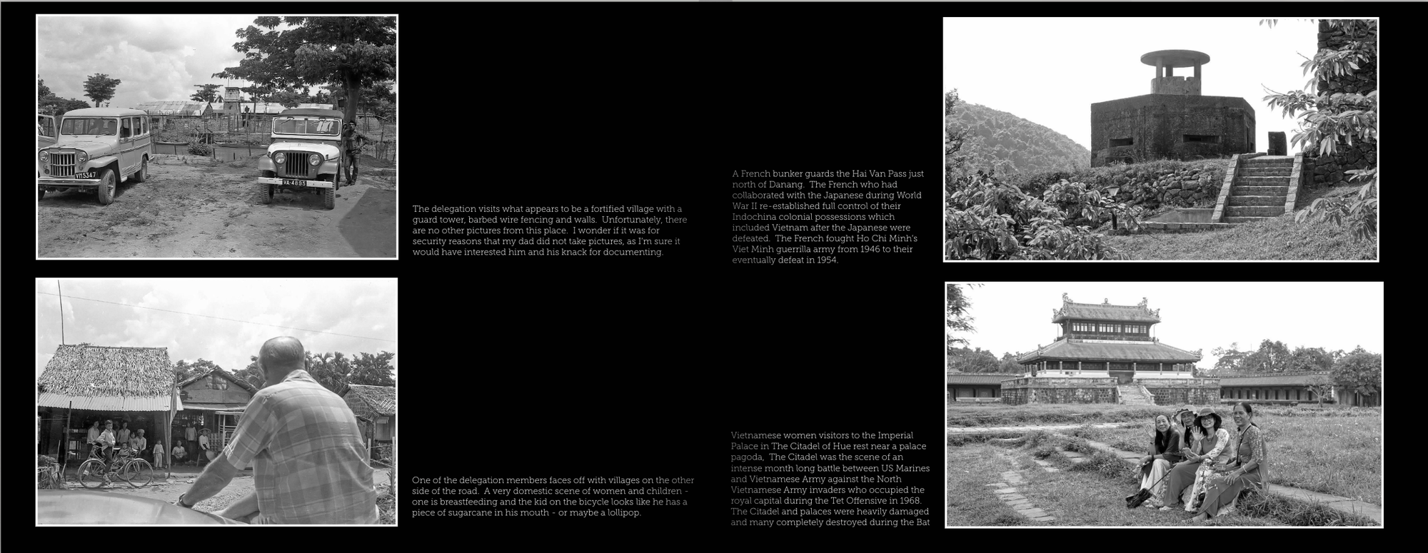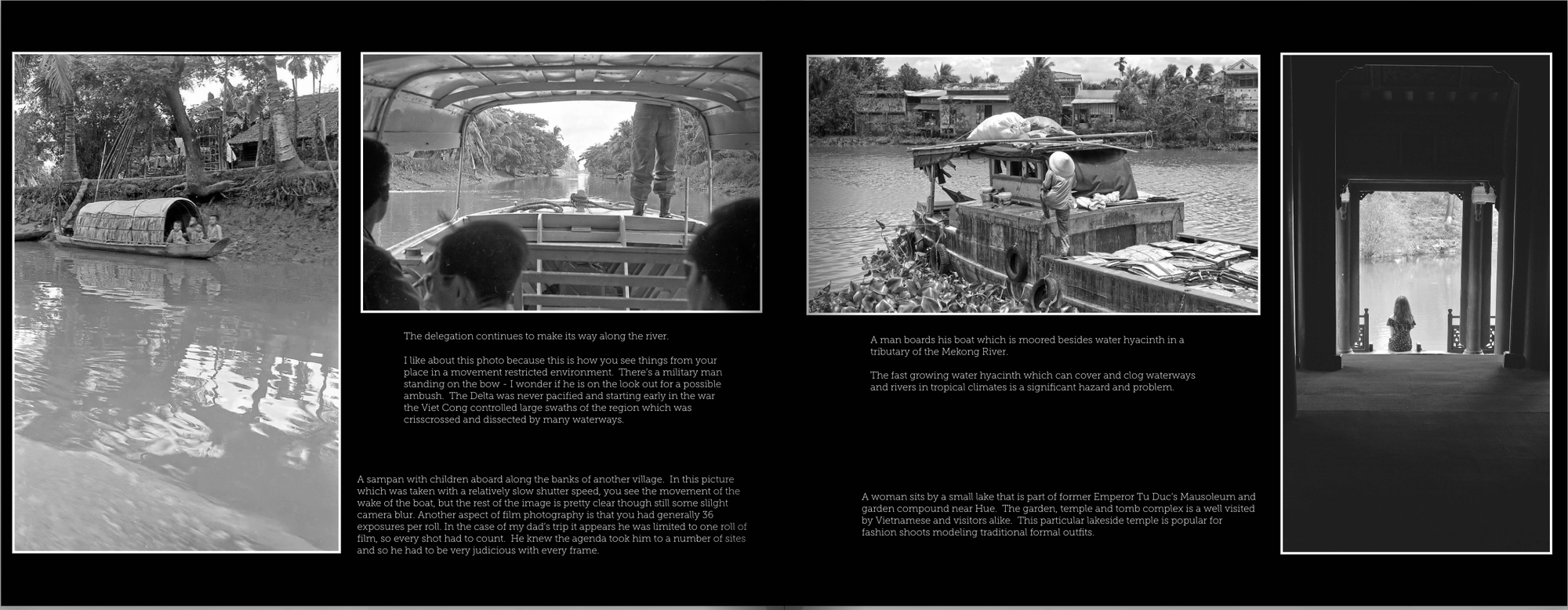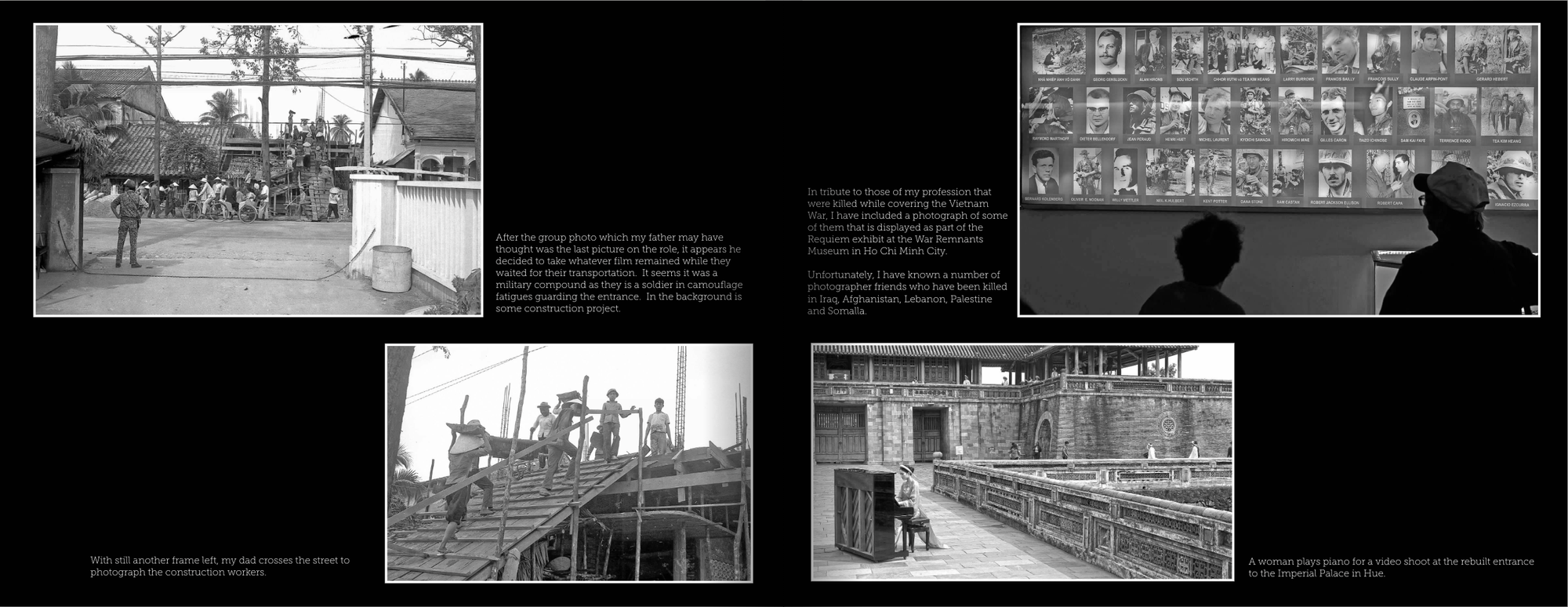 As for my pictures, I used a Fujifilm xPro2 set on black & white with a 50mm lens - probably similar to the lens on my father’s camera. I started taking B/W photos when I arrived in Hue from Hanoi and basically just shot a frame here and there. The presentation of my images - a similar number to my father - will not