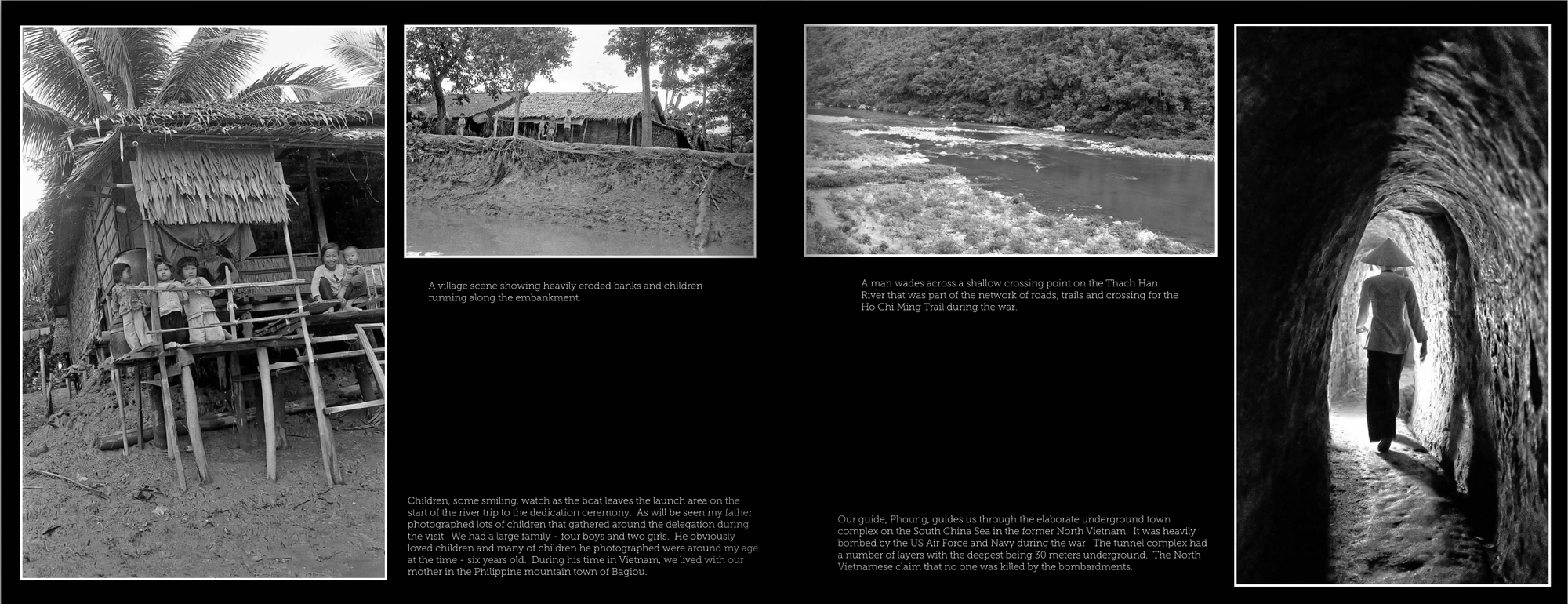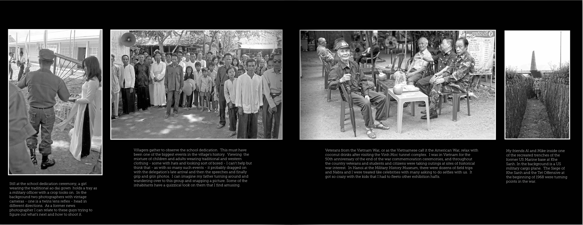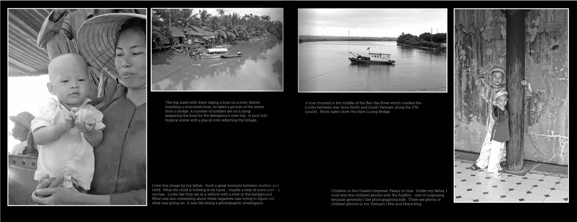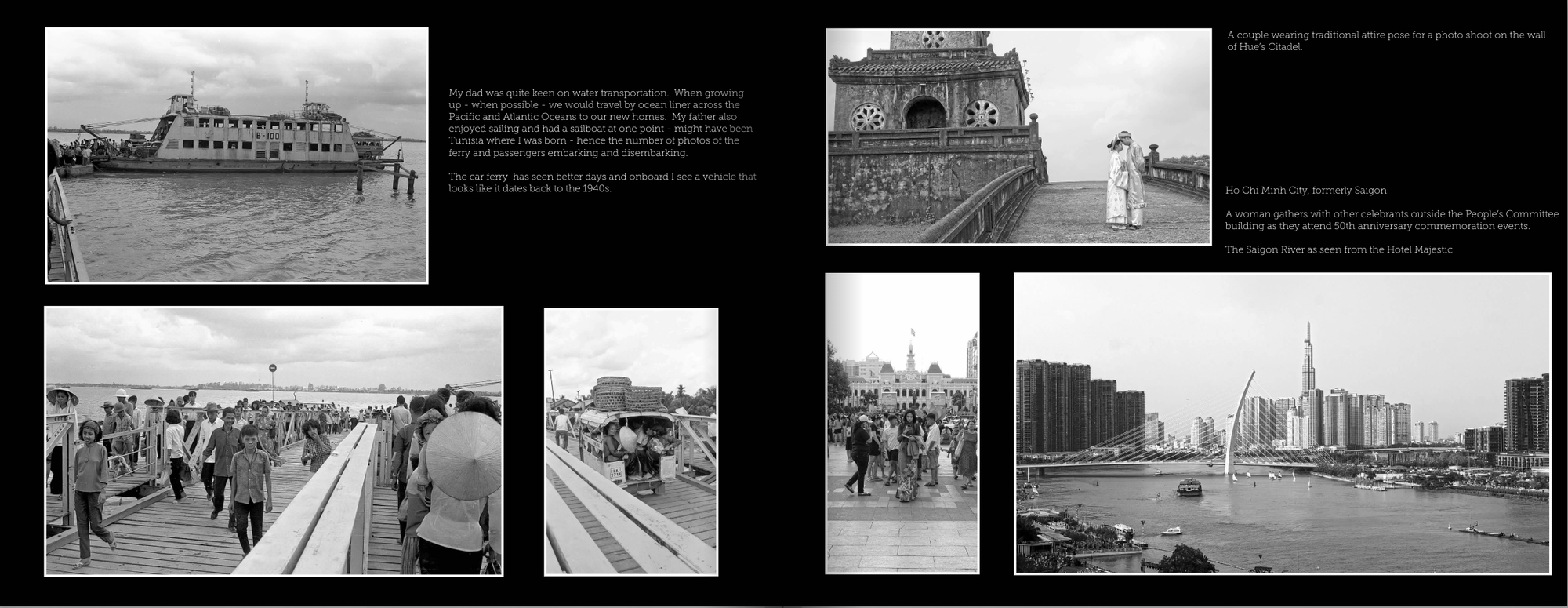 As for my pictures, I used a Fujifilm xPro2 set on black & white with a 50mm lens - probably similar to the lens on my father’s camera. I started taking B/W photos when I arrived in Hue from Hanoi and basically just shot a frame here and there. The presentation of my images - a similar number to my father - will not