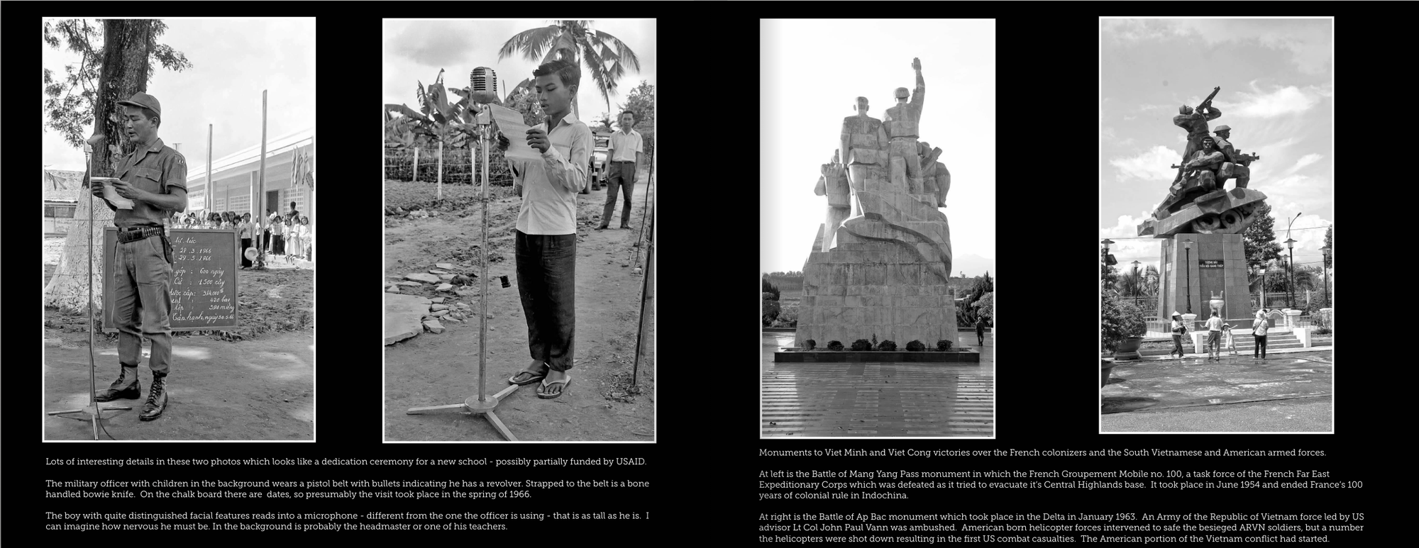 At right is the Battle of Ap Bac monument which took place in the Delta in January 1963. An Army of the Republic of Vietnam force led by US advisor Lt Col John Paul Vann was ambushed. American born helicopter forces intervened to safe the besieged ARVN soldiers, but a number the helicopters were shot down resulting in the first US combat casualties. The American portion of the Vietnam conflict had started.